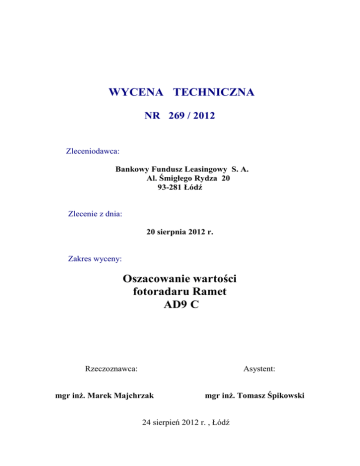 WYCENA TECHNICZNA NR 269 / 2012 Zleceniodawca: Bankowy Fundusz Leasingowy S. A. Al. Śmigłego Rydza 20 93-281 Łódź Zlecenie z dnia: 20 sierpnia 2012 r. Zakres wyceny: Oszacowanie wartości fotoradaru Ramet AD9 C Rzeczoznawca: Asystent: mgr inż. Marek Majchrzak mgr inż. Tomasz Śpikowski 24 sierpień 2012 r. , Łódź SPIS TREŚCI 1. Zleceniodawca 2. Przedmiot zlecenia 3. Cel opracowania 4. Podstawa metodologiczna oszacowania 5. Opis przedmiotu oszacowania 6. Opis stanu technicznego przedmiotu oszacowania 7. Oszacowanie wartości fotoradaru Ramet AD9 C 8. Uwagi końcowe i zastrzeżenia 9. Dokumentacja zdjęciowa 2 1. Zleceniodawca Bankowy Fundusz Leasingowy S. A. Al. Śmigłego Rydza 20 93-281 Łódź 2. Przedmiot zlecenia Przedmiotem opracowania jest fotoradar Ramet AD9 C, wyprodukowany przez: Ramet C.H.M. a. s., Czechy. Urządzenie zostało zamontowane w 2008 roku w pojeździe: Skoda Octavia, o numerze VIN: TMBKE61Z488013339; numerze rejestracyjnym: SK4441L Uwaga! Według przedstawionej dokumentacji – Świadectwo Legalizacji Pierwotnej – Okręgowy Urząd Miar w Łodzi - szacowany fotoradar Ramet AD9 C, wyprodukowano w 2007 r. Do wyceny przyjęto, że rokiem produkcji szacowanego fotoradaru Ramet AD9 C jest rok 2007 , a rokiem montażu w pojeździe jest 2008 r. – data pierwszej rejestracji pojazdu . Fotoradar Ramet AD9 C składa się z następujących urządzeń: Jednostki sterującej, typ: AD 9/RP; n/s: 07/0259; wraz ze wspornikami mocującymi oraz akumulatorem Centra CA640 12V, 64Ah, 640A. Kamera, typ: AD 9C/VK; n/s: 07/0299; wraz z walizką w której dodatkowo znajdują się: wsporniki mocujące kamerę; filtr polaryzacyjny; filtr pryzmatyczny; przewody elektryczne, połączeniowe; ładowarka samochodowa 12V; tablet Fujitsu Siemens Stylistic ST5031 WB1; s/n: YKDX002371; zasilacz Fujitsu Siemens FPCAC45B, p/n: CP268386-01. Ładowarka sieciowa, s/n: 06/0037. Wspornik mocujący kamerę w tylnej części pojazdu. Symulator wysokich częstotliwości SDF – 4; s/n: 09/0075. Głowica pomiarowa przednia. Głowica pomiarowa tylna. Antena wewnątrz pojazdu. Lampy halogenowe przednie – 2 sztuki. Zabudowane wewnątrz pojazdu przewody elektryczne. 3 3. Cel opracowania Celem opracowania jest oszacowanie wartości fotoradaru Ramet AD9 C, na zlecenie Bankowego Funduszu Leasingowego w Łodzi, zgodnie z którym oszacowanie powinno zawierać: oszacowanie wartości rynkowej fotoradaru Ramet AD9 C; dokumentacja zdjęciowa. 4. Podstawa metodologiczna oszacowania1 Aby spełnić cel i przeznaczenie oszacowania, określone potrzebą Zleceniodawcy, należy ustalić następujące wartości przedmiotów oszacowania: Wartość rynkowa – jest definiowana, jako ilość pieniędzy, którą chętny kupujący będzie skłonny zaoferować chętnemu sprzedającemu w zamian za przedmiot transakcji, przy założeniu równości stron, bez istnienia przymusu wpływającego na decyzję o zakupie i sprzedaży, przy pełnej znajomości przedmiotu i okoliczności transakcji, oraz przy zachowaniu odpowiednio długiego czasu wyeksponowania przedmiotu sprzedaży na wolnym rynku. Powyższa wartość uwzględnia między innymi wytwórcę, kompletność, stan techniczny, nowoczesność konstrukcji i wiek urządzenia, okres i sposób eksploatacji, a także warunki popytu i podaży odzwierciedlone ofertami, poszczególnych pozycji wyceny, na rynku pierwotnym lub wtórnym. Wartość likwidacyjna przy sprzedaży wymuszonej - jest to przewidywana cena, która może być uzyskana ze sprzedaży wyposażenia lub urządzenia, na prawidłowo ogłoszonym i przeprowadzonym przetargu publicznym, aukcji lub licytacji, przy konieczności bezzwłocznej sprzedaży i przy założeniu, że sprzedawca jest zmuszony do transakcji poprzez okoliczności, zaś wyposażenie lub urządzenie sprzedaje się w takim stanie i w takim miejscu, w jakim aktualnie się znajduje. Wycenę wykonano stosując podejście kosztowe. Podejście kosztowe oparte jest na założeniu, że świadomy tzn. poinformowany i zorientowany w warunkach rynkowych nabywca nie zapłaci więcej za wyposażenie lub urządzenie niż koszt wytworzenia urządzenia nowego, o tej samej użyteczności jak wyceniane. Wartość rynkowa w podejściu kosztowym jest równa kosztowi zastąpienia nowego urządzenia, pomniejszonemu o ubytki wartości z przyczyn fizycznych, przyczyn funkcjonalnych oraz przyczyn ekonomicznych. Ubytek wartości z przyczyn fizycznych – jest to ubytek wartości lub użyteczności, którego przyczyną są zjawiska fizyczne związane z tarciem i 1 Na podstawie wydawnictwa „Podstawy wyceny wartości środków technicznych „Tadeusz Klimek – Wydawnictwo BOMIS Press – Poznań 2003 r. 4 zużyciem, a także z upływem czasu i kompletnością. Wielkość zużycia fizycznego determinuje stan techniczny urządzenia lub wyposażenia. Utrata wartości z przyczyn fizycznych ma najczęściej dwa składniki. Pierwszy z nich jest stosunkiem efektywnego czasu użytkowania do średniej żywotności, a drugi wynika z braków, niekompletności i/ lub nieusuniętych skutków awarii. Ubytek wartości z przyczyn funkcjonalnych – jest to ubytek wartości, którego przyczyna tkwi we właściwościach urządzenia lub wyposażenia. Jest spowodowana zużyciem funkcjonalnym i pogorszeniem efektywności działania, co zawsze jest następstwem zmian konstrukcyjnych i tworzyw. Przejawia się np. w braku przydatności do działania, nadmiernej lub niedostatecznej wydajności, zbytniej energochłonności, w przewymiarowaniu, w braku zastosowania wytworów, które produkuje lub usług, które wykonuje, w nadmiernych kosztach eksploatacji, w zbyt niskiej sprawności, poprzez wprowadzenie nowej generacji rozwiązań, itd. Bywa nazywana ubytkiem wartości z przyczyn wewnętrznych, bo niejako tkwi „ wewnątrz” urządzenia lub wyposażenia. Ubytek wartości z przyczyn ekonomicznych tkwi na „zewnątrz„ wyposażenia lub urządzenia, tzn. wynika z konkurencyjności danego wyposażenia