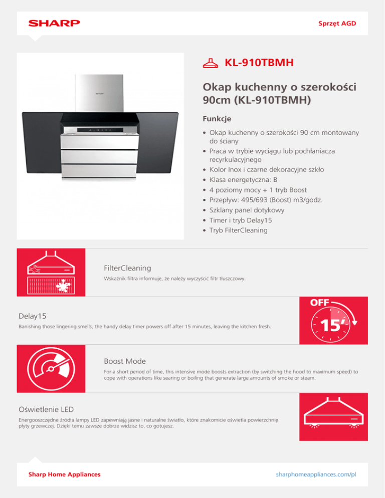 Sprzęt AGD KL-910TBMH Okap kuchenny o szerokości 90cm (KL-910TBMH) Funkcje Okap kuchenny o szerokości 90 cm montowany do ściany Praca w trybie wyciągu lub pochłaniacza recyrkulacyjnego Kolor Inox i czarne dekoracyjne szkło Klasa energetyczna: B 4 poziomy mocy + 1 tryb Boost Przepływ: 495/693 (Boost) m3/godz. Szklany panel dotykowy Timer i tryb Delay15 Tryb FilterCleaning FilterCleaning Wskaźnik filtra informuje, że należy wyczyścić filtr tłuszczowy. Delay15 Banishing those lingering smells, the handy delay timer powers off after 15 minutes, leaving the kitchen fresh. Boost Mode For a short period of time, this intensive mode boosts extraction (by switching the hood to maximum speed) to cope with operations like searing or boiling that generate large amounts of smoke or steam. Oświetlenie LED Energooszczędne źródła lampy LED zapewniają jasne i naturalne światło, które znakomicie oświetla powierzchnię płyty grzewczej. Dzięki temu zawsze dobrze widzisz to, co gotujesz. Sharp Home Appliances sharphomeappliances.com/pl Sprzęt AGD Kluczowe cechy Typ okapu Montowany na ścianie Klasa sprawności energetycznej B Tryb pracy Tryb ekstrakcyjny Klasa sprawności filtrowania tłuszczu D Możliwość pracy w trybie recyrkulacyjnym Tak Typ sterowania Pola dotykowe na szklanym panelu Szerokość (cm) 90cm Kolorowy wyświetlacz LCD Nie Gwarancja (w latach) Dwa lata na części i robociznę Poziom hałasu przy pracy w trybie Boost (dB(A)) 69 Sygnalizacja konieczności oczyszczenia filtra Tak Timer + automatyczny wyłącznik po 15 min Tak Czujnik pary (SteamSensor) Nie Czujnik ruchu (MotionSensor) Nie Czujnik nocy (NightSensor) Nie Klasa efektywności energetycznej B Functions Poziomy mocy + tryb Boost 4+1 Przepływ powietrza, poziom 4 / tryb Boost (m³/godz.) 495 / 693 Poziom hałasu przy pracy na poziomie 1 (dB(A)) 52.6 Poziom hałasu przy pracy na poziomie 2 (dB(A)) 52.8 Poziom hałasu przy pracy na poziomie 3 (dB(A)) 59.9 Poziom hałasu przy pracy na poziomie 4 (dB(A)) Sharp Home Appliances 63.5 sharphomeappliances.com/pl Sprzęt AGD Mocy, zużycia i napięcia Całkowita moc (kW) 275 Napięcie (V) / częstotliwość (Hz) 220-240V / 50Hz Roczne zużycie energii (kWh/rok) 77 Bezpiecznik źródła zasilania/wyłącznik obwodu (A) 16 Masa, kg (netto) 19.2 Masa, kg (brutto) 24.7 Wymiary i waga Wymiary okapu, sz. x w. x g. (mm) Wymiary opakowania (sz. x w. x g.) mm 898 x min.660-max.1040 x 496 980 x 545 x 555 Wyposażenie Oświetlenie okapu Lampa LED 150-120 mm (z przejściówką) Tak Filtr tłuszczu (liczba) 1 Zawór bezzwrotny Tak Filtr tłuszczu zmywalny w zmywarce Tak Przewód zasilający (m) Tak (2 m) Średnica kanału odprowadzającego (mm) 150 European article number Kod EAN Sharp Home Appliances Powered by TCPDF (www.tcpdf.org) 4974019882970 sharphomeappliances.com/pl