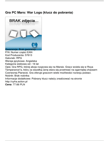 Gra PC Mars: War Logs (klucz do pobrania) Gwarancja: Brak gwarancji P/N: Numer części EAN Kod Producenta: 57613 Gatunek: RPG Wersja językowa: Angielska Kategoria wiekowa od:: 16 lat Opis: Gra RPG, której akcja rozgrywa się na Marsie. Gracz wciela się w Roya Temperance"a, który za wszelką cenę stara się przetrwać na ogarniętej chaosem Czerwonej Planecie. Gra oferuje graczom wiele możliwości rozwoju postaci. Nośnik: Brak nośnika Informacje dodatkowe: Pobrany klucz należy zrealizować na stronie http://cyfra.action.pl Cena: 77.66 PLN Powered by TCPDF (www.tcpdf.org)