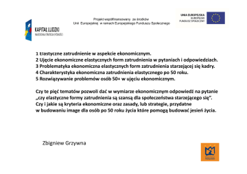 Projekt współfinansowany ze środków Unii Europejskiej w ramach Europejskiego Funduszu Społecznego 1 Elastyczne zatrudnienie w aspekcie ekonomicznym. 2 Ujęcie ekonomiczne elastycznych form zatrudnienia w pytaniach i odpowiedziach. 3 Problematyka ekonomiczna elastycznych form zatrudnienia starzejącej się kadry. 4 Charakterystyka ekonomiczna zatrudnienia elastycznego po 50 roku. 5 Rozwiązywanie problemów osób 50+ w ujęciu ekonomicznym. Czy te pięć tematów pozwoli dać w wymiarze ekonomicznym odpowiedź na pytanie „czy elastyczne formy zatrudnienia są szansą dla społeczeństwa starzejącego się”. Czy i jakie są kryteria ekonomiczne oraz zasady, lub strategie, przydatne w budowaniu image dla osób po 50 roku życia które pomogą budować jesień życia. Zbigniew Grzywna Projekt współfinansowany ze środków Unii Europejskiej w ramach Europejskiego Funduszu Społecznego Elastyczne zatrudnienie w aspekcie ekonomicznym 1. Zastosowanie elastycznych form zatrudnienia szansą na zmiany ekonomiczne - lepszy byt a zarazem życie. 2. Korzyści ekonomiczne płynące z elastycznych form zatrudnienia dla osób 50+ zwiększanie aktywności zawodowej. 3. Działania promocyjne i ułatwienia dla firm oraz pracodawców w elastycznych formach zatrudniania. Projekt współfinansowany ze środków Unii Europejskiej w ramach Europejskiego Funduszu Społecznego Ujęcie ekonomiczne elastycznych form zatrudnienia w pytaniach i odpowiedziach 1. Czy dzięki elastycznym formom zatrudnienia można znaleźć bądź wskazać sposoby pogodzenia zajęć pracownika z innymi rolami pozazawodowymi w woj. Małopolskim. 2. Czy i jaka jest rola i miejsce osób w wieku 50+ oraz ich zainteresowanie elastycznymi formami zatrudnienia. 3. Aspekt ekonomiczny, prawo rynku i czynniki determinujące zadowolenie lub niezadowolenie z pracy. 4. Obraz problemów wynikających z analizy odpowiedzi na temat relacji pomiędzy pracownikami elastycznymi a przełożonymi oraz współpracownikami zatrudnionymi na umowę o pracę w oparciu o tradycyjną formę prawną oraz problemy i sposoby ich rozwiązywania. Projekt współfinansowany ze środków Unii Europejskiej w ramach Europejskiego Funduszu Społecznego Problematyka ekonomiczna elastycznych form zatrudnienia starzejącej się kadry 1. Elastyczne formy zatrudnienia sposobem pogodzenia zajęć pracownika z innymi rolami pozazawodowymi w woj. Małopolskim. 2. Rola i miejsce osób w wieku 50+ oraz ich zainteresowanie takimi formami zatrudnienia. 3. Obniżenie siły nabywczej rent, emerytur oraz wynagrodzeń i elastyczne formy zatrudnienia na małopolskim rynku pracy szansą dla społeczeństwa starzejącego się a jednocześnie chcącego żyć lepiej. 4. Branże uznane za strategiczne, dla małopolskiej gospodarki w których nadal brak większych zmian w zatrudnieniu i wykorzystaniu „elastycznych i 50 +” Projekt współfinansowany ze środków Unii Europejskiej w ramach Europejskiego Funduszu Społecznego Charakterystyka ekonomiczna zatrudnienia elastycznego osób po 50 roku życia 1. Bezpośrednie cele integracji, standardy szkoleń dla osób 50+ . 2. Korzyści finansowe, z zatrudnienia osób w omawianym wieku. 3. Wykorzystywanie potencjału wiedzy i umiejętności osób po pięćdziesiątym roku życia. Projekt współfinansowany ze środków Unii Europejskiej w ramach Europejskiego Funduszu Społecznego Rozwiązywanie problemów osób 50+ w ujęciu ekonomicznym 1. Próby ustalenia czy dzięki elastycznym formom zatrudnienia można znaleźć bądź wskazać sposoby pogodzenia zajęć pracownika z innymi rolami pozazawodowymi w woj. Małopolskim. 2. Rola i miejsce osób w wieku 50+ oraz ich zainteresowanie takimi formami zatrudnienia uwypuklenie aspektu ekonomicznego wraz z opisem czynników determinujących zadowolenie lub niezadowolenie z pracy. Projekt współfinansowany ze środków Unii Europejskiej w ramach Europejskiego Funduszu Społecznego Dziękuję za uwagę! Zbigniew Grzywna