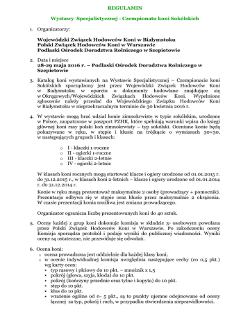 REGULAMIN Wystawy Specjalistycznej - Czempionatu koni Sokólskich 1. Organizatorzy: Wojewódzki Związek Hodowców Koni w Białymstoku Polski Związek Hodowców Koni w Warszawie Podlaski Ośrodek Doradztwa Rolniczego w Szepietowie 2. Data i miejsce 28-29 maja 2016 r. – Podlaski Ośrodek Doradztwa Rolniczego w Szepietowie 3. Katalog koni wystawianych na Wystawie Specjalistycznej – Czempionacie koni Sokólskich sporządzony jest przez Wojewódzki Związek Hodowców Koni w Białymstoku w oparciu o dokumenty hodowlane znajdujące się w Okręgowych/Wojewódzkich Związkach Hodowców Koni. Wypełnione zgłoszenie należy przesłać do Wojewódzkiego Związku Hodowców Koni w Białymstoku w nieprzekraczalnym terminie do 30 kwietnia 2016 r. 4. W wystawie mogą brać udział konie zimnokrwiste w typie sokólskim, urodzone w Polsce, zaopatrzone w paszport PZHK, które spełniają warunki wpisu do księgi głównej koni rasy polski koń zimnokrwisty – typ sokólski. Oceniane konie będą pokazywane w ręku, w stępie i kłusie na trójkącie o wymiarach 30×30, w następujących grupach i klasach: o o o o I - klaczki 1-roczne II - ogierki 1-roczne III - klaczki 2-letnie IV - ogierki 2-letnie W klasach koni rocznych mogą startować klacze i ogiery urodzone od 01.01.2015 r. do 31.12.2015 r., w klasach koni 2-letnich – klacze i ogiery urodzone od 01.01.2014 r. do 31.12.2014 r. Konie w ręku mogą prezentować maksymalnie 2 osoby (prowadzący + pomocnik). Prezentacja odbywa się w stępie oraz kłusie przez maksymalnie 2 okrążenia. W czasie prezentacji konia możliwa jest zmiana prowadzącego. Organizator ogranicza liczbę prezentowanych koni do 40 sztuk. 5. Oceny każdej z grup koni dokonuje komisja w składzie 3- osobowym powołana przez Polski Związek Hodowców Koni w Warszawie. Po zakończeniu oceny Komisja sporządza protokół i podaje wyniki do publicznej wiadomości. Wyniki oceny są ostateczne, nie przewiduje się odwołań. 6. Ocena koni: o ocena prowadzona jest oddzielnie dla każdej klasy koni; o w ocenie indywidualnej komisja uwzględnia następujące cechy (co 0,5 pkt.) wg karty ocen: typ rasowy i płciowy do 10 pkt. – mnożnik x 1,5 pokrój (głowa, szyja, kłoda) do 10 pkt. pokrój (kończyny przednie oraz tylne i kopyta) do 10 pkt. stęp do 10 pkt. kłus do 10 pkt. wrażenie ogólne od 0- 5 pkt., są to punkty ujemne odejmowane od oceny łącznej za typ, pokrój i ruch, w przypadku stwierdzenia nieprawidłowości. W elemencie „wrażenie ogólne” będą brane pod uwagę: a/ pielęgnacja (czystość sierści i ogona, stan grzywy, korekcja kopyt), b/ kondycja (otłuszczenie, słaba kondycja, zarobaczenie), c/ limfatyczność (opoje, wypryski, suchość stawów),nakostniaki d/ przygotowanie konia do prezentacji w ręku, współpraca konia z prezenterem Skala ocen: za typ, pokrój (głowa, szyja, kłoda), pokrój (kończyny, kopyta), stęp, kłus. 10 pkt. - doskonała 5 pkt. – mierna 9 pkt. - bardzo dobra 4 pkt. - niedostateczna 8 pkt. – dobra 3 pkt. - prawie zła 7 pkt. - zadawalająca 2 pkt. – zła 6 pkt. - dostateczna 1 pkt. - bardzo zła Punkty ujemne za wrażenie ogólne: 4-5 pkt ocena niedostateczna 2-3 pkt ocena zadawalająca 0-1 pkt ocena dobra 7. Oceny koni dokonuje komisja w składzie 3 osobowym: Wiesław Niewiński, Jerzy Gawarecki i Jacek Kozik powołana przez Polski Związek Hodowców Koni w Warszawie. Przy ocenie komisja posługuje się kartami oceny, które wypełnia dla każdego zaprezentowanego konia. Ocena jest jedna wspólna z komentarzem dla każdego konia. Po wypełnieniu i podpisaniu kart oceny komisja sporządza na ich podstawie protokół i podaje wyniki do publicznej wiadomości. Wyniki oceny są ostateczne, nie przewiduje się odwołań. Karty oceny są załącznikiem do protokołu. 8. Komisja wybiera czempiona i wiceczempiona każdej klasy pod warunkiem oceny co najmniej 5 koni w klasie. W przypadku mniejszej liczby koni, ale nie mniejszej niż 3, Komisja wybiera tylko czempiona klasy. W poszczególnych klasach czempiona i wiceczempiona wybiera się spośród trzech najwyżej ocenionych koni, bez poprawiania ich wcześniejszej oceny oraz bez względu na różnicę punktów pomiędzy 3 najlepszymi końmi. Przy wyborze czempiona Komisja bierze pod uwagę przede wszystkim typ rasowy i płciowy oraz budowę kłody. 9. Do wyboru czempiona ogierów kwalifikują się ogiery, które zajęły I i II miejsce w klasach II i IV. Spośród czempionów tych klas wybierany jest czempion ogierów, a następnie spośród pozostałych 3 koni wybierany jest wiceczempion oraz zdobywca trzeciego i czwartego miejsca. Według identycznych zasad wybierane są czempionka i wiceczempionka klaczy (klasy I i III). Dla tak wybranych koni organizatorzy przewidują nagrody pieniężne, rzeczowe i honorowe. Hodowcy i właściciele koni, które zajęły miejsca I i II w poszczególnych klasach, a nie przystąpiły do wyboru czempiona i wiceczempiona ogierów i klaczy, nie mają prawa do nagród pieniężnych MRiRW i PZHK. W takiej sytuacji ich miejsce w rozgrywce o tytuł czempiona i wice czempiona zajmuje następny koń w klasie. 10. Konie dowiezione na Wystawę Specjalistyczną muszą być obowiązkowo zaopatrzone w paszport oraz zaczipowane (posiadać transponder), zaszczepione przeciwko grypie i posiadać świadectwo zdrowia wystawione przez odpowiednie służby weterynaryjne. 11. Konie powinny być odpowiednio wypielęgnowane (czyste, wyczesane) oraz prawidłowo okiełznane (wędzidło gładkie, jeżeli ma 2 kółka to wodze zapięte za 2 kółka, wodze skórzane lub rzemienne). 12. Wszystkich wystawców obowiązuje schludny ubiór, odpowiedni przy prezentacji koni oraz regulamin panujący na terenie PODR Szepietowo. Właściciel lub osoba przez niego upoważniona, okazująca brak szacunku względem osób oficjalnych (sędziego, lekarza wet., sekretarza, asystenta, przewodniczącego, administratorów itp.), zostanie natychmiastowo wykluczona z udziału w wystawie dec
