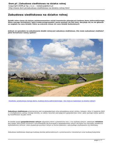 Dom.pl | Zabudowa siedliskowa na działce rolnej Copyright DOM.pl Sp. z o.o. - [email protected] http://www.dom.pl/zabudowa-siedliskowa-na-dzialce-rolnej.html Zabudowa siedliskowa na działce rolnej Działki rolne cieszą się dużym zainteresowaniem wśród inwestorów planujących budowę domu jednorodzinnego. Mimo szeregu formalności, jakie trzeba przeprowadzić zanim postawi się tam dom, decyduje się na nie głównie ze względu na ceny działek, które są znacznie niższe niż ceny działek budowlanych. Jednym ze sposobów na zabudowanie działki rolnej jest zabudowa siedliskowa. Kto może wybudować siedlisko? Jakie formalności należy spełnić? (Siedlisko, przebudowa starego domu, budowa domu jednorodzinnego - kto może je realizować na działce rolnej?) Zabudowa siedliskowa przeznaczona jest na gospodarstwo rolne prowadzone przez rolnika. Ustawa z dnia 11 kwietnia 2003 r. o kształtowaniu ustroju rolnego określa, co należy rozumieć pod pojęciem gospodarstwo rolne i jakie wymogi należy spełnić, by kwalifikować się jako rolnik. W świetle prawa gospodarstwem rolnym nazywamy teren o powierzchni min. 1 ha użytków rolnych, natomiast rolnikiem jest osoba, która przez minimum 5 lat prowadziła lub pracowała w gospodarstwie rolnym lub która ma chociażby zasadnicze wykształcenie rolnicze i która dysponuje gruntem rolnym w formie własności, wieczystego użytkowania czy dzierżawy. Zabudowa siedliskowa obejmuje budowę domów jednorodzinnych o przeznaczeniu mieszkalnym oraz budowę budynków page 1 / 7 Dom.pl | Zabudowa siedliskowa na działce rolnej Copyright DOM.pl Sp. z o.o. - [email protected] http://www.dom.pl/zabudowa-siedliskowa-na-dzialce-rolnej.html gospodarczych, jak stajnia, obora, magazyny itp. Usytuowanie obiektów budowlanych jest standardowe objęte uwarunkowaniami, wynikającymi z miejscowego planu zagospodarowania przestrzennego lub w przypadku jego braku – z decyzji o warunkach zabudowy. Uwaga! Gmina w miejscowym planie określa również minimalną powierzchnię działki, na której można budować siedlisko. Jeżeli grunt rolny jest mniejszy, rolnik nie otrzyma pozwolenia na budowę. Wiele gmin nie ma jednak uchwalonego miejscowego planu zagospodarowania przestrzennego. W tej sytuacji rolnik, chcąc wybudować siedlisko, musi wystąpić o wydanie decyzji o warunkach zabudowy. Warunki zabudowyzostaną wydane tylko wtedy, gdy: - działka rolna ma dostęp bezpośredni lub pośredni do drogi publicznej, - wydane zostaną warunki techniczne przyłączy (możliwe będzie uzbrojenie terenu), - działka rolnama tzw. „dobre sąsiedztwo”, czyli sąsiednie działki są zabudowane. Uwaga! Jeżeli działka nie ma „dobrego sąsiedztwa”, warunki zabudowy zostaną wydane tylko pod warunkiem, że wielkość gospodarstwa rolnego związanego z budową jest większa niż średnia powierzchnia gospodarstwa rolnego, którą określa w uchwale gmina. Czy osoba, która nie jest rolnikiem może wybudować siedlisko? Jeżeli dla siedliska zostały wydane warunki zabudowy i rolnik, który je uzyskał sprzeda działkę osobie, która nie jest rolnikiem – pozwolenie na budowę nie zostanie wydane! Rozwiązaniem może być wstrzymanie się z zakupem działki do momentu uzyskania pozwolenia na budowę (przez rolnika-sprzedawcę). Po sprzedaży nieruchomości pozwolenie na budowęmoże zostać przeniesione na nowego właściciela. Prawo budowlane dopuszcza możliwość przeniesienia decyzji o pozwoleniu na budowę – za zgodą strony, której wydano decyzję, na rzecz innej osoby. To może mieć miejsce jeżeli sprzedajemy rozpoczętą budowę lub kupujemy dom, który właśnie powstaje. Właściwy organ, który wydał decyzję może ją przenieść na nabywcę tylko pod warunkiem, jeżeli przyjmuje on wszystkie warunki zawarte w tej decyzji oraz złoży oświadczenie o nabytych praw do nieruchomości. Zgodnie z obowiązującym prawem, nawet po wybudowaniu domu, inwestor, który nie jest rolnikiem powinien wyłączyć grunt pod domem z produkcji rolnej. page 2 / 7 Dom.pl | Zabudowa siedliskowa na działce rolnej Copyright DOM.pl Sp. z o.o. - [email protected] http://www.dom.pl/zabudowa-siedliskowa-na-dzialce-rolnej.html Innym rozwiązaniem jest zakup działki rolnej z istniejącymi już zabudowaniami. Inwestor wtedy występuje o pozwolenie na przebudowę. Uwaga! Pamiętać jednak należy, że prawo pierwokupu gruntów rolnych, których powierzchnia jest większa niż 5 h ma Agencja Nieruchomości Rolnych. Sprawdź, jak uzyskać wymagane dokumenty: Warunki zabudowy Jeżeli działka, na której chcemy budować projekty domów nie jest objęta miejscowym planem zagospodarowania przestrzennego musimy wystąpić z wnioskiem o wydanie warunków zabudowy. Warunki techniczne przyłączy Jeżeli nasza działka budowlana nie jest uzbrojona, w pierwszej kolejności musimy wystąpić do lokalnych przedsiębiorstw z wnioskiem o wydanie warunków technicznych przyłączy. page 3 / 7 Dom.pl | Zabudowa siedliskowa na działce rolnej Copyright DOM.pl Sp. z o.o. - [email protected] http://www.dom.pl/zabudowa-siedliskowa-na-dzialce-rolnej.html page 4 / 7 Dom.pl | Zabudowa siedliskowa na działce rolnej Copyright DOM.pl Sp. z o.o. - [email protected] http://www.dom.pl/zabudowa-siedliskowa-na-dzialce-rolnej.html Pozwolenie na budowę Domy jednorodzinne możemy budować wyłącznie na podstawie prawomocnego pozwolenia na budowę. Sprawdź, jakie dokumenty musisz przedłożyć w urzędzie i pobierz wzór wniosku o pozwolenie na budowę. page 5 / 7 Dom.pl | Zabudowa siedliskowa na działce rolnej Copyright DOM.pl Sp. z o.o. - [email protected] http://www.dom.pl/zabudowa-siedliskowa-na-dzialce-rolnej.html page 6 / 7 Dom.pl | Zabudowa siedliskowa na działce rolnej Copyright DOM.pl Sp. z o.o. - [email protected] http://www.dom.pl/zabudowa-siedliskowa-na-dzialce-rolnej.html