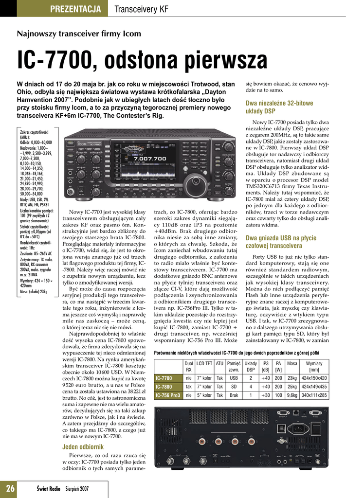 PREZENTACJA Transceivery KF Najnowszy transceiver firmy Icom IC-7700, odsłona pierwsza W dniach od 17 do 20 maja br. jak co roku w miejscowości Trotwood, stan Ohio, odbyła się największa światowa wystawa krótkofalarska „Dayton Hamvention 2007”. Podobnie jak w ubiegłych latach dość tłoczno było przy stoisku firmy Icom, a to za przyczyną tegorocznej premiery nowego transceivera KF+6m IC-7700, The Contester’s Rig. Zakres częstotliwości (MHz): Odbiór: 0,030–60,000 Nadawanie: 1,800– –1,999, 3,500–3,999, 7,000–7,300, 0,100–10,150, 14,000–14,350, 18,068–18,168, 21,000–21,450, 24,890–24,990, 28,000–29,700, 50,000–54,000 Mody: USB, LSB, CW, RTTY, AM, FM, PSK31 Liczba kanałów pamięci: 101 (99 zwykłych i 2 granice skanowania) Stałość częstotliwości: poniżej ±0,05ppm (od 0°C do +50°C) Rozdzielczość częstotliwości: 1Hz Zasilanie: 85–265V AC Zużycie mocy: TX maks. 800VA, RX czuwanie 200VA, maks. sygnału m.cz. 210VA Wymiary: 424 × 150 × 420 mm Masa: (około) 23kg Nowy IC-7700 jest wysokiej klasy transceiverem obsługującym cały zakres KF oraz pasmo 6m. Konstrukcyjnie jest bardzo zbliżony do swojego starszego brata IC-7800. Przeglądając materiały informacyjne o IC-7700, widzi się, że jest to okrojona wersja znanego już od trzech lat flagowego produktu tej firmy, IC-7800. Należy więc raczej mówić nie o zupełnie nowym urządzeniu, lecz tylko o zmodyfikowanej wersji. Być może do czasu rozpoczęcia seryjnej produkcji tego transceivera, co ma nastąpić w trzecim kwartale tego roku, inżynierowie z Icoma jeszcze coś wymyślą i naprawdę mile nas zaskoczą – może ceną, o której teraz nic się nie mówi. Najprawdopodobniej to właśnie dość wysoka cena IC-7800 spowodowała, że firma zdecydowała się na wypuszczenie tej nieco odmienionej wersji IC-7800. Na rynku amerykańskim transceiver IC-7800 kosztuje obecnie około 10 600 USD. W Niemczech IC-7800 można kupić za kwotę 9 520 euro brutto, a u nas w Polsce cena ta została ustawiona na 38 221 zł brutto. No cóż, jest to astronomiczna suma i zapewne nie ma wielu amatorów, decydujących się na taki zakup zarówno w Polsce, jak i na świecie. A zatem przejdźmy do szczegółów, co takiego ma IC-7800, a czego już nie ma w nowym IC-7700. Jeden odbiornik Pierwsze, co od razu rzuca się w oczy: IC-7700 posiada tylko jeden odbiornik o tych samych parame- 26 Świat Radio Sierpień 2007 trach, co IC-7800, oferując bardzo szeroki zakres dynamiki sięgający 110dB oraz IP3 na poziomie +40dBm. Brak drugiego odbiornika niesie za sobą inne zmiany, o których za chwalę. Szkoda, że Icom zaniechał wbudowaniu tutaj drugiego odbiornika, z założenia to radio miało właśnie być kontestowy transceiverem. IC-7700 ma dodatkowe gniazdo BNC antenowe na płycie tylniej transceivera oraz złącze CI-V, które dają możliwość podłączenia i zsynchronizowania z odbiornikiem drugiego transceivera np. IC-756Pro III. Tylko w takim układzie pozostaje do rozstrzygnięcia kwestia czy nie lepiej jest kupić IC-7800, zamiast IC-7700 + drugi transceiver, np. wcześniej wspomniany IC-756 Pro III. Może się bowiem okazać, że cenowo wyjdzie na to samo. Dwa niezależne 32-bitowe układy DSP Nowy IC-7700 posiada tylko dwa niezależne układy DSP, pracujące z zegarem 200MHz, są to takie same układy DSP, jakie zostały zastosowane w IC-7800. Pierwszy układ DSP obsługuje tor nadawczy i odbiorczy transceivera, natomiast drugi układ DSP obsługuje tylko analizator widma. Układy DSP zbudowane są w oparciu o procesor DSP model TMS320C6713 firmy Texas Instruments. Należy tutaj wspomnieć, że IC-7800 miał aż cztery układy DSP, po jednym dla każdego z odbiorników, trzeci w torze nadawczym oraz czwarty tylko do obsługi analizatora widma. Dwa gniazda USB na płycie czołowej transceivera Porty USB to już nie tylko standard komputerowy, stają się one również standardem radiowym, szczególnie w takich urządzeniach jak wysokiej klasy transceivery. Można do nich podłączyć pamięć Flash lub inne urządzenia peryferyjne znane raczej z komputerowego świata, jak myszkę czy klawiaturę, oczywiście z wtykiem typu USB. I tak, w IC-7700 zrezygnowano z dalszego utrzymywania obsługi kart pamięci typu SD, który był zainstalowany w IC-7800, w zamian Porównanie niektórych właściwości IC-7700 do jego dwóch poprzedników z górnej półki Dual LCD TFT ATU Pamięć Układy IP3 RX zewn. DSP [dB] PA [W] Masa Wymiary [mm] IC-7700 nie 7” kolor Tak 23kg 424x150x420 IC-7800 tak 7” kolor 424x149x435 IC-756 Pro3 nie 5” kolor USB 2 +40 200 Tak SD 4 +40 200 25kg Tak Brak 1 +30 100 9,6kg 340x111x285 dołożono dwa porty USB na płycie czołowej transceivera. Jeden port może być wykorzystywany właśnie do obsługi podręcznej pamięci typu Flash, a drugi do obsługi klawiatury przy pracy emisjami cyfrowymi RTTY czy PSK. Dane techniczne (prototyp) Odbiornik Układ odbiornika Częstotliwość pośrednia Czułość (typowa) Płyta czołowa i tylna Pomimo że nowy IC-7700 w zasadzie nie różni się od poprzednika ani wymiarami zewnętrznymi, ani masą całkowitą, należy podkreślić, że płyta czołowa prezentuje się nieco bardziej estetycznie niż w IC-7800. Płyta tylna nowego transceivera nie zmieniła się wizualnie, inaczej są rozmieszczone tylko niektóre gniazda. Pozostałe parametry oraz funkcjonalność IC-7700 niczym nie różni się od jego poprzednika IC-7800, więc nie będę tutaj rozpisywał się na ten temat. Przeglądając ofertę firmy Icom z górnej półki, bez wahania można umiejscowić najnowszy produkt pomiędzy znanymi krótkofalowcom IC-756Pro III i IC-7800. Roman Hennig SQ2RH Podwójna przemiana I=64,455MHz, II=36kHz SSB, CW, RTTY (BW 2,4kHz) AM (BW 6kHz) FM (BW 15kHz) Czułość blokady szumów (squelch) (przedwzmacniacz wyłączony) Selektywność (wartości reprezentatywne) Sygnały fałszywe i lustrzane, stopień wytłumienia Moc wyjściowa akusty