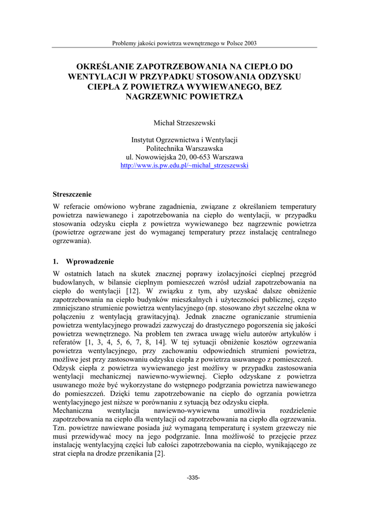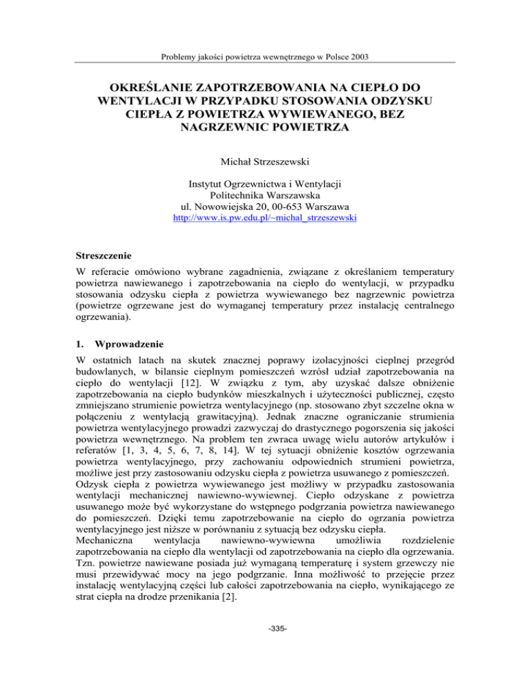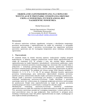 Problemy jakości powietrza wewnętrznego w Polsce 2003 OKREŚLANIE ZAPOTRZEBOWANIA NA CIEPŁO DO WENTYLACJI W PRZYPADKU STOSOWANIA ODZYSKU CIEPŁA Z POWIETRZA WYWIEWANEGO, BEZ NAGRZEWNIC POWIETRZA Michał Strzeszewski Instytut Ogrzewnictwa i Wentylacji Politechnika Warszawska ul. Nowowiejska 20, 00-653 Warszawa http://www.is.pw.edu.pl/~michal_strzeszewski Streszczenie W referacie omówiono wybrane zagadnienia, związane z określaniem temperatury powietrza nawiewanego i zapotrzebowania na ciepło do wentylacji, w przypadku stosowania odzysku ciepła z powietrza wywiewanego bez nagrzewnic powietrza (powietrze ogrzewane jest do wymaganej temperatury przez instalację centralnego ogrzewania). 1. Wprowadzenie W ostatnich latach na skutek znacznej poprawy izolacyjności cieplnej przegród budowlanych, w bilansie cieplnym pomieszczeń wzrósł udział zapotrzebowania na ciepło do wentylacji [12]. W związku z tym, aby uzyskać dalsze obniżenie zapotrzebowania na ciepło budynków mieszkalnych i użyteczności publicznej, często zmniejszano strumienie powietrza wentylacyjnego (np. stosowano zbyt szczelne okna w połączeniu z wentylacją grawitacyjną). Jednak znaczne ograniczanie strumienia powietrza wentylacyjnego prowadzi zazwyczaj do drastycznego pogorszenia się jakości powietrza wewnętrznego. Na problem ten zwraca uwagę wielu autorów artykułów i referatów [1, 3, 4, 5, 6, 7, 8, 14]. W tej sytuacji obniżenie kosztów ogrzewania powietrza wentylacyjnego, przy zachowaniu odpowiednich strumieni powietrza, możliwe jest przy zastosowaniu odzysku ciepła z powietrza usuwanego z pomieszczeń. Odzysk ciepła z powietrza wywiewanego jest możliwy w przypadku zastosowania wentylacji mechanicznej nawiewno-wywiewnej. Ciepło odzyskane z powietrza usuwanego może być wykorzystane do wstępnego podgrzania powietrza nawiewanego do pomieszczeń. Dzięki temu zapotrzebowanie na ciepło do ogrzania powietrza wentylacyjnego jest niższe w porównaniu z sytuacją bez odzysku ciepła. Mechaniczna wentylacja nawiewno-wywiewna umożliwia rozdzielenie zapotrzebowania na ciepło dla wentylacji od zapotrzebowania na ciepło dla ogrzewania. Tzn. powietrze nawiewane posiada już wymaganą temperaturę i system grzewczy nie musi przewidywać mocy na jego podgrzanie. Inna możliwość to przejęcie przez instalację wentylacyjną części lub całości zapotrzebowania na ciepło, wynikającego ze strat ciepła na drodze przenikania [2]. -335- Problemy jakości powietrza wewnętrznego w Polsce 2003 Alternatywnie, zwłaszcza w budynkach jednorodzinnych, mogą być stosowane proste systemy wentylacyjne, w których nawiewane powietrze podgrzewane jest wyłącznie przez ciepło odzyskane z powietrza wywiewanego. W tym przypadku temperatura powietrza nawiewanego do pomieszczenia jest wyższa od temperatury powietrza zewnętrznego, ale niższa od wymaganej temperatury powietrza wewnętrznego. Wówczas instalacja centralnego ogrzewania musi posiadać odpowiednią moc do podgrzania powietrza wentylacyjnego, ale moc ta jest niższa, niż ma to miejsce w przypadku, gdy nawiewane jest powietrze o temperaturze równej temperaturze zewnętrznej. Osobnym zagadnieniem jest odpowiednio rozwiązany nawiew powietrza. Powietrze, które ma temperaturę niższą od wymaganej temperatury wewnętrznej, musi najpierw zostać ogrzane przez grzejniki i dopiero wtedy trafić do strefy przebywania ludzi. 2. Określenie temperatury powietrza nawiewanego za wymiennikiem ciepła Aby określić zapotrzebowanie na ciepło do podgrzania powietrza nawiewanego, które musi dostarczyć instalacja centralnego ogrzewania, trzeba znać temperaturę nawiewu. Temperaturę tę można oszacować na podstawie efektywności odzysku ciepła. Efektywność odzysku ciepła zdefiniowana jest jako stosunek ilości ciepła przejmowanego przez powietrze nawiewane do maksymalnej ilości ciepła, jaka mogła by być uzyskana z powietrza wywiewanego: Q Φ = rz (1) Qt gdzie: Qrz – rzeczywista moc cieplna odzyskiwana przez powietrze nawiewane, W, Qt – teoretyczna maksymalna moc cieplna możliwa do odzyskania z powietrza wywiewanego, przy założeniu, że powietrze to zostanie schłodzone do temperatury zewnętrznej, W. Jeśli w wymienniku nie zachodzi wymiana wilgoci (np. w wymienniku płytowym – rys. 1) oraz strumień powietrza nawiewanego równy jest strumieniowi powietrza wywiewanego (mn = mw) równanie (1) przyjmuje następującą postać [13]: t −t Φ= n z (2) tw − t z gdzie: tn – temperatura powietrza nawiewanego za wymiennikiem, ºC, tw – temperatura powietrza wywiewanego, ºC, tz – temperatura powietrza zewnętrznego, ºC. -336- Problemy jakości powietrza wewnętrznego w Polsce 2003 tw tz tn Rys. 1. Schemat wymiennika płytowego Stąd temperatura powietrza nawiewanego za wymiennikiem określona jest w następujący sposób: t n = t z + Φ (t w − t z ) (3) oznaczenia j.w. Orientacyjne wartości efektywności odzysku ciepła dla różnych systemów podano w tabeli 1. Tabela 1. Porównanie systemów odzysku ciepła. Na podstawie [2] System odzysku ciepła Efektywność odzysku ciepła (bez odzysku wilgoci) Wymiennik płytowy Rekuperacja pośrednia Rurka cieplna Wymiennik obrotowy bez odzysku wilgoci Wymiennik obrotowy z odzyskiem wilgoci Części ruchome Możliwość wymiany wilgoci 50-60% Powietrze nawiewane i wywiewane w jednej centrali tak nie nie 40-50% nie tak nie 50-60% 65-80% tak tak nie tak nie w małym stopniu 65-80% tak tak tak Przykład Określić temperaturę powietrza nawiewanego za wymiennikiem płytowym o efektywności odzysku ciepła 60%. Temperatura powietrza zewnętrznego wynosi –20ºC, a wewnętrznego +20ºC. t n = t z + Φ (t w − t z ) = −20 + 0,6[20 − (− 20 )] = 4°C -337- Problemy jakości powietrza wewnętrznego w Polsce 2003 3. Zapotrzebowanie na ciepło do wentylacji zgodnie z normą PN-B-03406:1994 Aby określić zapotrzebowanie na ciepło do wentylacji, należy znać strumień i temperaturę powietrza na