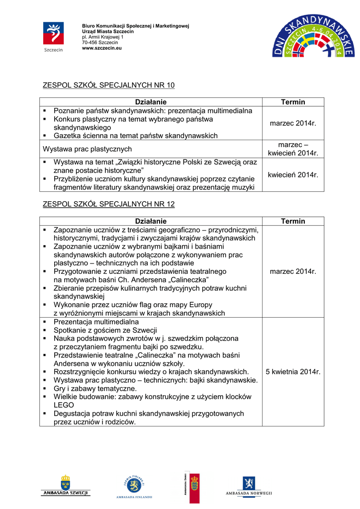 Biuro Komunikacji Społecznej i Marketingowej Urząd Miasta Szczecin pl. Armii Krajowej 1 70-456 Szczecin www.szczecin.eu ZESPOL SZKÓŁ SPECJALNYCH NR 10 Działanie Poznanie państw skandynawskich: prezentacja multimedialna Konkurs plastyczny na temat wybranego państwa skandynawskiego Gazetka ścienna na temat państw skandynawskich Wystawa prac plastycznych Wystawa na temat „Związki historyczne Polski ze Szwecją oraz znane postacie historyczne” PrzybliŜenie uczniom kultury skandynawskiej poprzez czytanie fragmentów literatury skandynawskiej oraz prezentację muzyki Termin marzec 2014r. marzec – kwiecień 2014r. kwiecień 2014r. ZESPOL SZKÓŁ SPECJALNYCH NR 12 Działanie Termin Zapoznanie uczniów z treściami geograficzno – przyrodniczymi, historycznymi, tradycjami i zwyczajami krajów skandynawskich Zapoznanie uczniów z wybranymi bajkami i baśniami skandynawskich autorów połączone z wykonywaniem prac plastyczno – technicznych na ich podstawie Przygotowanie z uczniami przedstawienia teatralnego marzec 2014r. na motywach baśni Ch. Andersena „Calineczka” Zbieranie przepisów kulinarnych tradycyjnych potraw kuchni skandynawskiej Wykonanie przez uczniów flag oraz mapy Europy z wyróŜnionymi miejscami w krajach skandynawskich Prezentacja multimedialna Spotkanie z gościem ze Szwecji Nauka podstawowych zwrotów w j. szwedzkim połączona z przeczytaniem fragmentu bajki po szwedzku. Przedstawienie teatralne „Calineczka” na motywach baśni Andersena w wykonaniu uczniów szkoły. Rozstrzygnięcie konkursu wiedzy o krajach skandynawskich. 5 kwietnia 2014r. Wystawa prac plastyczno – technicznych: bajki skandynawskie. Gry i zabawy tematyczne. Wielkie budowanie: zabawy konstrukcyjne z uŜyciem klocków LEGO Degustacja potraw kuchni skandynawskiej przygotowanych przez uczniów i rodziców. Biuro Komunikacji Społecznej i Marketingowej Urząd Miasta Szczecin pl. Armii Krajowej 1 70-456 Szczecin www.szczecin.eu I LICEUM OGÓLNOKSZTAŁCĄCE Działanie Plakaty o krajach skandynawskich – sport, muzyka i mitologia - rozmieszczone w szkole Gazetka o literaturze skandynawskiej i wystawa ksiąŜek autorów skandynawskich - korytarz przy bibliotece szkolnej Gazetka w gablocie historycznej „Związki Pomorza Zachodniego ze Skandynawią na przestrzeni dziejów” Prezentacje multimedialne – „I LO w Finlandii”, „Festiwal Wikingów w Wolinie” Kącik kulinarny – przepisy na potrawy skandynawskie Lekcja języka norweskiego 5 minut dla ksiąŜki skandynawskiej Konkurs „Portret trolla” Termin od 1 kwietnia 2014 r. 3 kwietnia 2014 r. 01.04 - 03.04.2014r. CENTRUM KSZTAŁCENIA SPORTOWEGO (ul. Mazurska) Działanie Gazetki tematyczne: Tradycje wielkanocne w Skandynawii oraz kuchnia skandynawska Wybitni sportowcy, obiekty sportowe - Szwecja Finlandia, Dania, Norwegia Rodzina królewska - Norwegia, Szwecja, Dania, ustrój Finlandii Pisarze skandynawscy Klimat, połoŜenie, główne ośrodki, ukształtowanie terenu Symbole Szwecji, Finlandii, Danii, Norwegii Co warto zobaczyć w Szwecji i Finlandii oraz w Danii i Norwegii? Czytanie bajek - poznanie twórczości autorów skandynawskich (świetlica szkolna) Wizyta olimpijczyków z Norwegii, Spotkanie z uczniami szkoły w sali konferencyjnej SDS Termin Do 31 marca 2014 r. 31 marca - 4 kwietnia 07 czerwca 2014 r. CENTRUM KSZTAŁCENIA SPORTOWEGO (ul. Rydla) Działanie Poznawanie literatury skandynawskiej (Astrid Lindgren) Scenki z Baśni Andersena Omówienie wpływu Wikingów na historię i język Anglii Projekcja filmu "Ronya, córka zbójnika" Akcja "Rusz się" - ćwiczenia przy muzyce zespołu ABBA na przerwach Prezentacja krajów skandynawskich, sportowców, literatury, sztuki (film, muzyka) oraz znanych firm i ich produktów Termin marzec 2014 r. 11.03 – 06.04.2014 r. 01.04 – 06.04.2014 r. Biuro Komunikacji Społecznej i Marketingowej Urząd Miasta Szczecin pl. Armii Krajowej 1 70-456 Szczecin www.szczecin.eu ZESPÓŁ SZKÓŁ OGÓLNOKSZTAŁCĄCYCH NR 9 Działanie Realizacja tematyki skandynawskiej, np: geografia - Charakterystyka krajów skandynawskich (kl. I) - Postać R. Amundsena zdobywcy bieguna południowego (kl. II) - Prelekcja z pokazem zdjęć "Norwegia" (kl. III) j.polski - Andersen i jego baśnie - Nagroda Nobla i wielcy Nobliści. fizyka - Alfred Nobel wynalazca dynamitu. matematyka - Dane statystyczne dotyczące krajów skandynawskich biologia - Flora i fauna krajów skandynawskich historia - Wikingowie WOS - Najstarszy parlament na świecie w Islandii - Ustrój, forma rządów, waluta, przynaleŜność do UE chemia - Ruda Ŝelaza w rejonie Kiruny (Szwecja) zajęcia artystyczne - Wykonanie flag krajów skandynawskich - Ilustracje do baśni Andersena Kąciki i gazetki o krajach skandynawskich Krótkie konkursy Termin 3 kwietnia 2014 r. ZESPÓŁ SZKÓŁ SAMOCHODOWYCH Działanie Konkurs prezentacja multimedialna o krajach skandynawskich (kl. I tech.) Gazetka na temat treści geograficzno-przyrodniczych, tradycji i zwyczajów naszych północnych sąsiadów. Termin 4 kwietnia 2014 r. PAŃSTWOWE OGNISKO BALETOWE Działanie Zapoznanie uczniów z muzyką skandynawską związaną z legendami Wiadomości o tańcu - twórczość Edvarda Griega i Jana Sibeliusa Przygotowanie układów tanecznych do muzyki skandynawskiej Termin marzec – maj 2014 marzec – kwiecień Biuro Komunikacji Społecznej i Marketingowej Urząd Miasta Szczecin pl. Armii Krajowej 1 70-456 Szczecin www.szczecin.eu E. Griega i J. Sibeliusa Prezentacja układów – Hala Opery na Zamku w Szczecinie. Przygotowanie cyklu informacji nawiązujących do znanych artystów skandynawskich w szkolnych gazetkach oraz na gazetkach ściennych 2014 r. 28.04.2014 r. kwiecień – czerwiec 2014 ŚRODOWISKOWA PLACÓWKA EDUKACYJNO – WYCHOWAWCZA Działanie PODRÓś DO SKANDYNAWII – W KRAINIE TROLLI „PodróŜ w nieznane: Skandynawia” – zabawa ruchowa „Troll przewodnik: Palcem po mapie” – przybliŜenie podstawowych informacji n/t Skandynawii „Opowie