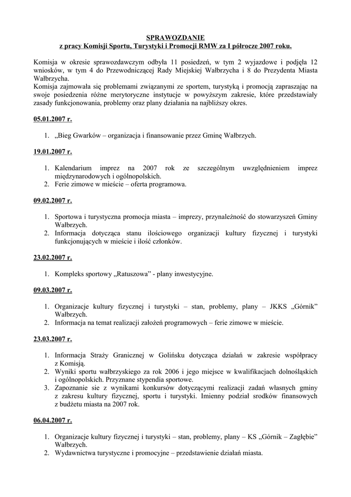 SPRAWOZDANIE z pracy Komisji Sportu, Turystyki i Promocji RMW za I półrocze 2007 roku. Komisja w okresie sprawozdawczym odbyła 11 posiedzeń, w tym 2 wyjazdowe i podjęła 12 wniosków, w tym 4 do Przewodniczącej Rady Miejskiej Wałbrzycha i 8 do Prezydenta Miasta Wałbrzycha. Komisja zajmowała się problemami związanymi ze sportem, turystyką i promocją zapraszając na swoje posiedzenia różne merytoryczne instytucje w powyższym zakresie, które przedstawiały zasady funkcjonowania, problemy oraz plany działania na najbliższy okres. 05.01.2007 r. 1. „Bieg Gwarków – organizacja i finansowanie przez Gminę Wałbrzych. 19.01.2007 r. 1. Kalendarium imprez na 2007 rok ze międzynarodowych i ogólnopolskich. 2. Ferie zimowe w mieście – oferta programowa. szczególnym uwzględnieniem imprez 09.02.2007 r. 1. Sportowa i turystyczna promocja miasta – imprezy, przynależność do stowarzyszeń Gminy Wałbrzych. 2. Informacja dotycząca stanu ilościowego organizacji kultury fizycznej i turystyki funkcjonujących w mieście i ilość członków. 23.02.2007 r. 1. Kompleks sportowy „Ratuszowa” - plany inwestycyjne. 09.03.2007 r. 1. Organizacje kultury fizycznej i turystyki – stan, problemy, plany – JKKS „Górnik” Wałbrzych. 2. Informacja na temat realizacji założeń programowych – ferie zimowe w mieście. 23.03.2007 r. 1. Informacja Straży Granicznej w Golińsku dotycząca działań w zakresie współpracy z Komisją. 2. Wyniki sportu wałbrzyskiego za rok 2006 i jego miejsce w kwalifikacjach dolnośląskich i ogólnopolskich. Przyznane stypendia sportowe. 3. Zapoznanie sie z wynikami konkursów dotyczącymi realizacji zadań własnych gminy z zakresu kultury fizycznej, sportu i turystyki. Imienny podział srodków finansowych z budżetu miasta na 2007 rok. 06.04.2007 r. 1. Organizacje kultury fizycznej i turystyki – stan, problemy, plany – KS „Górnik – Zagłębie” Wałbrzych. 2. Wydawnictwa turystyczne i promocyjne – przedstawienie działań miasta. - 2 3. Wstępne zapoznanie ze sprawozdaniem z wykonania budżetu Miasta Wałbrzycha za 2006 rok. 20.04.2007 r. - posiedzenie wyjazdowe. 1. Wizytacja obiektów sportowych: - ul.Kusocińskiego – Piaskowa Góra, - ul.Topolowa – SCATEPARK, - ul.Blankowa – boisko. 11.05.2007 r. 1. Organizacje kultury fizycznej – stan, problemy, plany - „Juventur” Wałbrzych. 2. Współpraca miast partnerskich na płaszczyźnie: sportu, kultury fizycznej, rekreacji, turystyki i promocji miasta. Dalsze plany współpracy. 25.05.2007 r. 1. Boisko przy ul.Blankowej (Podzamcze) – stan techniczny i dalsze plany. 2. Kompleks sportowo-rekreacyjny przy ul.Ratuszowej – stopień realizacji inwestycji. 15.06.2007 r. - posiedzenie wyjazdowe. 1. Wakacje 2007 rok – oferta programowa. 2. Ścieżki rowerowe – funkcjonowanie na terenie miasta. 3. Wizytacja obiektów sportowych: - ul.Chopina – Nowe Miasto, - ul.Bystrzycka – Rusinowa. Ponadto Komisja na swoich posiedzeniach opiniowała projekty uchwał, jak również rozpatrywała sprawy bieżące. Przewodniczący Komisji STiP /-/ Artur Torbus