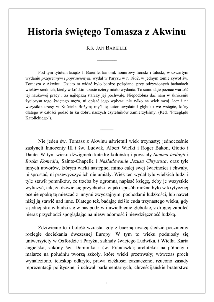 Historia świętego Tomasza z Akwinu KS. JAN BAREILLE ––––––––– Pod tym tytułem ksiądz J. Bareille, kanonik honorowy lioński i tuluski, w czwartym wydaniu przejrzanym i poprawionym, wydał w Paryżu w r. 1862, w jednym tomie żywot św. Tomasza z Akwinu. Dzieło to widać było bardzo pożądane, przy odżywionych badaniach wieków średnich, kiedy w krótkim czasie cztery miało wydania. To samo daje poznać wartość tej naukowej pracy i za najlepszą starczy jej pochwałę. Niepodobna dać nam w skróceniu życiorysu tego świętego męża, ni opisać jego wpływu nie tylko na wiek swój, lecz i na wszystkie czasy w Kościele Bożym; myśl tę autor uwydatnił głęboko we wstępie, który dlatego w całości podać tu ku dobru naszych czytelników zamierzyliśmy. (Red. "Przeglądu Katolickiego"). –––––– Nie jeden św. Tomasz z Akwinu uświetnił wiek trzynasty; jednocześnie zasłynęli Innocenty III i św. Ludwik, Albert Wielki i Roger Bakon, Giotto i Dante. W tym wieku dźwignięto katedrę kolońską i powstały Summa teologii i Boska Komedia, Sainte-Chapelle i Naśladowanie Jezusa Chrystusa, oraz tyle innych utworów, którym wieki następne, mimo całej swej świetności i chwały, ni sprostać, ni przewyższyć ich nie umiały. Wiek ten wydał tylu wielkich ludzi i tyle stawił pomników, że trzeba by ogromną napisać księgę, żeby je wszystkie wyliczyć, tak, że dziwić się przychodzi, w jaki sposób można było w krytycznej ocenie epokę tę mieszać z innymi zwyczajnymi pochodami ludzkości, lub nawet niżej ją stawić nad inne. Dlatego też, badając ściśle cuda trzynastego wieku, gdy z jednej strony budzi się w nas podziw i uwielbienie głębokie, z drugiej zaboleć nieraz przychodzi spoglądając na nieświadomość i niewdzięczność ludzką. Zdziwienie to i boleść wzrasta, gdy z baczną uwagą śledzić poczniemy rozległe dociekania ówczesnej Europy. W tym to wieku podniosły się uniwersytety w Oxfordzie i Paryżu, zakłady świętego Ludwika, i Wielka Karta angielska, zakony św. Dominika i św. Franciszka; architekci na północy i malarze na południu tworzą szkoły, które wieki przetrwały; wówczas proch wynaleziono, teleskop odkryto, prawa ciężkości zaznaczono, rzucono zasady reprezentacji politycznej i uchwał parlamentarnych; chrześcijańskie braterstwo 1 przenika głębiny prawodawstwa, a wielkie nowoczesne odłamy narodów w wybitny powstają sposób. Wszystkie sztuki, umiejętności wszystkie, wszystkie szlachetne uczucia i wielkie myśli roją się po głowach i poruszają serca ludzi, wypisując się zewnątrz w dziełach wielkich i w potężnych instytucjach. Stara społeczność chwieje się w swoich podwalinach, a wyrzucając precz wszelkie nieprzyjazne wpływy, przyzywając zaś z góry natchnienia, w nowe szybuje przestrzenie, odważnie kroczy ku wielkim swoim przeznaczeniom. Potężne geniusze stoją na straży i prowadzą ludzkość: a pomiędzy wszystkimi ukazuje się wielka postać św. Tomasza z Akwinu; przy świetnej zaś jego gwieździe, która ma wyrażać jego geniusz, jak to zobaczymy, blednie każda inna wielkość. W tym to mężu świętym mieści się naraz wszystko, co było najpiękniejszego i najdzielniejszego w wieku całym; wyraża on potęgę, która bądź co bądź w końcu podbija każdą inną, potęgę idei. Nic innego nie odbiło się w jego życiu; życie to całkiem oderwane, a jedyne rzec można jego wypadki, pojęcia; mimo to było to i życie walki, a ustawiczna praca myśli przemienia je w dramat nadludzkiej prawie i szczytnej wielkości. Jakoż po dokonaniu walki, co go po wielu dziwnych przemianach podniosła na tron duchowy, nastała walka, którą ustawicznie wytrzymywać musiał przeciw nieprzeliczonym nieprzyjaciołom religii i społeczności. Na czole jednak tego męża zapanował cały spokój i pogoda anielska, nic nie wydaje trosk i ciężkiej pracy ducha, który zakreśla drogi przeznaczeniom ludzkości, i wymija zręcznie już to rozszalałe zapędy ludów, już panujących samowolę, już to podwodne skały fatalizmu, już też piętrzące się namiętności bałwany. Dotychczas w świętym Tomaszu widziano jeno pobożnego zakonnika, albo co najwięcej głębokiego teologa, teologa spekulacji i teorii, który sobie spokojnie dogmatyzuje w celi klasztornej, a z niej nawet wyjrzeć nie raczy na świat, który przemija. Lecz głębiej wejrzawszy w czynności tego żywota, a pisma jego porównawszy z jego działalnością, łatwo rozpoznasz w nim geniusz pełen działalności i siły, który historia wieńczy chwałą i geniusz, jakiego wyglądano w tym czasie, już to, by jego zapędom niebacznym stawił dzielną zaporę, już też żeby przeciw jego zboczeniom stawił potęgę swego trzeźwego poglądu; już wreszcie, żeby stanąwszy pośrodku swoich, zapanował nad nimi i prawy wskazał wszystkim prawdy gościniec. Dziwny to był jednak geniusz i całkiem odmienny od wielu innych, gdy jedno przeznaczenie zbliża ich do siebie. Dla otrzymania i wykonywania tej potęgi duchowej, nie potrzebował on 2 żadnego z tych wielkich rusztowań, co je stawiają ku wyniesieniu tronu z desek; prosty to zakonnik, a wszystko w owych czasach ukorzyć się musiało przed jego potęgą w świecie ducha, czy to rozbijając się o potężną jego logikę, czy też poddając się z pokorą jego przewodnictwu. W jeden to lub drugi sposób panować on musi; panować też będzie, zarówno podnosząc działalność swego wieku, jak i podsycając wszystkie szlachetne jego dążności; dążności bo też tej epoki, kiedy i on im przewodzić zaczął, były to dążności ku dobru, pięknu, prawdzie, cnocie; jednym słowem ku Bogu! Kiedy chcesz badać dążności jakiego wieku, a śledzić życie we wszelkich jego objawach, naprzód uderza cię pochód wspaniały instytucji politycznych. Jest to niejako zewnętrzna powłoka narodów; tam też najprędzej wyśledzisz prace i post