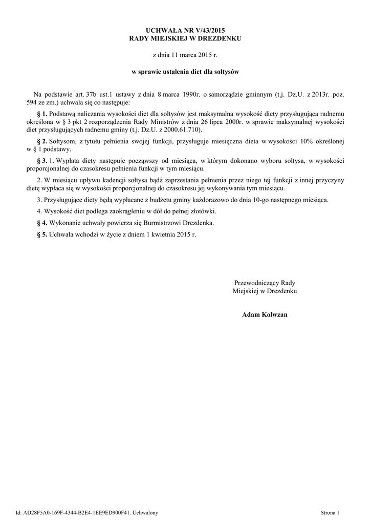 UCHWAŁA NR V/43/2015 RADY MIEJSKIEJ W DREZDENKU z dnia 11 marca 2015 r. w sprawie ustalenia diet dla sołtysów Na podstawie art. 37b ust.1 ustawy z dnia 8 marca 1990r. o samorządzie gminnym (t.j. Dz.U. z 2013r. poz. 594 ze zm.) uchwala się co następuje: § 1. Podstawą naliczania wysokości diet dla sołtysów jest maksymalna wysokość diety przysługująca radnemu określona w § 3 pkt 2 rozporządzenia Rady Ministrów z dnia 26 lipca 2000r. w sprawie maksymalnej wysokości diet przysługujących radnemu gminy (t.j. Dz.U. z 2000.61.710). § 2. Sołtysom, z tytułu pełnienia swojej funkcji, przysługuje miesięczna dieta w wysokości 10% określonej w § 1 podstawy. § 3. 1. Wypłata diety następuje począwszy od miesiąca, w którym dokonano wyboru sołtysa, w wysokości proporcjonalnej do czasokresu pełnienia funkcji w tym miesiącu. 2. W miesiącu upływu kadencji sołtysa bądź zaprzestania pełnienia przez niego tej funkcji z innej przyczyny dietę wypłaca się w wysokości proporcjonalnej do czasokresu jej wykonywania tym miesiącu. 3. Przysługujące diety będą wypłacane z budżetu gminy każdorazowo do dnia 10-go następnego miesiąca. 4. Wysokość diet podlega zaokrągleniu w dół do pełnej złotówki. § 4. Wykonanie uchwały powierza się Burmistrzowi Drezdenka. § 5. Uchwała wchodzi w życie z dniem 1 kwietnia 2015 r. Przewodniczący Rady Miejskiej w Drezdenku Adam Kołwzan Id: AD28F5A0-169F-4344-B2E4-1EE9ED900F41. Uchwalony Strona 1 Uzasadnienie W odpowiedzi na wniosek do budżetu na 2015 rok sołtysów gminy Drezdenko w sprawie podwyższenia diet Rada Miejska w Drezdenku postananawia pozytywnie ustosunkować się do w/w wniosku i podwyższyć diety sołtysów z 7,5% do 10% podstawy. Podstawą naliczania wysokości diet dla sołtysów jest maksymalna wysokość diety przysługująca radnemu określona w § 3 pkt 2 rozporządzenia Rady Ministrów z dnia 26 lipca 2000r. w sprawie maksymalnej wysokości diet przysługujących radnemu gminy. W związku z powyższym podjęcie uchwały uważa się za zasadne. Id: AD28F5A0-169F-4344-B2E4-1EE9ED900F41. Uchwalony Strona 1