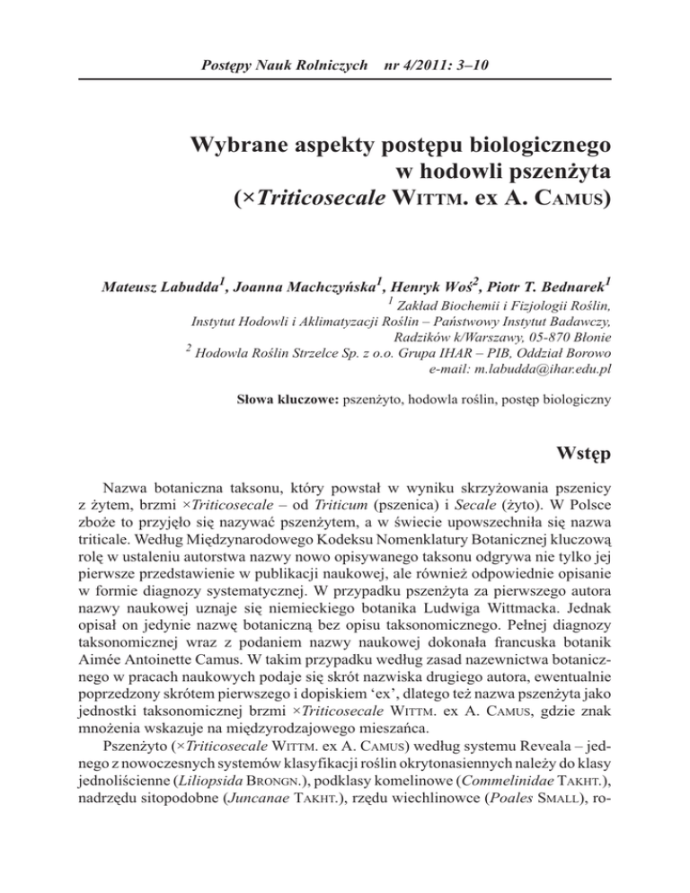 Postêpy Nauk Rolniczych nr 4/2011: 3–10 Wybrane aspekty postêpu biologicznego w hodowli pszen¿yta (×Triticosecale WITTM. ex A. CAMUS) Mateusz Labudda1, Joanna Machczyñska1, Henryk Woœ2, Piotr T. Bednarek1 1 Zak³ad Biochemii i Fizjologii Roœlin, Instytut Hodowli i Aklimatyzacji Roœlin – Pañstwowy Instytut Badawczy, Radzików k/Warszawy, 05-870 B³onie 2 Hodowla Roœlin Strzelce Sp. z o.o. Grupa IHAR – PIB, Oddzia³ Borowo e-mail: [email protected] S³owa kluczowe: pszen¿yto, hodowla roœlin, postêp biologiczny Wstêp Nazwa botaniczna taksonu, który powsta³ w wyniku skrzy¿owania pszenicy z ¿ytem, brzmi ×Triticosecale – od Triticum (pszenica) i Secale (¿yto). W Polsce zbo¿e to przyjê³o siê nazywaæ pszen¿ytem, a w œwiecie upowszechni³a siê nazwa triticale. Wed³ug Miêdzynarodowego Kodeksu Nomenklatury Botanicznej kluczow¹ rolê w ustaleniu autorstwa nazwy nowo opisywanego taksonu odgrywa nie tylko jej pierwsze przedstawienie w publikacji naukowej, ale równie¿ odpowiednie opisanie w formie diagnozy systematycznej. W przypadku pszen¿yta za pierwszego autora nazwy naukowej uznaje siê niemieckiego botanika Ludwiga Wittmacka. Jednak opisa³ on jedynie nazwê botaniczn¹ bez opisu taksonomicznego. Pe³nej diagnozy taksonomicznej wraz z podaniem nazwy naukowej dokona³a francuska botanik Aimée Antoinette Camus. W takim przypadku wed³ug zasad nazewnictwa botanicznego w pracach naukowych podaje siê skrót nazwiska drugiego autora, ewentualnie poprzedzony skrótem pierwszego i dopiskiem ‘ex’, dlatego te¿ nazwa pszen¿yta jako jednostki taksonomicznej brzmi ×Triticosecale WITTM. ex A. CAMUS, gdzie znak mno¿enia wskazuje na miêdzyrodzajowego mieszañca. Pszen¿yto (×Triticosecale WITTM. ex A. CAMUS) wed³ug systemu Reveala – jednego z nowoczesnych systemów klasyfikacji roœlin okrytonasiennych nale¿y do klasy jednoliœcienne (Liliopsida BRONGN.), podklasy komelinowe (Commelinidae TAKHT.), nadrzêdu sitopodobne (Juncanae TAKHT.), rzêdu wiechlinowce (Poales SMALL), ro- 4 M. Labudda, J. Machczyñska, H. Woœ, P.T. Bednarek dziny wiechlinowate (Poaceae (R. BR.) BARNH.) [15]. Jako nowy takson powsta³o w wyniku krzy¿owania oddalonego, które mia³o na celu nagromadzenie w jednej formie mieszañcowej wartoœciowych cech pszenicy i ¿yta. Pszen¿yto zawieraj¹c w sobie genom Secale oraz czêœæ genomu Triticum charakteryzuje siê zarówno zdolnoœci¹ tworzenia plonu wysokiej jakoœci, który u¿ytkowany jest g³ównie na cele paszowe, jak i odpornoœci¹ na stresy abiotyczne i biotyczne [1]. Ziarniaki pszen¿yta zawieraj¹ wiêcej bia³ka, sk³adników mineralnych oraz lizyny w porównaniu z pszenic¹, ry¿em czy kukurydz¹ przy równoczesnym zachowaniu podobnego poziomu witamin w odniesieniu do pszenicy [6]. Powstanie taksonu i pocz¹tki polskiej hodowli Historiê hodowli tego gatunku zapocz¹tkowa³ Wilson, który to w latach 1875–1876 w Edynburgu w Szkocji uzyska³ i opisa³ dwie sterylne roœliny mieszañcowe, powsta³e w wyniku bezpoœredniego krzy¿owania pszenicy z ¿ytem [21, 24, 25]. Pierwotne formy pszen¿yta o ró¿nym stopniu ploidalnoœci otrzymywano krzy¿uj¹c diploidalne ¿yto z ró¿ni¹cymi siê pod wzglêdem liczby chromosomów gatunkami z rodzaju Triticum, a nastêpnie podwajaniu liczby chromosomów u p³onnych mieszañców pokolenia F1 [14]. Najstarsz¹ uzyskan¹ form¹ mieszañcow¹, powsta³¹ w wyniku skrzy¿owania pszenicy heksaploidalnej (Triticum aestivum L.; 2n = 6x = 42) z ¿ytem diploidalnym (Secale cereale L.; 2n = 2x = 14) by³o pszen¿yto oktaploidalne (2n = 8x = 56) [14]. Krzy¿uj¹c pszenicê diploidaln¹ Triticum monococcum L. var. macedonicum (2n = 2x = 14) z ¿ytem diploidalnym ‘Dañkowskie Z³ote’ (2n = 2x = 14) otrzymano amfiploid – pszen¿yto tetraploidalne [31, 32]. Przeprowadzaj¹c natomiast krzy¿owanie pszenicy heksaploidalnej (2n = 6x = 42) z ¿ytem tetraploidalnym (2n = 4x = 28), podjêto próby wyprowadzenia pszen¿yta dekaploidalnego (2n = 10x = 70), jednak¿e uzyskane mieszañce cechowa³y siê s³abym wigorem, by³y niep³odne i niestabilne cytogenetycznie [25]. Optymalnym poziomem ploidalnoœci dla pszen¿yta okaza³a siê heksaploidalnoœæ. Pszen¿yto heksaploidalne (2n = 6x = 42) otrzymano krzy¿uj¹c tetraploidalne gatunki pszenicy (2n = 4x = 28) Triticum durum DESF. i Triticum turgidum L. z ¿ytem Secale cereale L. lub innymi gatunkami z rodzaju Secale (np. z Secale montanum). Obecnie na œwiecie wiêkszoœæ uprawianych odmian oraz wszystkie odmiany krajowe to odmiany heksaploidalne [14]. W Polsce próby hodowli pszen¿yta ozimego podjêto w XIX wieku, jednak¿e dopiero tu¿ przed wybuchem II Wojny Œwiatowej zarejestrowano pierwsz¹ odmianê – pszen¿yto ‘Kruszynkowskie’ [4]. Odmiany przeznaczone do produkcji towarowej zaczê³y powstawaæ w Polsce na pocz¹tku lat 80. ubieg³ego wieku. Prekursorow¹ odmian¹ zarejestrowan¹ w 1982 roku by³a ozima forma ‘Lasko’, która – ze wzglêdu na swoj¹ wysok¹ sk³onnoœæ do wymarzania – przeznaczona by³a g³ównie na cele eksportowe. Wyleganie plantacji, które mo¿e w znacznym stopniu spowodowaæ straty iloœciowe i jakoœciowe w plonie ziarna jest du¿ym ograniczeniem w uprawie Wybrane aspekty postêpu biologicznego … 5 pszen¿yta ozimego, dlatego te¿ istotnym postêpem w hodowli by³o wyhodowanie odmian pó³kar³owych. Pierwsz¹ zarejestrowan¹ w Polsce odmian¹ pó³kar³ow¹ by³ ‘Fidelio’ (1997). W produkcji rolniczej znajduj¹ siê równie¿ jare formy pszen¿yta, z których, jako protoplastê, w 1987 roku zarejestrowano ‘Jago’ [4]. Optymalny model odmiany pszen¿yta ozimego Prof. Czes³aw Tarkowski, prof. Tadeusz Wolski oraz dr Walenty Maækowiak, którzy w istotny sposób przyczynili siê do rozwoju hodowli roœlin w Polsce i na œwiecie, zdefiniowali cechy, jakimi powinna byæ obdarzona dobra odmiana Triticosecale. Na tle innych roœlin rolniczych w celu zachowania konkurencyjnoœci i op³acalnoœci upraw