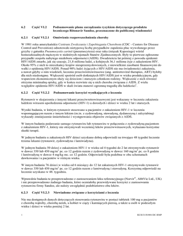 6.2 Część VI.2 Podsumowanie planu zarządzania ryzykiem dotyczącego produktu leczniczego Ritonavir Sandoz, przeznaczone do publicznej wiadomości 6.2.1 Część VI.2.1 Omówienie rozpowszechnienia choroby W 1981 roku amerykańskie Centrum Zwalczania i Zapobiegania Chorobom (CDC - Centers for Disease Control and Prevention) odnotowało nietypową liczbę przypadków zapalenia płuc wywołanego przez grzyby z gatunku Pneumocystis carinii (pneumocytoza) oraz raka (mięsak Kaposiego) wśród homoseksualnych mężczyzn w niektórych rejonach Stanów Zjednoczonych. Były to pierwsze zgłoszone przypadki zespołu nabytego niedoboru odporności (AIDS). Dwadzieścia lat później z powodu epidemii HIV/AIDS zmarło, jak się szacuje, 21,8 miliona ludzi, a kolejnych 36,1 miliona żyje z zakażeniem HIV. Około 95% z nich to mieszkańcy krajów nieuprzemysłowionych, z niewielkimi zasobami finansowymi do walki z epidemią HIV/AIDS. Ponad 90% ludzi żyjących z HIV/AIDS nie ma świadomości zakażenia, a nawet gdyby o nim wiedzieli, leczenie przeciwretrowirusowe (ang. antiretroviral therapies, ART) byłoby dla nich niedostępne. Większość spośród osób dotkniętych HIV/AIDS jest w wieku produkcyjnym, gdy wsparciem ekonomicznym służy się dzieciom i starszym członkom rodziny. Większość z nich również otrzyma minimalną opiekę, gdy w końcu rozwinie się u nich choroba związana z AIDS. Z wielu względów epidemia HIV/AIDS w skali świata stanowi ogromną tragedię dla ludzkości1. 6.2.2 Część VI.2.2 Podsumowanie korzyści wynikających z leczenia Rytonawir w skojarzeniu z innymi lekami przeciwretrowirusowymi jest wskazany w leczeniu zakażenia ludzkim wirusem upośledzenia odporności (HIV-1) u dorosłych i dzieci w wieku 2 lat i starszych. Wyniki badania, w którym rytonawir stosowano u pacjentów z zakażeniem HIV-1 w leczeniu wspomagającym razem z innym lekiem (m.in. z zydowudyną, stawudyną, dydanozyną i zalcytabiną) wykazały zmniejszenie śmiertelności i występowania objawów związanych z AIDS. W innym badaniu podawanie samego rytonawiru lub rytonawiru w połączeniu z zydowudyną pacjentom z zakażeniem HIV-1, którzy nie otrzymywali wcześniej leków przeciwwirusowych, wykazano korzystne skutki terapii. W jednym badaniu u zakażonych HIV dzieci uzyskano dobrą odpowiedź na trwające 48 tygodni leczenie trzema lekami (rytonawir, zydowudyna i lamiwudyna). W jednym badaniu 50 dzieci z zakażeniem HIV-1 w wieku od 4 tygodni do 2 lat otrzymywało rytonawir w dawce 350 lub 450 mg/m2 pc. co 12 godzin razem z zydowudyną w dawce 160 mg/m2 pc. co 8 godzin i lamiwudyną w dawce 4 mg/kg mc. co 12 godzin. Odpowiedź była podobna w obu schematach dawkowania i u pacjentów w różnym wieku. W innym badaniu 76 dzieci w wieku od 6 miesięcy do 12 lat zakażonych HIV-1 otrzymywało rytonawir w dawce 350 lub 450 mg/m2 pc. co 12 godzin razem z lamiwudyną i stawudyną. Korzystną odpowiedź na leczenie uzyskano w 48. tygodniu. Wprawdzie badania te przeprowadzono z zastosowaniem leku referencyjnego (Norvir®, AbbVie Ltd., UK) i nie przeprowadzono żadnego badania, które oceniałoby przewidywane korzyści z zastosowania rytonawiru firmy Sandoz, ale należy uwzględnić podobieństwo obu leków. 6.2.3 Część VI.2.3 Niewiadome związane z korzyściami z leczenia Nie ma dostępnych danych dotyczących stosowania rytonawiru w postaci tabletek 100 mg u pacjentów z chorobą wątroby, chorobą nerek, u kobiet w ciąży i karmiących piersią, a także u osób w podeszłym wieku i dzieci w wieku poniżej 2 lat. 1 SE/H/3150/001/DC-RMP 6.2.4 Część VI.2.4 Podsumowanie informacji dotyczących bezpieczeństwa stosowania Tabela 6-5 Istotne zidentyfikowane ryzyko Ryzyko Dostępne informacje Nieprawidłowy zapis Wykazano, że rytonawir powoduje u EKG (wydłużenie PR) niektórych zdrowych dorosłych osób zmiany w zapisie EKG (niewielkie bezobjawowe wydłużenie odstępu PR). U pacjentów z istniejącą chorobą serca lub u pacjentów przyjmujących leki wpływające na EKG (wydłużające odstęp PR), w rzadkich przypadkach informowano o bloku przedsionkowokomorowym II° lub III° podczas stosowania rytonawiru. Zgłaszano występowanie zaburzenia, Zaburzenie, w którym w którym układ odpornościowy układ odpornościowy pacjenta zwalcza tkanki jego pacjenta zwalcza tkanki organizmu (choroba Gravesajego organizmu (zespół Basedowa). zapalnej reaktywacji immunologicznej w postaci zaburzeń autoimmunologicznych (tj. choroba GravesaBasedowa) Możliwość zapobiegania Istnieje możliwość zapobiegania. Podczas leczenia lekarz powinien regularnie kontrolować EKG pacjenta. Istnieje możliwość zapobiegania. Pacjent powinien poinformować lekarza o wystąpieniu jakichkolwiek zaburzeń układu odpornościowego w trakcie leczenia. Tabela 6-6 Istotne potencjalne zagrożenia Ryzyko Dostępne dane Interakcje lekowe z U pacjentów z zapaleniem wątroby otrzymujących leczenie polegające na inhibitorami proteazy podaniu kilku leków przeciwretrowirusowych istnieje zwiększone ryzyko HCV zagrażającej życiu choroby wątroby. Ryzyko krwawienia Istnieją doniesienia o nasilonym krwawieniu u pacjentów z zaburzeniami krzepnięcia (hemofilia), otrzymujących inhibitory proteazy. Martwica kości Przypadki martwicy kości zgłaszano u pacjentów z zaawansowaną chorobą (osteonekroza) wywołaną przez HIV i (lub) poddanych długotrwałemu, skojarzonemu leczeniu przeciwretrowirusowemu. Tabela 6-7 Istotne brakujące informacje Ryzyko Dostępne dane Ciężka choroba Nie badano bezpieczeństwa stosowania rytonawiru u pacjentów z ciężką wątroby (zaburzenia chorobą wątroby (zaburzeniami czynności wątroby). czynności wątroby) Ciężka choroba nerek U pacjentów przyjmujących rytonawir notowano występowanie choroby (zaburzenia czynności nerek (ostra niewydolność nerek). nerek) Stosowanie w okresie Istnieje ograniczona liczba danych dotyczących stosowania rytonawiru ciąży i karmienia u kobiet w 