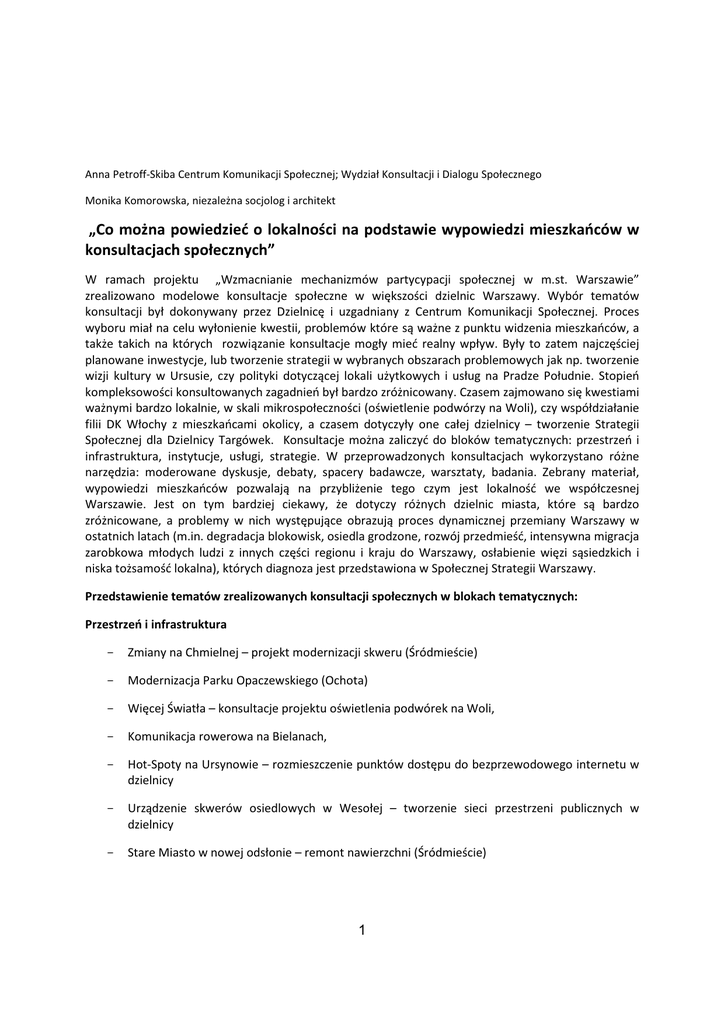 Anna Petroff-Skiba Centrum Komunikacji Społecznej; Wydział Konsultacji i Dialogu Społecznego Monika Komorowska, niezależna socjolog i architekt „Co można powiedzieć o lokalności na podstawie wypowiedzi mieszkańców w konsultacjach społecznych” W ramach projektu „Wzmacnianie mechanizmów partycypacji społecznej w m.st. Warszawie” zrealizowano modelowe konsultacje społeczne w większości dzielnic Warszawy. Wybór tematów konsultacji był dokonywany przez Dzielnicę i uzgadniany z Centrum Komunikacji Społecznej. Proces wyboru miał na celu wyłonienie kwestii, problemów które są ważne z punktu widzenia mieszkańców, a także takich na których rozwiązanie konsultacje mogły mieć realny wpływ. Były to zatem najczęściej planowane inwestycje, lub tworzenie strategii w wybranych obszarach problemowych jak np. tworzenie wizji kultury w Ursusie, czy polityki dotyczącej lokali użytkowych i usług na Pradze Południe. Stopień kompleksowości konsultowanych zagadnień był bardzo zróżnicowany. Czasem zajmowano się kwestiami ważnymi bardzo lokalnie, w skali mikrospołeczności (oświetlenie podwórzy na Woli), czy współdziałanie filii DK Włochy z mieszkańcami okolicy, a czasem dotyczyły one całej dzielnicy – tworzenie Strategii Społecznej dla Dzielnicy Targówek. Konsultacje można zaliczyć do bloków tematycznych: przestrzeń i infrastruktura, instytucje, usługi, strategie. W przeprowadzonych konsultacjach wykorzystano różne narzędzia: moderowane dyskusje, debaty, spacery badawcze, warsztaty, badania. Zebrany materiał, wypowiedzi mieszkańców pozwalają na przybliżenie tego czym jest lokalność we współczesnej Warszawie. Jest on tym bardziej ciekawy, że dotyczy różnych dzielnic miasta, które są bardzo zróżnicowane, a problemy w nich występujące obrazują proces dynamicznej przemiany Warszawy w ostatnich latach (m.in. degradacja blokowisk, osiedla grodzone, rozwój przedmieść, intensywna migracja zarobkowa młodych ludzi z innych części regionu i kraju do Warszawy, osłabienie więzi sąsiedzkich i niska tożsamość lokalna), których diagnoza jest przedstawiona w Społecznej Strategii Warszawy. Przedstawienie tematów zrealizowanych konsultacji społecznych w blokach tematycznych: Przestrzeń i infrastruktura - Zmiany na Chmielnej – projekt modernizacji skweru (Śródmieście) - Modernizacja Parku Opaczewskiego (Ochota) - Więcej Światła – konsultacje projektu oświetlenia podwórek na Woli, - Komunikacja rowerowa na Bielanach, - Hot-Spoty na Ursynowie – rozmieszczenie punktów dostępu do bezprzewodowego internetu w dzielnicy - Urządzenie skwerów osiedlowych w Wesołej – tworzenie sieci przestrzeni publicznych w dzielnicy - Stare Miasto w nowej odsłonie – remont nawierzchni (Śródmieście) 1 - Konsultacje remontu ul. Kawęczyńskiej, (Praga Północ) - Konsultacje dotyczące zagospodarowania planowanego centrum sportowego w Wawrze - Jak parkować na Człuchowskiej? – problem zbyt małej ilości miejsc parkingowych na terenie osiedla z lat 70tych (Bemowo) Instytucje Tutaj głównie zajmowano się rolą instytucji – głównie domów kultury w życiu dzielnicy i jej mieszkańców. - Kreatywne Włochy – rola domu kultury w animacji sąsiedzkiej, jak wspomagać lokalną społeczność - Dom Kultury w Rembertowie – jeden centralny dom kultury, czy osiedlowe domy kultury? - Białołęka na fali kultury – jak dotrzeć z animacją sąsiedzką i kulturalną do nieaktywnych mieszkańców? - Włącz się w kulturę w Ursusie – jakiej kultury potrzebują mieszkańcy Ursusa Usługi Zapotrzebowanie na usługi wśród mieszkańców dzielnicy - Konsultacje dotyczące przyszłości budynku dawnej kolejki wilanowskiej - Usługi na Pradze-Południe Strategie: - Strategia społeczna dla dzielnicy Targówek Dokładne informacje o konsultacjach są dostępne na stronie internetowej pod adresem: http://www.um.warszawa.pl/konsultacjespoleczne/ DEFINICJA LOKALNOŚCI – SKŁADOWE Jak może wyglądać definicja lokalności w oparciu o to co powiedzieli mieszkańcy w konsultacjach społecznych? Poniżej rekonstruujemy ją w odniesieniu do różnych wymiarów, w których się pojawiła: przestrzennego, dotyczącego dostępności usług, sąsiedzkiego, symbolicznego i instytucjonalnego. Lokalność jest różnie rozumiana w różnych dzielnicach Warszawy. Mają na nią wpływ charakter osiedli, zabudowy, ale i charakterystyka mieszkańców. Konsultacje społeczne są sytuacją, w której umożliwiamy mieszkańcom podjęcie dialogu z władzą lokalną, zakładają one dobrowolność udziału. Najczęściej biorą w nich udział mieszkańcy, dla których kwestie lokalne są ważne, więc trzeba pamiętać, że wnioski z nich płynące nie powinny być uogólniane na ogół populacji. 2 1. Wymiar przestrzenny Lokalność definiują w ważny sposób odległości. Mieszkańcy postrzegają ją poprzez to co jest blisko, co widzą z okna, gdzie najczęściej przechodzą idąc do domu: podwórko, ławka, plac zabaw, śmietnik, trawnik przed klatką, parking i to co jest dalej najbliższy warzywniak, sklep spożywczy, bar, kawiarnia, kiosk, szkoła, przychodnia, bazar, skwer, park, to miejsca gdzie można dojść pieszo, z wózkiem, lub dojechać na rowerze. Na sposób funkcjonowania lokalności ma wpływ też to co jest poza bezpośrednim miejscem zamieszkania: połączenie z centrum Warszawy/ innymi dzielnicami, dojazd do miejsca pracy, nauki, najbliższego centrum handlowego, czy supermarketu, ale także do kompleksu sportowego. Plac zabaw to jeden w najważniejszych elementów lokalnej przestrzeni, na który zwracają uwagę uczestnicy konsultacji. W osiedlach takich jak wolski Młynów place zabaw były lokalizowane na podwórkach, które teraz służą najczęściej mieszkańcom jako przestrzeń komunikacji: „nie ma tu placu zabaw, żebym widział dziecko z okna, trzeba chodzić daleko”; „tylko ślad po piaskownicy został,
