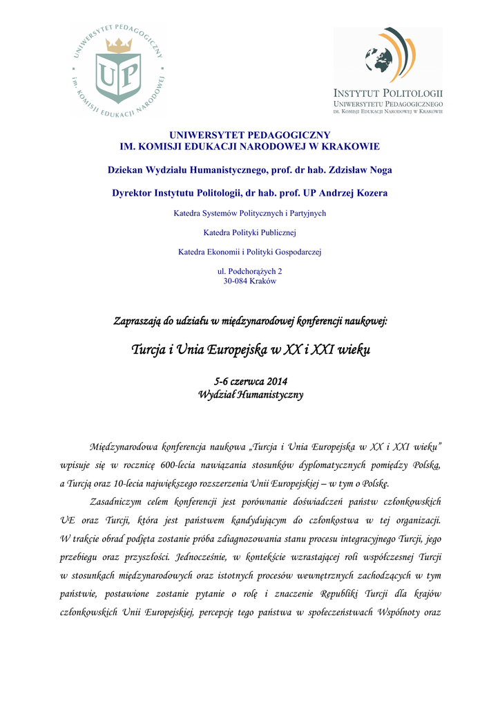 UNIWERSYTET PEDAGOGICZNY IM. KOMISJI EDUKACJI NARODOWEJ W KRAKOWIE Dziekan Wydziału Humanistycznego, prof. dr hab. Zdzisław Noga Dyrektor Instytutu Politologii, dr hab. prof. UP Andrzej Kozera Katedra Systemów Politycznych i Partyjnych Katedra Polityki Publicznej Katedra Ekonomii i Polityki Gospodarczej ul. Podchorążych 2 30-084 Kraków Zapraszają do udziału w międzynarodowej konferencji naukowej: Turcja i Unia Europejska w XX i XXI wieku 5-6 czerwca 2014 Wydział Humanistyczny Międzynarodowa konferencja naukowa „Turcja i Unia Europejska w XX i XXI wieku” wpisuje się w rocznicę 600-lecia nawiązania stosunków dyplomatycznych pomiędzy Polską, a Turcją oraz 10-lecia największego rozszerzenia Unii Europejskiej – w tym o Polskę. Zasadniczym celem konferencji jest porównanie doświadczeń państw członkowskich UE oraz Turcji, która jest państwem kandydującym do członkostwa w tej organizacji. W trakcie obrad podjęta zostanie próba zdiagnozowania stanu procesu integracyjnego Turcji, jego przebiegu oraz przyszłości. Jednocześnie, w kontekście wzrastającej roli współczesnej Turcji w stosunkach międzynarodowych oraz istotnych procesów wewnętrznych zachodzących w tym państwie, postawione zostanie pytanie o rolę i znaczenie Republiki Turcji dla krajów członkowskich Unii Europejskiej, percepcję tego państwa w społeczeństwach Wspólnoty oraz charakter wzajemnych kontaktów w zakresie takich kwestii jak bezpieczeństwo międzynarodowe, ekonomia, współpraca energetyczna i kulturowa. W toku obrad organizatorzy pragną zwrócić uwagę na następujące kwestie: • Historia kontaktów Turcji z państwami europejskimi • Historia, przebieg i doświadczenia procesów integracyjnych • Socjoekonomiczne wyzwania Unii Europejskiej • Wizerunek państw kandydujących w oczach społeczeństw państw członkowskich • Mniejszość turecka i muzułmańska w państwach członkowskich • System polityczny i partyjny Republiki Turcji • Rozszerzenie UE w myśli politycznej • Polityka zagraniczna Republiki Turcji • Strategia UE wobec Bałkanów i Bliskiego Wschodu • Bezpieczeństwo energetyczne UE, a Turcja • Kulturowe i religijne aspekty integracji europejskiej Podczas konferencji planowane są wykładowe obrady plenarne oraz panele dyskusyjne. Przemyślenia i wnioski płynące z obrad zostaną opublikowane w recenzowanym tomie. Konferencja została objęta patronatem honorowym Jego Magnificencji Rektora Uniwersytetu Pedagogicznego im. Komisji Edukacji Narodowej Prof. dr hab. Michała Śliwy ZAPRASZAMY! KOMITET NAUKOWY KONFERENCJI: Przewodniczący: dr hab. prof. UP Andrzej Kozera – Instytut Politologii UP Członkowie: • prof. Amir Aliyev – Wydział Prawa, Bakijski Uniwersytet Państwowy • prof. dr hab. Andrzej Antoszewski – Instytut Politologii, Uniwersytet Wrocławski • dr hab. prof. UP Stefan Bielański – Instytut Politologii, Uniwersytet Pedagogiczny im. KEN, Międzynarodowe Centrum Naukowo-Badawcze Mediterraneum • dr hab. prof. UG Tadeusz Dmochowski – Instytut Politologii, Uniwersytet Gdański • prof. dr hab. Waldemar Jan Dziak – Zakład Azji i Pacyfiku, Instytut Studiów Politycznych Polskiej Akademii Nauk • dr hab. prof. UP Stanisław Kilian – Instytut Politologii, Uniwersytet Pedagogiczny im. KEN • dr hab. prof. UP Roman Kochnowski – Instytut Politologii, Uniwersytet Pedagogiczny im. KEN • dr hab. prof. UP Andrzej Madera – Instytut Politologii, Uniwersytet Pedagogiczny im. KEN • prof. Rustam Mamedov – Wydział Prawa, Bakijski Uniwersytet Państwowy • prof. dr hab. Ewa Maj – Zakład Myśli Politycznej, Uniwersytet Marii Curie-Skłodowskiej • prof. Rafiq Manafoğlu Novruzov – Narodowy Uniwersytet Lingwistyczny w Kijowie • dr hab. prof. UG Andrzej Ożarowski – Instytut Politologii, Uniwersytet Gdański • dr hab. prof. UP Janina Pach – Instytut Politologii, Uniwersytet Pedagogiczny im. KEN • dr hab. prof. UG Grzegorz Piwnicki – Instytut Politologii, Uniwersytet Gdański • prof. Afsar Sadygov – Wydział Prawa, Bakijski Uniwersytet Państwowy • prof. Francesco Sidoti – Uniwersytet w L`Aquila • dr hab. prof. UP Katarzyna Sobolewska-Myślik – Instytut Politologii, Uniwersytet Pedagogiczny im. KEN • prof. dr Faruk Sönmezoğlu – Instytut Stosunków Międzynarodowych, Uniwersytet Stambulski • prof. dr hab. Jacek Sroka – Instytut Politologii, Uniwersytet Wrocławski • prof. dr Robert Štefko – Uniwersytet Preszowski • prof. dr Mustafa Türkeş – Instytut Stosunków Międzynarodowych, Uniwersytet Techniczny Bliskiego Wschodu w Ankarze WSPÓŁORGANIZATORZY: Uniwersytet Stambulski, Bakijski Uniwersytet Państwowy, Uniwersytet Preszowski, Uniwersytet w L`Aquila, Narodowy Uniwersytet Lingwistyczny w Kijowie, Uniwersytet Wrocławski, Uniwersytet Marii Curie-Skłodowskiej w Lublinie, Uniwersytet Gdański, Zakład Azji i Pacyfiku ISP PAN, Międzynarodowe Centrum Naukowo-Badawcze Mediterraneum KOMITET ORGANIZACYJNY: dr Karol Bieniek (Instytut Politologii UP)– przewodniczący dr Özgün Erler-Bayır (Instytut Stosunków Międzynarodowych, Uniwersytet Stambulski) dr Maciej Herbut (Instytut Politologii, Uniwersytet Wrocławski) dr Robert Kłaczyński (Instytut Politologii UP) dr Urszula Kosielińska-Grabowska (Instytut Politologii UP) dr Łukasz Kozera (Instytut Politologii UP) dr Paulina Szyja (Instytut Politologii UP) dr Barbara Węglarz (Instytut Politologii UP) Języki konferencji: polski i angielski Miejsce obrad: Uniwersytet Pedagogiczny im. KEN, ul. Podchorążych 2 Opłata konferencyjna w wysokości 300 zł obejmuje: przerwy kawowe, obiad, uroczystą kolację w pierwszym dniu konferencji, materiały konferencyjne, publikację referatów w formie recenzowanego tomu. Zakwaterowanie: Organizatorzy nie zapewniają zakwaterowania uczestników. Zgłoszenie udziału: Kartę zgłoszeniową należy przesłać drogą mailową lub tradycyjną do dnia 6 maja 2014 r. Opłatę konferency