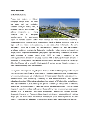 Woda – nasz skarb Karolina Skalska-Józefowicz Polska jest krajem, w których występuje deficyt wody. Jak ubogi jest nasz kraj pod względem zasobów wodnych ilustruje fakt, iż dostępne zasoby w przeliczaniu na jednego mieszkańca są o połowę mniejsze niż i porównywalne w do Hiszpanii pustynnego Egiptu !!! Ponadto zasoby wodne Polski cechują się dużą zmiennością sezonową i nierównomiernością rozmieszczenia terytorialnego. Wody w Polsce jest coraz mniej a do tego jest ona mocno zanieczyszczona, co jest szczególnie niekorzystne dla Morza Bałtyckiego, które ze względu na uwarunkowania geograficzne, jest ekosystemem wyjątkowo podatnym na skażenia. Zachodzi w nim bardzo mała wymiana wody, ponieważ Bałtyk posiada połączenie z oceanem tylko poprzez wąskie cieśniny. Oznacza to, że ta sama woda pozostaje w naszym morzu przez 25-30 lat, wraz z zawartymi w niej zanieczyszczeniami. Dodatkowo sytuację pogarsza fakt, że Bałtyk jest morzem zimnym, co powoduje, że biodegradacja chemikaliów zachodzi w nim znacznie dłużej niż w cieplejszym zbiorniku. Dlatego też w ostatnich latach podjętych zostało szereg inicjatyw mającym na celu zarówno ochronę wód i jak też klimatu. Aby wypełnić zobowiązania przyjęte przez Polskę w Traktacie Akcesyjnym powstał Krajowy Program Oczyszczania Ścieków Komunalnych. Zgodnie z jego założeniami, Polska powinna wybudować, rozbudować lub zmodernizować 318 oczyszczalni ścieków oraz rozbudować i zmodernizować sieci kanalizacji sanitarnej w 459 miejscowościach. Aby wypełnić zobowiązania wobec UE jesteśmy zobowiązani do redukcji o 75% ładunków azotu i fosforu które odpowiedzialne są za eutrofizację tzn. proces nadmiernego wzbogacania w substancje pokarmowe zbiorników wodnych. Realizując nasze zobowiązania wobec Unii Europejskiej ale przede wszystkim wobec środowiska wybudowaliśmy wiele nowoczesnych oczyszczalni ścieków, m.in. w Krakowie, Warszawie, Białymstoku, Bydgoszczy, Toruniu, Gdańsku, Szczecinie, Poznaniu czy Wrocławiu, które stały się wizytówkami polskie zielonych inicjatyw. Dzięki tym, nie da się ukryć kosztownym inwestycjom, plaże nad Bałtykiem są aktualnie jednymi z najczystszych w Europie, czystszymi od słynnych plaż na Lazurowym Wybrzeżu. Do poprawienia czystości wody w Zatoce Gdańskiej w znaczący sposób przyczyniło się uruchomienie w minionym roku w Warszawie najnowocześniejszej i jednej z największych w Europie oczyszczalni ścieków „Czajka”. Inwestycja ta powstawała z zachowaniem szczególnej dbałości o środowisko i zasady zrównoważonego rozwoju. Oprócz zastosowania technologii oczyszczania z najwyższej półki może pochwalić się wykorzystaniem potencjału energetycznego produktów ubocznych powstających w procesie do produkcji „zielonej energii” elektrycznej i cieplnej. Wyprodukowana energia służy własnym potrzebom oczyszczalni, ograniczając w ten sposób emisję CO2 i koszty funkcjonowania obiektu. Oszczędzaj i dbaj o wodę Woda to podstawa życia i zdrowia. Niby wszyscy o tym wiemy, ale zbyt często o tym zapominamy a zdecydowanie nie powinniśmy, bo woda to aż 70-75 procent masy naszego ciała. Znajduje się w mięśniach, płucach, wątrobie, kościach, w każdej komórce i w płynach ustrojowych. Bierze udział w ważnych życiowych procesach. Dlatego dbanie o naturalne zasoby wodne i oszczędzanie wody powinno być codziennym działaniem każdego człowieka. Obojętnie od czego zaczniemy czy od zakręcania wody w trakcie mycia zębów, czy zdecydujemy się na odzyskiwanie wody deszczowej na potrzeby gospodarstwa domowego ważne jest, abyśmy zdawali sobie sprawę z wagi problemu. Ponadto nie możemy zapominać, że najważniejszym, jedynym odnawialnym źródłem wody do picia jest woda deszczowa. Każdy z nas powinien ją chronić, cenić i szanować - dobrze wykorzystywana będzie służyć wszystkim, natomiast niezagospodarowana może spowodować poważne zagrożenia: podtopienia, powodzie czy skażenie środowiska. Ty też możesz być EKO! Pamiętajmy że racjonalnym korzystaniem z wody nie tylko wspieramy nasz domowy budżet, ale także przyczyniamy się do ograniczenia deficytu zasobów wody w naszym kraju oraz zmniejszenia zużycia energii, co przekłada się na ochronę klimatu i środowiska naturalnego. Dlatego, Używajmy do kąpieli natrysku, zamiast wanny. Nie dość, że bez porównania bardziej higieniczny, to także dużo bardziej oszczędny dający oszczędność wody nawet do 40 m3 rocznie. Zakręcajmy wodę podczas mycia zębów, golenia i innych czynności wykonywanych przy umywalce a dzięki temu czteroosobowa rodzina zaoszczędzi rocznie nawet ponad 36 m3. Uszczelnijmy spłuczki w toaletach oraz nieszczelne baterie przy umywalkach, 3 zlewozmywakach czy wannach i dzięki temu zaoszczędzisz nawet do 30 m wody rocznie. Unikajmy zbędnego spłukiwania toalety na przykład po wrzucaniu do niej śmieci. Pamiętajmy, że miska ustępowa, to nie jest śmietnik. Jeśli mieszkamy w domu jednorodzinnym zagospodarujmy wody deszczowe z własnej posesji, ta woda nic nie kosztuje! Jeśli chcesz dowiedzieć się więcej to zapraszamy na niepowtarzalną wystawę „Zielony klimat”, która odbędzie się w Warszawie w trakcie światowej konferencji klimatycznej ONZ COP 19 w dniach 12-22 listopada 2013 roku w Pałacu Kultury i Nauki.