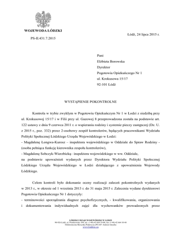 WOJEWODA ŁÓDZKI Łódź, 24 lipca 2015 r. PS-II.431.7.2015 Pani Elżbieta Borowska Dyrektor Pogotowia Opiekuńczego Nr 1 ul. Krokusowa 15/17 92-101 Łódź WYSTĄPIENIE POKONTROLNE Kontrola w trybie zwykłym w Pogotowiu Opiekuńczym Nr 1 w Łodzi z siedzibą przy ul. Krokusowej 15/17 i w Filii przy ul. Gazowej 8 przeprowadzona została na podstawie art. 122 ustawy z dnia 9 czerwca 2011 r. o wspieraniu rodziny i systemie pieczy zastępczej (Dz. U. z 2015 r., poz. 332) przez 2-osobowy zespół kontrolerów, będących pracownikami Wydziału Polityki Społecznej Łódzkiego Urzędu Wojewódzkiego w Łodzi: - Magdalenę Łongwa-Kurosz – inspektora wojewódzkiego w Oddziale do Spraw Rodziny (osoba pełniąca funkcję kierownika zespołu kontrolerów), - Magdalenę Sobczyk-Wierzbicką– inspektora wojewódzkiego w ww. Oddziale, na podstawie upoważnień wydanych przez Dyrektora Wydziału Polityki Społecznej Łódzkiego Urzędu Wojewódzkiego w Łodzi działającego z upoważnienia Wojewody Łódzkiego. Celem kontroli było dokonanie oceny realizacji zaleceń pokontrolnych wydanych w 2013 r., w okresie od 1 września 2013 r. do 31 maja 2015 r. Zalecenia wydane dyrektorowi Pogotowia Opiekuńczego Nr 1 dotyczyły: - terminowości sporządzania diagnoz psychofizycznych, - kwalifikowania, organizowania i dokumentowania indywidualnych zajęć dla wychowanków prowadzonych przez ŁÓDZKI URZĄD WOJEWÓDZKI W ŁODZI 90-926 Łódź, ul. Piotrkowska 104, tel.: (+48) 42 664 10 00, fax: (+48) 42 664 10 40 Elektroniczna Skrzynka Podawcza ePUAP: /lodzuw/skrytka www.lodzkie.eu specjalistów, - dokumentowania działalności pracy opiekuńczo-wychowawczej oraz działalności zespołu ds. okresowej oceny sytuacji dziecka, - sprawdzania wykonywania przez pracowników zaleceń dyrektora i wicedyrektora wydanych w związku ze sprawowanym nadzorem nad pracą pracowników merytorycznych. W okresie objętym kontrolą na stanowisku dyrektora jednostki kontrolowanej zatrudniona była Pani Elżbieta Borowska, na stanowisku zastępcy dyrektora – Pani Małgorzata Marczak. Czynności kontrolne przeprowadzone zostały w dniach 17-19 czerwca 2015 r. Na podstawie przedłożonych kontrolującym dokumentów ustalono, że w Pogotowiu przy ul. Krokusowej 15/17 umieszczonych było 30 dzieci, a w Filii przy ul. Gazowej 8 – 23 dzieci (dowody kontroli str. 48-59). W celu dokonania oceny realizacji zaleceń pokontrolnych wydanych w 2013 r. poproszono o udostępnienie dokumentów potwierdzających podejmowane na rzecz dzieci działania opiekuńczo-wychowawcze, kwalifikowanie, organizowanie i dokumentowanie indywidualnych zajęć dla wychowanków prowadzonych przez specjalistów, dokonywanie oceny sytuacji dziecka oraz sporządzanie diagnoz psychofizycznych (diagnoz psychofizycznych, planów pomocy dziecku, kart pobytu wybranych wychowanków, protokołów ze spotkań zespołu do spraw okresowej oceny sytuacji dziecka): - wychowanka ur. 06.01.2004 r. przebywającego w Placówce od.28.11.2014 r., - wychowanka ur. 24.06.2010 r. przebywającego w Placówce od 25.05.2015 r., - wychowanki ur. 03.08.1999 r. przebywającej w Placówce od 11.03.2015 r., - wychowanka ur. 13.01.2003 r. przebywającego w Placówce od 19.02.2015 r., - wychowanka ur. 02.08.2001 r. przebywającego w Placówce od 23.10.2014 r., - wychowanka ur. 13.12.2006 r. przebywającego w Placówce od 23.10.2014 r. (co stanowi 11,3 % dokumentacji wszystkich dzieci umieszczonych w Placówce). Dodatkowo poproszono o karty pobytu następujących wychowanków: - chłopca ur. 27.06.1999 r. umieszczonego w Pogotowiu 27.03.2015 r., - dziewczynki ur. 05.07.2001 r. umieszczonej w Pogotowiu 02.02.2015 r., ŁÓDZKI URZĄD WOJEWÓDZKI W ŁODZI 90-926 Łódź, ul. Piotrkowska 104, tel.: (+48) 42 664 10 00, fax: (+48) 42 664 10 40 Elektroniczna Skrzynka Podawcza ePUAP: /lodzuw/skrytka www.lodzkie.eu - dziewczynki ur. 02.06.1998 umieszczonej w Pogotowiu 11.03.2015 r, - chłopca ur. 02.12.1998 r, umieszczonego w Pogotowiu 02.07.2014 r., - dziewczynki ur. 05.02.2000 r. umieszczonej w Pogotowiu 09.03.2015 r., - dziewczynki ur. 28.10.2007 r. umieszczonej w Pogotowiu 09.06.2014 r., (łącznie kontroli poddano 22,6 % kart pobytu wszystkich dzieci przebywających w Placówce). Ustaleń kontrolnych dokonano na podstawie przedłożonych kontrolującym dokumentów (dowody kontroli str. 19 – 250), w oparciu o rozmowę z dyrektorem Placówki Panią Elżbietą Borowską i pedagogami: Panią Martą Maciaszczyk-Jachtoma (zatrudnioną w Pogotowiu przy ul. Krokusowej 15/17) i Panią Agnieszką Lewy (zatrudnioną w Filii Pogotowia przy ul. Gazowej 8). W rozmowach nie uczestniczyła Pani Małgorzata Marczak – zastępca dyrektora korzystająca z urlopu wypoczynkowego. Nie przeprowadzono również rozmów z psychologami (psycholog pracujący w Pogotowiu przy ul. Krokusowej 15/17 przebywał na zwolnieniu lekarskim, a z psychologiem zatrudnionym w Filii Pogotowia przy ul. Gazowej 8 nie została przedłużona umowa o pracę, która obowiązywała do 30.04.2015 r.). Podczas czynności kontrolnych stwierdzono, że: - dzieci kwalifikowane są do udziału w specjalistycznych zajęciach zgodnie z ich indywidualnymi potrzebami (dowody kontroli str. 177-180, 60-75), - specjalistyczne zajęcia indywidualne organizowane są przez pedagogów zgodnie ze zdiagnozowanymi potrzebami wychowanków; zajęcia te są właściwie dokumentowane (dowody kontroli str. 139-146), - indywidualna praca psychologów z wychowankami polega głównie na prowadzeniu rozmów (wychowawczych, wyciszających), których tematyka wynika z bieżącej sytuacji dziecka; na podstawie przedłożonych dokumentów oraz z uwagi na brak możliwości przeprowadzenia rozmowy z psychologami nie ustalono, czy zajęcia te są zaplanowane i ukierunkowane na osiągnięcie konkretnego celu (dowody kontroli str. 101 – 104, 113-120), - diagnozy psychofizyczne sporządzane są w terminie wskazanym w § 14 rozporządzenia Ministra Pracy i Polityki Społecznej z 