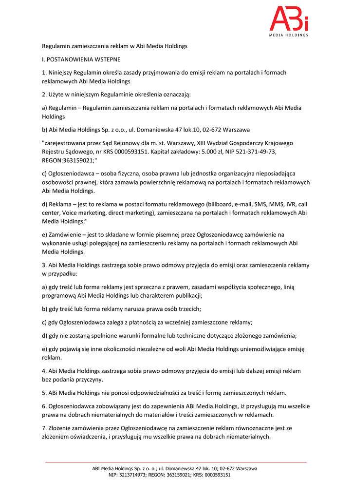 Regulamin zamieszczania reklam w Abi Media Holdings I
