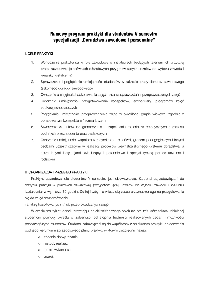 Ramowy program praktyki dla studentów V semestru specjalizacji „Doradztwo zawodowe i personalne” I. CELE PRAKTYKI 1. Wchodzenie praktykanta w role zawodowe w instytucjach będących terenem ich przyszłej pracy zawodowej (placówkach oświatowych przygotowujących uczniów do wyboru zawodu i kierunku kształcenia) 2. Sprawdzenie i pogłębienie umiejętności studentów w zakresie pracy doradcy zawodowego (szkolnego doradcy zawodowego) 3. Ćwiczenie umiejętności dokonywania zajęć i pisania sprawozdań z przeprowadzonych zajęć 4. Ćwiczenie umiejętności przygotowywania konspektów, scenariuszy, programów zajęć edukacyjno-doradczych 5. Pogłębianie umiejętności przeprowadzenia zajęć w określonej grupie wiekowej zgodnie z opracowanym konspektem / scenariuszem 6. Stworzenie warunków do gromadzenia i uzupełniania materiałów empirycznych z zakresu podjętych przez studenta prac badawczych 7. Ćwiczenie umiejętności współpracy z dyrektorem placówki, gronem pedagogicznym i innymi osobami uczestniczącymi w realizacji procesów wewnątrzszkolnego systemu doradztwa, a także innymi instytucjami świadczącymi poradnictwo i specjalistyczną pomoc uczniom i rodzicom II. ORGANIZACJA I PRZEBIEG PRAKTYKI Praktyka zawodowa dla studentów V semestru jest obowiązkowa. Studenci są zobowiązani do odbycia praktyki w placówce oświatowej (przygotowującej uczniów do wyboru zawodu i kierunku kształcenia) w wymiarze 50 godzin. Do tej liczby nie wlicza się czasu przeznaczonego na przygotowanie się do zajęć oraz omówienie i analizę hospitowanych i / lub przeprowadzanych zajęć. W czasie praktyk studenci korzystają z opieki zakładowego opiekuna praktyk, który zakres udzielanej studentom pomocy określa w zależności od stopnia trudności realizowanych zadań i możliwości poszczególnych studentów. Studenci zobowiązani są do współpracy z opiekunem praktyk i opracowania pod jego kierunkiem szczegółowego planu praktyki, w którym uwzględnić należy: • zadania do wykonania • metody realizacji • termin wykonania • uwagi. Praktyka ma charakter czynny, w związku z tym hospitacje i formy biernego uczestnictwa w zajęciach powinny być ograniczone do niezbędnego minimum. III. ZADANIA PRAKTYKI 1. Zdobycie orientacji o charakterze i sposobach pracy placówki oświatowej oraz jej specyficznych zadaniach w zakresie doradztwa 2. Aktywny udział w zadaniach placówki oraz działaniach ukierunkowanych na doradztwo zawodowe i szeroko rozumianą orientację zawodową 3. Zapoznanie się z metodami, technikami i narzędziami diagnostycznymi stosowanymi w praktyce doradczej danej placówki 4. Hospitowanie wybranych zajęć, realizowanych przez kadrę placówki, przygotowujących uczniów do wyboru zawodu i/lub kierunku kształcenia 5. Przeprowadzenie zajęć dydaktycznych zakresu doradztwa zawodowego na podstawie uprzednio przygotowanych i zatwierdzonych przez opiekuna scenariuszy IV. ZADANIA PLACÓWKI 1. Wyznaczenie zakładowego opiekuna praktyk 2. Ustalenie planu praktyki 3. Zapoznanie studentów z pracą placówki oraz ustalenie form pracy 4. Sprawowanie nadzoru nad wykonaniem planu praktyki oraz udzielanie pomocy w przygotowywaniu i prowadzeniu zajęć realizowanych przez studentów 5. Omawianie ze studentami wykonanych przez nich zadań 6. Zaliczenie praktyki w formie opinii i oceny (niezbędny jest stempel placówki) V. DOKUMENTACJA PRAKTYKI Na każdym etapie praktyki studenci dokumentują swoją pracę i przedstawiają: 1. sprawozdania z hospitowanych zajęć 2. konspekty / scenariusze, programy przeprowadzonych zajęć z zakresu doradztwa zawodowego w formach grupowych i/lub indywidualnych 3. wyniki realizowanych zadań szczegółowych, ustalonych (w porozumieniu z opiekunem z ramienia placówki) w planie praktyki 4. wpisy do dziennika praktyk (plan praktyki, wykonywanie zadań w kolejnych dniach potwierdzone podpisem opiekuna z ramienia placówki) VI. WARUNKI ZALICZENIA Zaliczenia praktyki dokonuje opiekun dydaktyczny z ramienia Wyższej Szkoły Komunikacji i Zarządzania w Poznaniu, po przeanalizowaniu dokumentacji. Podstawą zaliczenia jest: 1. odbycie praktyki w wyznaczonym terminie 2. otrzymanie pozytywnej oceny od opiekuna praktyki z ramienia placówki (przedstawienie opinii o przebiegu i wynikach praktyki pedagogicznej) 3. prowadzenie dzienniczka praktyk z uwzględnieniem dokumentacji wymienionej w punkcie V (1, 2, 3) 4. przedstawienie sprawozdania z odbytych praktyk (osobista refleksja)