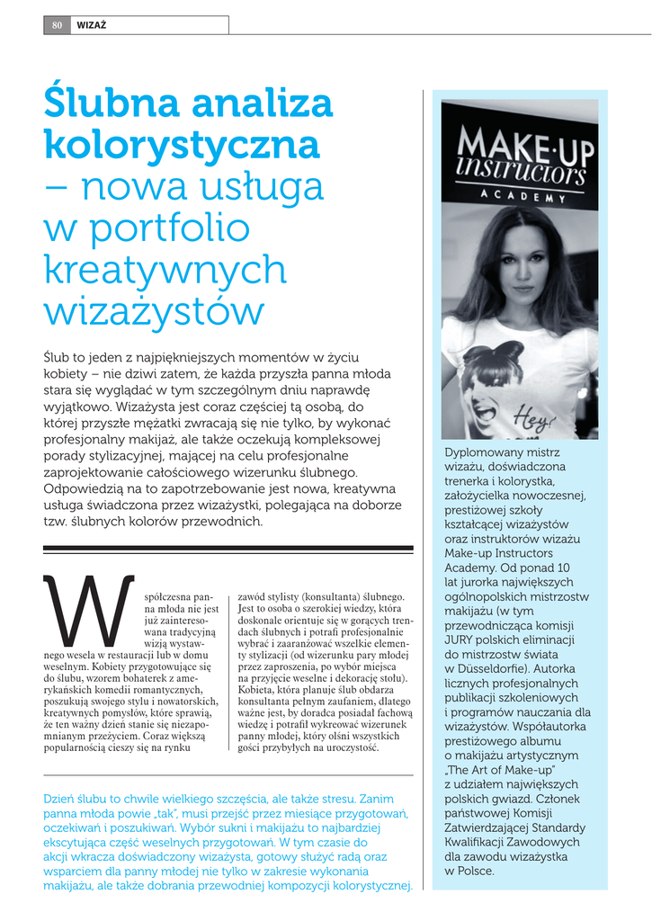 80 wizaż Ślubna analiza kolorystyczna – nowa usługa w portfolio kreatywnych wizażystów Ślub to jeden z najpiękniejszych momentów w życiu kobiety – nie dziwi zatem, że każda przyszła panna młoda stara się wyglądać w tym szczególnym dniu naprawdę wyjątkowo. Wizażysta jest coraz częściej tą osobą, do której przyszłe mężatki zwracają się nie tylko, by wykonać profesjonalny makijaż, ale także oczekują kompleksowej porady stylizacyjnej, mającej na celu profesjonalne zaprojektowanie całościowego wizerunku ślubnego. Odpowiedzią na to zapotrzebowanie jest nowa, kreatywna usługa świadczona przez wizażystki, polegająca na doborze tzw. ślubnych kolorów przewodnich. W spółczesna panna młoda nie jest już zainteresowana tradycyjną wizją wystawnego wesela w restauracji lub w domu weselnym. Kobiety przygotowujące się do ślubu, wzorem bohaterek z amerykańskich komedii romantycznych, poszukują swojego stylu i nowatorskich, kreatywnych pomysłów, które sprawią, że ten ważny dzień stanie się niezapomnianym przeżyciem. Coraz większą popularnością cieszy się na rynku zawód stylisty (konsultanta) ślubnego. Jest to osoba o szerokiej wiedzy, która doskonale orientuje się w gorących trendach ślubnych i potrafi profesjonalnie wybrać i zaaranżować wszelkie elementy stylizacji (od wizerunku pary młodej przez zaproszenia, po wybór miejsca na przyjęcie weselne i dekorację stołu). Kobieta, która planuje ślub obdarza konsultanta pełnym zaufaniem, dlatego ważne jest, by doradca posiadał fachową wiedzę i potrafił wykreować wizerunek panny młodej, który olśni wszystkich gości przybyłych na uroczystość. Dzień ślubu to chwile wielkiego szczęścia, ale także stresu. Zanim panna młoda powie „tak”, musi przejść przez miesiące przygotowań, oczekiwań i poszukiwań. Wybór sukni i makijażu to najbardziej ekscytująca część weselnych przygotowań. W tym czasie do akcji wkracza doświadczony wizażysta, gotowy służyć radą oraz wsparciem dla panny młodej nie tylko w zakresie wykonania makijażu, ale także dobrania przewodniej kompozycji kolorystycznej. Dyplomowany mistrz wizażu, doświadczona trenerka i kolorystka, założycielka nowoczesnej, prestiżowej szkoły kształcącej wizażystów oraz instruktorów wizażu Make-up Instructors Academy. Od ponad 10 lat jurorka największych ogólnopolskich mistrzostw makijażu (w tym przewodnicząca komisji JURY polskich eliminacji do mistrzostw świata w Düsseldorfie). Autorka licznych profesjonalnych publikacji szkoleniowych i programów nauczania dla wizażystów. Współautorka prestiżowego albumu o makijażu artystycznym „The Art of Make-up” z udziałem największych polskich gwiazd. Członek państwowej Komisji Zatwierdzającej Standardy Kwalifikacji Zawodowych dla zawodu wizażystka w Polsce. 01/2015 Większość wizażystek może utrzymać się w zawodzie tylko dzięki zamówieniom na makijaże ślubne – konkurencja na rynku jest ogromna, a dodatkowym utudnieniem jest fakt, że ta praca charakteryzuje się dużą sezonowością. Wizażystki, które wprowadziły do oferty szybką, kreatywną usługę analizy ślubnej uzyskały nie tylko dodatkowy przychód z każdej klientki, ale także wzmocniły swój prestiż profesjonalistki. Każda przyszła panna młoda z pewnością wybierze ofertę osoby, która zajmuje się nie tylko makijażem, ale także potrafi skoordynować różne elementy wizerunku ślubnego tak, by tworzyły spójną całość. beauty inspiration 81 Należy pamiętać że na wizerunek panny młodej składa się wiele elementów, aby uzyskać jak najbardziej dopracowany efekt wszystkie te elementy powinny zachowywać ten sam styl, ten sam kod estetyczny. Nie każdy wizażysta ma dostatecznie dużą wiedze, aby sprostać takiemy wyzwaniu i świadczyć usługę konsultacji ślubnej w tak szerokim zakresie. Dlatego w 2015 r. pojawiła się na rynku nowa forma doradztwa ślubnego, znacznie uproszczona, a jednocześnie niezwykle kreatywna i potrzebna – tzw. ślubna analiza kolorystyczna. NOWA SPECJALIZACJA – KOLORYSTA ŚLUBNY Ogromną zaletą usługi ślubnej analizy kolorystycznej jest fakt, że wykonuje się ją bardzo szybko, w podstawowej wersji trwa od 45-60 min i jest prawie bezkosztowa. Polega na dobraniu bieli ślubnej oraz tzw. ślubnych kolorów przewodnich, które przyszła panna młoda wykorzystuje do skoordynowania wszystkich elementów oprawy ślubnej. w tym: makijażu, dodatków, zaproszeń, aranżacji sali weselnej etc. Dzięki zachowaniu ujednoliconej gamy barw cała oprawa ślubna sprawia wrażenie wyjątkowej, przemyślanej i dopracowanej. Usługę ślubnej analizy kolorystycznej wykonuje się przy pomocy specjalnego zestawu akcesoriów, dzięki którym wizażystka nie musi sama wymyślać kompozycji ślubnej dla klientki, a jedynie wybrać spośród gotowych propozycji, tę która najkorzystniej podkreśla urodę przyszłej Panny Młodej i dać jej gotowy pomysł na piękny, nowoczesny wizerunek ślubny. Etapy ślubnej analizy kolorystycznej I etap – dobór bieli ślubnej Śnieżna biel to odcień, który pasuje niewielu kobietom. Na szczęście od kilku lat w modzie ślubnej odchodzi się od tradycyjnego podejścia do koloru sukni ślubnej, a salony oferują kreacje w wielu odcieniach. Pierwszy etap analizy ślubnej polega na doborze bieli ślubnej, która pasuje do typu kolorystycznego klientki, przy pomocy chust w odcieniach: od kredowej bieli, przez ecru po ciemną tonację szampana. Test wykonuje się przy pomocy chust, wykonanych z oryginalnych tkanin wykorzystywanych w produkcji sukien ślubnych. Odpowiednio dobrany odcień bieli podkreśli naturalne piękno przyszłej panny młodej. Warto pamiętać, że każdy typ kolorystyczny posiada biel, w której wygląda najkorzystniej. Wizażystka zaznacza wybrany odcień bieli ślubnej na karcie wynikowej (tzw. Wedding Color Planner) którą klientka otrzymuje po zako