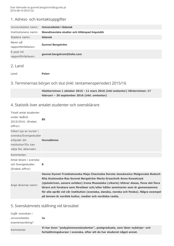 Svar lämnade av [email protected] 2016-08-10 09:57:32 1. Adress- och kontaktuppgifter Universitetets namn: Universitetet i Gdansk Institutionens namn: Skandinaviska studier och tillämpad lingvistik Stadens namn: Gdansk Namn på rapportförfattaren: E-post till rapportförfattaren: Gunnel Bergström [email protected] 2. Land Land: Polen 3. Terminernas början och slut (inkl. tentamensperioder) 2015/16 Höstterminen 1 oktober 2015 - 11 mars 2016 (inkl omtentor) Vårterminen: 17 februari – 30 september 2016 (inkl. omtentor) 4. Statistik över antalet studenter och svensklärare Totalt antal studenter under läsåret 2015/2016. (Endast 85 siffror) Vilken typ av kurser i svenska/Sverigestudier erbjuder din Huvudämne institution?Du kan välja fler alternativ Kommentar: Antal lärare i svenska och Sverigestudier. 8 (Endast siffror) Hanna Dymel-Trzebiatowska Maja Chacinska Dorota Janukowicz Malgorzata Boduch Rita Kozlowska-Ras Gunnel Bergström Marta Grzechnik Anna Kowalczyk Ange lärarnas namn: (sjukskriven, senare avliden) Irena Muszalska (vikarie) Utöver dessa, finns det flera lärare och forskare som föreläser och/eller håller seminarier som är gemensamma för alla språk vid vår institution (svenska, danska, norska och finska). Några exempel på ämnen är nordisk kultur, medier och nordiska realia. 5. Svenskämnets ställning vid lärosätet Ingår svenskan i universitetets Ja examensordning? Kommentar Vi har även "podyplomowestudenter", postgraduate, som läser nybörjar- och fortsättningskurser i svenska, efter att de har studerat något annat. 6. Intresset för att läsa svenska på ditt universitet Redogör för intresset för kurser i svenska eller Sverigestudier, t.ex. om svensk litteratur, kultur och svenskt samhällsliv. Upplever du att det finns ett ökat eller Vi har hela tiden ett stort och växande intresse för svenska. Vår linje har flera år i rad haft över 10 sökande per plats till nybörjarkursen. Varje år har vi över 20 studenter som läser på första, andra och tredje året på kandidatnivå. Det finns ett stort intresse för svensk kultur och litteratur (allt från Barnen i Bullerbyn, som de flesta har läst som barn, till Wallander), film, svensk natur och svenskt samhällsliv (demokrati och tolerans, hbtq-frågor, jämställdhet, miljöfrågor) minskat intresse? Varför läser Se ovan. Många tycker helt enkelt att svenska är ett vackert språk. Svenskan har en studenterna svenska – ”charmerande" prosodi, har någon sagt. ☺ Många vill resa till Sverige och studera vad är deras och/eller arbeta där. Många vill arbeta med svenska företag och/eller polska företag motivation? som har kontakter med Sverige. Inte så många vill dock flytta till Sverige för gott. Om svenska inte är studenternas huvudämne, vilken är huvudinriktningen på studierna? Alla har, som sagt, svenska som huvudämne. Men flera läser också andra ämnen. Några exempel är andra språk, juridik, psykologi, samhällsvetenskap, arkitektur och teknik. Under det senaste har en student lläst kinesiska och ett par studenter valt finska, som är ett nytt ämne vid vår institution. Det finns ganska många småföretag i norra Polen som samarbetar med Sverige Flera av våra före detta studenter arbetar på firmor som exporterar fönster och stål till Sverige. Under de senaste åren har studenter fått praktiplats och/eller jobb med logistik och svenska på det finska kemiföretaget Kemira. I området finns också Ikea och Arla. Ganska många arbetar med bokföring och/eller kundkontakter och svenska Vilken användning har på olika polska företag (varav flera företag är medlemmar i Polsk-svenska de av sina handelskammaren.). Nytt för i år är att kulturförvaltningen i Gdynia renoverar den f d svenskstudier senare? svenska sjömanskyrkan och har redan erbjudit några studenter praktik för att bland annat bättre dokumentera husets alla anknytningar till Sverige för framtida nordiska evenemang. Under det andra och/eller tredje året praktik hos främst polska arbetsgivare som behöver svenska. Några studenter har blivit tolkar och/eller översättare och/eller lärare vid språkskolor. Många arbetar som guider på Stena Line (Karlskrona-Gdynia) Görs det någon uppföljning av studenterna och deras Ja sysselsättning? Vi började göra en enkät under våren 2016, i samband med institutionens jubileum. Om ja, på vilket sätt? Av olika skäl blev den inte klar i tid, men förhoppningen är att ta reda på åtminstone vart våra magistrar har tagit vägen. 7. Undervisningens uppdelning Åk 1: praktisk svenska (AK, GB, MG) deskriptiv svensk grammatik (MBI praktisk fonetik (AK) Åk 2: praktisk svenska (DJ, GB), deskriptiv svensk grammatik (MB) litteratur, Åk 3: praktisk svenska (MB, GB, RKR), akademiskt skrivande (GB), translatorik (DJ) Kandidatuppsats (olika handledare) Åk 4: praktisk svenska (GB, DJ), översättning av brukstexter (DJ), ordförråd (DJ) Åk 5: praktisk svenska (GB, AK) magisteruppsats, litterär översättning (HDT), översättning av brukstexter (MC) Modern nordisk kultur (HDT) Studenterna läser även vissa kurser tillsammans med danska och norska linjerna, till exempel retorik, engelska och nordiskt samhällsliv. 8. Undervisningens innehåll Egna texter, aktuella tidningsartiklar (ofta parallella svenska och polska texter med liknande innehåll), skönlitteratur, facklitteratur, rollspel, test av SI:s webbkurs för kurs 1. Skypemöte med generaldirektören för Sveriges kommuner och landsting. Under våren 2016 blev studenternas elektroniska guidebok om Trestaden klar, se http://bit.ly/StdGui Konsekutiv och simultantolkning i studio. Syntolkning av kortare filmer i tolkstudio. Radio- och tv-program. Uttalsboken, Skepp o´hoj. Suggestopedihäftet Carpe Diem (för ett lärande med och till alla sinnen), föredrag, seminarier, ett lajv/rollspel om en svensk kung och olika landskap, matlagning. Tankekartor, haikudikter. Troll 1, Troll 2, Nybör