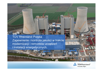 TÜV Rheinland Polska Zapewnienie i kontrola jakości w trakcie modernizacji i remontów urządzeń i instalacji energetycznych. Plan prezentacji • Marka TÜV Rheinland • Zakres usług dla sektora energetycznego • Zintegrowany proces kontroli jakości • Kontrola procesu prefabrykacji i montażu • Wybrane referencje 2 21.11.2013 TÜV Rheinland Zapewnienie i kontrola jakości prac w trakcie remontów i modernizacji TÜV Rheinland, Precisely Right. 1. TÜV (Technischer Überwachungs-Verein) Stowarzyszenie Nadzoru Technicznego 2. Organizacja założona w 1872 roku, obecnie z siedzibą w Kolonii, zatrudnia ponad 16000 pracowników w 500 lokalizacjach w 65 krajach. 3. TÜV Rheinland generuje roczne przychody w wysokości 1,517 mld euro. 4. Misją i naczelną zasadą grupy TÜV Rheinland jest ciągłe dążenie do poprawy bezpieczeństwa i jakości w celu sprostania wyzwaniom wynikającym z interakcji pomiędzy człowiekiem, technologią i środowiskiem. 3 21.11.2013 TÜV Rheinland Zapewnienie i kontrola jakości prac w trakcie remontów i modernizacji TÜV Rheinland globalnie i w Polsce 220 oddziałów w Niemczech – ponad 500 lokalizacji w 65 krajach. 7 oddziałów w Polsce w tym 2 laboratoria 4 21.11.2013 TÜV Rheinland Zapewnienie i kontrola jakości prac w trakcie remontów i modernizacji TÜV Rheinland zakres usług Certyfikacja Systemów zarządzania ISO 9001 ISO 14001 ISO 50001 ISCC OHSAS 18001 SCC ISO 27001 SA 8000 5 21.11.2013 Certyfikacja wyrobów Kontrola, certyfikacja bezpieczeństwa, wydajności oraz jakość sprzętu technicznego, dóbr kapitałowych, trwałych oraz konsumpcyjnych. Usługi dla przemysłu Sekcja Certyfikacji i odbiorów Sekcja Spawalnictwa Sekcja Weryfikacji i OZE Sekcja Rozwoju Sekcja Koordynacji, Administracji TÜV Rheinland Zapewnienie i kontrola jakości prac w trakcie remontów i modernizacji Badania laboratoryjne Lab. Mechaniczne Poznań Lab. Żywnościowe Wieliczka TÜV Rheinland – notyfikacje, akredytacje TÜV Rheinland jest jednostką notyfikowaną w zakresie dyrektyw: 1. PED – Pressure Equipment Directive 97/23/WE, 2. CPD – Construction Product Directive 89/106/EWG, 3. (certyfikacjia wytwórców konstrukcji budowlanych stalowych i aluminiowych na zgodność z serią norm PN-EN1090 Posiadamy również akredytację: 1. Amerykańskiego Stowarzyszenia Inżynierów Mechaników ASME (American Society of Mechanical Engineers) jako Autoryzowana Agencja Inspekcyjna. 2. w zakresie badanie i opiniowania sprawozdań przedsiębiorstw energetycznych występujących o uzyskanie świadectw pochodzenia z kogeneracji 3. w zakresie weryfikacji rocznych raportów dot. emisji gazów cieplarnianych 4. z zakresu Certyfikacji Systemów Zarządzania Jakością w spawalnictwie PN-EN ISO 3834-2:2007 6 21.11.2013 TÜV Rheinland Zapewnienie i kontrola jakości prac w trakcie remontów i modernizacji TÜV Rheinland usługi dla sektora energetycznego Energia Jądrowa Inspekcje, nadzór Certyfikacja Infrastruktura produkcyjna 7 21.11.2013 Oil & Gas Energia Konwen. Procesy Energia Wiatru Odbiory Solar & Fotovoltaika Dokumentacja Systemy TÜV Rheinland Zapewnienie i kontrola jakości prac w trakcie remontów i modernizacji Energia Geotermalna QA/QC Personel Nadzór jakościowy Pełnienie nadzoru jakościowego nad: 1. formą, zgodnością oraz identyfikowalnością wykonania z obowiązującymi normami i wymaganiami dokumentacji jakościowej 2. frontem prac prowadzonym na obiekcie, szczególnie prac związanych z procesami specjalnymi, tj. spawanie, gięcie, obróbka cieplna, obróbka mechaniczna, 3. procesem kompletacji dokumentów oraz sprawdzenia otrzymanej dokumentacji i przygotowania dokumentacji odbiorowej przed wykonaniem np. próby wodnej dla UDT. 4. terminowością wykonywanych prac, harmonogramowaniem remontów i modernizacji, 5. systemem zarządzania bezpieczeństwem procesów przemysłowych (plan bezpieczeństwa i ochrony zdrowia, ocena ryzyka, koordynacja BHP) . Bez uwag 8 21.11.2013 TÜV Rheinland Zapewnienie i kontrola jakości prac w trakcie remontów i modernizacji TÜV Rheinland zintegrowany proces kontroli i zapewnienia jakości Eksploatacja Projektowanie, Dostawy i Budowa Moduł I Kwalifikacja dostawcy Moduł III Moduł II Kontrola Procesu Zgodność Projektu Prefabrykacji i dostaw (wydział produkcyjny) Moduł IV Kontrola procesu budowy/montażu (na miejscu budowy) Moduł V Odbiory końcowe i eksploatacja Dokumentacja końcowa Moduł VI System Zarządzania Bezpieczeństwem Procesów Przemysłowych wraz z HAZOP, SIL, ATEX Moduł VII Ocena zgodności CE 9 21.11.2013 TÜV Rheinland Zapewnienie i kontrola jakości prac w trakcie remontów i modernizacji Zintegrowany proces kontroli jakości 1. Element procesu „Kwalifikacja dostawcy”: SZJ Rozbudowa „listy dostawców” dla projektu ze wskazaniem produktów i statusu kwalifikacji Ocena dostawcy (certyfikaty, dokumentacja, doświadczenie) Przegląd dokumentacji SZJ dostawcy, Audyty dostawców (due diligence dostawcy) Korzyści dla Inwestora: 10 Wiarygodna lista dostawców wraz z niezależnym potwierdzeniem możliwości zapewnienia jakości i zdolności produkcyjnych. 21.11.2013 TÜV Rheinland Zapewnienie i kontrola jakości prac w trakcie remontów i modernizacji Zintegrowany proces kontroli jakości 2. Element procesu „ Kwalifikacja dostawcy”: Proces Produkcji Identyfikacja procesów produkcji dostawcy, Identyfikacja wymagań dla procesu produkcji, Przegląd procesów odnoszących się do dokumentacji dostawcy, Identyfikacja aspektów i działań wprowadzających jakość i wykrywanie w porę zagrożeń, Audyty procesu w podziale na zgodność procesu produkcyjnego i zagrożeń procesu Korzyści dla Inwestora: Raporty z audytu procesu, rekomendacje, ocena potencjalnych zagrożeń, 11 21.11.2013 TÜV Rheinland Zapewnienie i kontrola jakości prac w trakcie remontów i modernizacji Zintegrowany proces kontroli jakości 3. Element procesu „Zgodność projektowania i dostaw” 3.1 Ocena zgodności pr