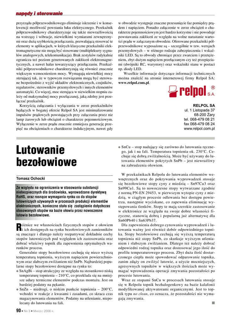 przyrządu półprzewodnikowego eliminuje iskrzenie i w konsekwencji możliwość powstania łuku elektrycznego. Przekaźnik półprzewodnikowy charakteryzuje się także niewrażliwością na wstrząsy i wibracje, niewielkimi wymiarami zewnętrznymi oraz dużą szybkością przełączania, pozwalającą stosować te elementy w aplikacjach, w których klasyczne przekaźniki elektromagnetyczne nie mogą być stosowane (multipleksery sygnałów analogowych, telekomunikacja). Brak zestyków radykalnie ogranicza też poziom generowanych zakłóceń elektromagnetycznych, a nawet hałas towarzyszący przełączaniu. Przekaźniki półprzewodnikowe charakteryzują się również znacznie większym wzmocnieniem mocy. Wymagają niewielkiej mocy sterującej tak, że w typowym rozwiązaniu mogą być sterowane bezpośrednio z wyjść układów elektronicznych, czujników, regulatorów, sterowników przemysłowych i innych elementów automatyki. Co więcej, moc sterująca w niewielkim stopniu zależy od maksymalnej mocy przełączanej, jaką zdolny jest przełączać przekaźnik. Korzyścią załączania i wyłączania w zerze przekaźników będących w bogatej ofercie Relpol SA jest minimalizowanie impulsów prądowych powstających przy załączaniu przez nie lamp żarowych lub obciążeń o charakterze pojemnościowym. Wyłączenie w zerze prądu znacznie zmniejsza generację przepięć na obciążeniach o charakterze indukcyjnym, nawet gdy Lutowanie bezołowiowe Tomasz Ochocki Ze względu na ograniczenia w stosowaniu substancji niebezpiecznych dla środowiska, wprowadzane dyrektywą RoHS, oraz rosnące wymagania rynku co do stopów lutowniczych używanych w procesach produkcji elementów elektronicznych, konieczne stało się zastąpienie dotychczas stosowanych stopów na bazie ołowiu przez nowoczesne lutowia bezołowiowe. R óżnice we własnościach fizycznych stopów z ołowiem i ich dostępnych na rynku bezołowiowych zamienników są znaczące i dlatego należy rozpatrywać dokładnie cechy stopów lutowniczych pod względem ich zastosowania oraz dobrać właściwy topnik dla zapewnienia optymalnych warunków procesu. Generalnie stopy bezołowiowe cechują się nieco wyższą temperaturą topnienia, wyższym napięciem powierzchniowym oraz słabszym zwilżaniem niż SnPb. Najbardziej popularne stopy bezołowiowe dostępne na rynku to: SnAgBi – stop atrakcyjny ze względu na stosunkowo niską temperaturę topnienia – 210°C, co przekłada się na mniejsze udary termiczne elementów podczas montażu. Jest on bardziej podatny na pękanie. SnZn – niedrogi, o niskim punkcie topnienia – 200°C, wchodzi w reakcje z kwasami i zasadami, co skraca czas magazynowania elementów. Podatny na utlenianie, niepolecany do lutowania na fali. 90 NR 3 MARZEC 2006 R. w obwodzie występuje znaczne przesunięcie faz pomiędzy prądem i napięciem. Ponadto załączenie w zerze obciążeń o charakterze pojemnościowym jest bardzo korzystne i nie powoduje powstawania zakłóceń ze względu na wolne narastanie wartości prądu w załączanym obwodzie. Oferowane przekaźniki półprzewodnikowe wyposażone są – szczególnie w tzw. wersjach przemysłowych – w różnego rodzaju zabezpieczenia i wskaźniki LED. Są to obwody chroniące przez zwarciem i przetężeniem, zbyt dużym napięciem przełączanym czy też przepięciami (dwójniki RC, warystory) oraz wskaźniki stanu w postaci np. diody LED. Wszelkie informacje dotyczące informacji technicznych można znaleźć na stronie internetowej firmy Relpol SA: www.relpol.com.pl. RELPOL SA ul. 1 Listopada 37 68-200 Żary tel. 068-479 08 21 fax 068-479 08 24 www.relpol.com.pl SnCu – stop nadający się zarówno do lutowania ręcznego, jak i na fali. Temperatura topnienia ok. 230°C. Cechuje się dobrą zwilżalnością. Może być używany do lutowania elementów pokrytych SnPb – jest niewrażliwy na zabrudzenia ołowiem. W przekaźnikach Relpolu do lutowania elementów wewnętrznych oraz do pokrywania wyprowadzeń stosuje się bezołowiowe stopy cyny z miedzią – Sn97Cu3 oraz Sn99Cu1. Są to nowoczesne stopy wytwarzane zgodnie z normą PN-EN 29453, w pierwszym wytopie cyny z miedzią, w ciągłym procesie odlewania bez dostępu powietrza, następnie wyciskane, co zapewnia eliminację występowania tlenków. Stopy te mają szerokie zastosowanie w elektronice ze względu na swoje dobre własności fizyczne, stanowią dobrą i popularną już alternatywę dla Sn60Pb40 i Sn63Pb37. Dla zapewnienia dobrego cynowania wyprowadzeń i lutowania ważny jest również dobór odpowiedniego topnika. Stopy bezołowiowe cechują się wyższą temperaturą topnienia niż stopy SnPb, co skutkuje wyższym utlenianiem i słabszym zwilżaniem. Dlatego też należy dobrać odpowiedni rodzaj topnika oraz dostosować jego ilość do profilu temperaturowego procesu. Zbyt duża ilość dostarczonego ciepła może spowodować odparowanie topnika, zanim zdąży on zwilżyć lutowie, a użycie mocniejszych, agresywnych topników w większych ilościach może wymagać wprowadzenia operacji zmywania pozostałości po procesie lutowania. Wraz ze stopami SnCu w procesach lutowania stosuje się w Relpolu topnik bezhalogenkowy na bazie kalafonii modyfikowanej aktywatorami organicznymi. Jest to topnik typu no clean, co oznacza, że pozostałości nie wymagają zmywania.