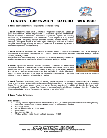 JESTEŚMY CZŁONKIEM POLSKIEJ IZBY TURYSTYKI LONDYN - GREENWICH – OXFORD – WINDSOR 1 dzień: Zbiórka uczestników. Przejazd przez Niemcy do Francji. 2 dzień: Przeprawa przez kanał La Manche. Przejazd do Greenwich. Spacer po parku w Greenwich i wizyta na południku 0. Zwiedzanie Opactwa Westminster miejsca koronacji i spoczynku monarchów angielskich. Spacer po dzielnicy rządowej City of Westminster: koło Parlamentu i wieży zegarowej z Big Benem, Downing Street - oficjalnej siedziby premiera, budynku Gwardii Konnej i placu Trafalgar. Następnie wizyta w muzeum figur woskowych Madame Tusseaud’s. Przejazd komunikacją miejską na miejsce spotkania z rodzinami. Spotkanie z rodzinami angielskimi, kolacja i nocleg. 3 dzień: Śniadanie. Wycieczka do Oxfordu: zwiedzanie miasta - budynki uniwersytetu Christ Church College z największym dziedzińcem uniwersytetu St . John’s College, Biblioteka Bodleian, Magdalen College, Radcliff Camera, ulica High Street. Przejazd do Windsoru - oglądamy oficjalną letnią rezydencję królowej Elżbiety II(z zewnątrz) i malownicze miasteczko. Powrót do Londynu. Kolacja i nocleg. 4 dzień: Zwiedzanie Muzeum Historii Naturalnej, uznanego za najciekawsze muzeum na Świecie, przedstawiające zbiory związane z powstaniem życia na ziemi. Zwiedzanie muzeum Nauki i Techniki, spacer w kierunku Royal Albert Hall (sala koncertowa w Londynie poświęcona mężowi królowej Wiktorii, księciu Albertowi) i Albert Memorial, następnie przez Hyde Park do pałacu Buckingham - oficjalnej londyńskiej siedziby Królowej Elżbiety ll. Powrót do rodzin, obiadokolacja, nocleg. 5 dzień: Śniadanie. Zwiedzanie Tower of London - najsłynniejszego europejskiego więzienia, wizyta w skarbcu, gdzie przechowywany jest największy diament na świecie oraz klejnoty królewskie. Pamiątkowe zdjęcia na moście Tower Bridge, następnie spacer promenadą wzdłuż Tamizy obok takich obiektów jak katedra św.Pawła, teatr szekspirowski The Globe l galera Tate Modern w kierunku handlowej dzielnicy Londynu - the City. Przejazd w kierunku kanału La Manche. Po przeprawie przejazd w kierunku Polski. 6 dzień: Przyjazd do Tarnowa. Cena zawiera: 3 noclegi u rodzin angielskich(dzieci kwaterowane są po 2,3,4 dzieci u specjalnie dobranych rodzin angielskich) wyżywienie: 3x śniadanie, 3x lunch w formie pakietu,3x obiadokolacja u rodzin, program jak wyżej, autokar: klimatyzacja, wc, video, barek, opieka pilota, ubezpieczenie NNW i KL UWAGA : Wstępy, metro i koszty realizacji programu– 70 GBP Mielec, Ul. P. Skargi 9, Tel./Fax.: +48 17 788 52 22 Tarnów, Ul. Bema 5, Tel./Fax.: +48 14 6556533/2 Kom: +48 508 09 09 75, e-mail: [email protected], [email protected] www.venetopoland.eu