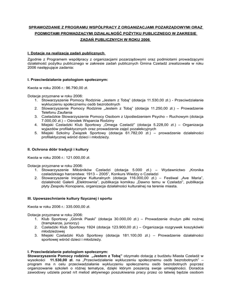 SPRAWOZDANIE Z PROGRAMU WSPÓŁPRACY Z ORGANIZACJAMI POZARZĄDOWYMI ORAZ PODMIOTAMI PROWADZĄCYMI DZIAŁALNOŚĆ POŻYTKU PUBLICZNEGO W ZAKRESIE ZADAŃ PUBLICZNYCH W ROKU 2006 I. Dotacje na realizację zadań publicznych Zgodnie z Programem współpracy z organizacjami pozarządowymi oraz podmiotami prowadzącymi działalność pożytku publicznego w zakresie zadań publicznych Gmina Czeladź zrealizowała w roku 2006 następujące zadania: I. Przeciwdziałanie patologiom społecznym: Kwota w roku 2006 r.: 96.790,00 zł. Dotacje przyznane w roku 2006: 1. Stowarzyszenie Pomocy Rodzinie „Jestem z Tobą” (dotacja 11.530,00 zł.) - Przeciwdziałanie wykluczeniu społecznemu osób bezrobotnych 2. Stowarzyszenie Pomocy Rodzinie „Jestem z Tobą” (dotacja 11.250,00 zł.) – Prowadzenie Telefonu Zaufania 3. Czeladzkie Stowarzyszenie Pomocy Osobom z Upośledzeniem Psycho – Ruchowym (dotacja 7.000,00 zł.) – Ośrodek Wsparcia Rodziny 4. Miejski Czeladzki Klub Sportowy „Omega Czeladź” (dotacja 5.228,00 zł.) – Organizacja wyjazdów profilaktycznych oraz prowadzenie zajęć pozalekcyjnych 5. Miejski Szkolny Związek Sportowy (dotacja 61.782,00 zł.) – prowadzenie działalności profilaktycznej wśród dzieci i młodzieży. II. Ochrona dóbr tradycji i kultury Kwota w roku 2006 r.: 121.000,00 zł. Dotacje przyznane w roku 2006: 1. Stowarzyszenie Miłośników Czeladzi (dotacja 5.000 zł.) – Wydawnictwo „Kronika czeladzkiego harcerstwa: 1913 – 2005”, Konkurs Wiedzy o Czeladzi 2. Stowarzyszenie Inicjatyw Kulturalnych (dotacja 116.000,00 zł.) – Festiwal „Ave Maria”, działalność Galerii „Elektrownia”, publikacja komiksu „Dawno temu w Czeladzi”, publikacja płyty Zespołu Konopians, organizacja działalności kulturalnej na terenie miasta. III. Upowszechnianie kultury fizycznej i sportu Kwota w roku 2006 r.: 335.000,00 zł. Dotacje przyznane w roku 2006: 1. Klub Sportowy „Górnik Piaski” (dotacja 30.000,00 zł.) – Prowadzenie drużyn piłki nożnej (trampkarze, juniorzy) 2. Czeladzki Klub Sportowy 1924 (dotacja 123.900,00 zł.) – Organizacja rozgrywek koszykówki młodzieżowej 3. Miejski Czeladzki Klub Sportowy (dotacja 181.100,00 zł.) – Prowadzenie działalności sportowej wśród dzieci i młodzieży. I. Przeciwdziałanie patologiom społecznym: Stowarzyszenie Pomocy rodzinie „Jestem z Tobą” otzymało dotację z budżetu Miasta Czeladź w wysokości 11.530,00 zł. na „Przeciwdziałanie wykluczeniu społecznemu osób bezrobotnych” – program ma n celu przeciwadziałanie wykluczeniu społecznemu osób bezrobotnych poprzez organizowanie szkoleń o różnej tematyce, dzięki którym poszerzą swoje umiejętności. Doradca zawodowy udziela porad n/t metod aktywnego poszukiwania pracy przez co łatwiej będzie osobom pozbawionym pracy znaleźć zatrudnienie. Doradca także prowadzi zajęcia grupowe i indywidualne, pomaga w planowaniu kariery zawodowej i przekawlifikowaniu. Natomiast kurator ds. rodzinnych służy pomocą rodzinom w kryzysie. Prawnik będzie udzielał porad prawnych. Grupa wsparcia umożliwi podzielenie się doświadczeniami i problemami oraz da wsparcie jak radzić sobie z problemami bezroboocia w rodzinie. Program ten dotyczy także problemu uzależnienia od alkoholu często obecnego wśród osób dotkniętych bezrobociem. Istnieje różwnież punkt pomocy rzeczowej zaspokajający częściowo podstawowe potrzeby życiowe i zmniejszy sferę ubóstwa rodzin. Stowarzyszenie to otrzymało również dotację z budżetu Miasta Czeladź w wysokości 11.250,00 zł. na „Prowadzenie Telefonu Zaufania”-świadczy usługi dla osób szukających pomocy, którzy chcą zostać anonimowi . Dzwoniący do TZ zostają wysłuchani a dyżurny TZ pomaga rozwiazać problem, oraz wskazuje instytucje gdzie można zgłosić się o pomoc. Zdarza się także, że dyżurni prowazą intrwencję w sprawach zgłaszanych problemów i szukają placowki mogącej udzielić pomocy, na krórą oczekuje osoba dwoniąca. W związku z często zgłaszanym problemem przemocy domowej ważne jest funkcjonowanie grupy samopomocowej przy TZ, aby osoby doznawające przemocy mogły spotkać się raz w tygodniu i wspólnie porozmawiać o problemie. Celem stowarzyszenia jest rozwijanie i propagowanie inicjatyw, postaw i działań sprzyjających zapobieganiui preciwadziałaniu różnym formom niedostosowania społecznego i patologii rodziny, dzieci i młodzieży, udzielanie pomocy w zakresie psychologii, pedagogiki, lecznictwa, prawa oraz wspieranie organizacyjne i rzeczowe osób fizycznych jak i jesdnostek organizacyjnych, które podejmują takie działania. Czeladzkie Stowarzyszenie Pomocy Osobom z Upośledzeniem Psycho – Ruchowym otrzymał dotację z budżeu Miasta Czeladź w wysokości 7.000,00 zł. – Ośrodek Wsparcia Rodziny- w ramach tego zadania środowisko osób niepełnosprawnych otrzymało wsparcie i profesjonalną pomoc z dziedziny prawa, psychologii oraz wszelkie porady z zakresu rehabilitacji i pielęgnacji osób niepełnosprawnych. Doposażona została sala terapeutyczna w liczne materiały i narzędzia dydaktyczne, umożliwiające prowadzenie różnorodnych zajęć, w tym zajęcia z zakresu: terapi zajęciowej, muzykoterapii i ergoterapii. Zajęcia pozwalają zaobserwować rozwój dzieci związany z ich rozwojem więzi społecznych, więzi z otoczeniem. Podczas codziennych zajęć dziecii dorośli i dorośli wykonują prace plastyczne i rękodzielnicze, przy których widoczna jest poprawa kondycji psychofizychnej rodzin. W 2006 roku odbyło się kilka ciekawych zabaw w restauracji „California” w Czeladzi połączonych z wystawami prac wykonanych podczas spotkań. W czasie wakacji w siedzibie Stowarzyszenia odbywały is ę spotkania ukierunkowane na wypoczynek na świerzym powietrzu. Poradnictwo i zajęcia odbywały się również w miesiącach wakacyjnych. Była także kontynuowana indywidualna pomoc dzieciom w pozyskiwaniu funduszy na leczenie zag