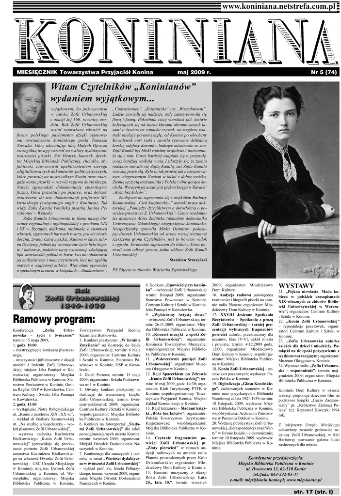 www.koniniana.netstrefa.com.pl MIESIĘCZNIK Towarzystwa Przyjaciół Konina maj 2009 r. Nr 5 (74) Witam Czytelników „Koninianów” wydaniem wyjątkowym... wyjątkowym, bo poświęconym w całości Zofii Urbanowskiej z okazji Jej 160. rocznicy urodzin. Rok Zofii Urbanowskiej został zauważony również na forum polskiego parlamentu dzięki sejmowemu oświadczeniu konińskiego posła Tomasza Nowaka, który akcentując ideę Małych Ojczyzn szczególną uwagę zwrócił na walory dydaktyczne twórczości pisarki. Zaś Henryk Janasek, dyrektor Miejskiej Biblioteki Publicznej, chciałby, aby jubileusz zaowocował upublicznieniem szeregu zdigitalizowanych dokumentów publicystycznych, które pozwolą na nowo odkryć Konin oraz zaangażowanie pisarki w rozwój regionu konińskiego. Należy zgromadzić dokumentację epistolograficzną, która pozostała po pisarce, oraz dotrzeć ostatecznie do tzw. dokumentacji profesora Mikusińskiego (związanego ongiś z Koninem). Tak widzi Zofię Kamilę konińska pisarka Janina Perathoner – Weneda: Zofia Kamila Urbanowska to ikona naszej literatury regionalnej i ogólnopolskiej z przełomu XIX i XX w. Szczupła, delikatna, nieśmiała, o ciemnych włosach, zgaszonych barwach twarzy, prawie niewidoczna, zwana szarą myszką, skulona w kącie salonu Deotymy, jednak jej wewnętrzne życie było bogate i kolorowe, podobne tęczy wiosennej, okalającej łąki warciańskie półkolem barw. Los nie obdarował jej małżeństwem i macierzyństwem, lecz nie zgubiła marzeń o wzajemnej miłości. Więc snuła opowieści o spełnionym uczuciu w książkach: „Znakomitość”, „Cudzoziemiec”, „Księżniczka” czy „Wszechmocni”. Ludzie zawiedli jej nadzieje, tedy zainteresowała się florą i fauną. Pokochała ciszę szerokich pól, leniwie kołyszących się od ziarna kłosami obramowanych lasami o żywicznym zapachu szyszek, na wzgórzu wiatraki mielące poranną mgłę, od Konina po ukochany Kowalewek nurt rzeki i zarośla rysowane delikatną kreską, odgłosy dzwonów budzące miasteczko ze snu. Zofii Kamili był bliski rodzimy krajobraz i utożsamiała się z nim. Coraz bardziej wtapiała się w przyrodę, coraz bardziej wnikała w nią. I zdarzyło się, że ziemia rodzinna stawała się Zofią Kamilą, zaś Zofia Kamila wieczną przyrodą. Było to tak prawie jak z zaczarowanym, niegrzecznym Guciem w baśni z dobrą wróżką. Ziemię ojczystą utożsamiała z Polską i obie gorąco kochała. Wyrazem jej uczuć jest piękna księga o Tatrach: „Róża bez kolców”. Zachęcam do zapoznania się z artykułem Barbary Kosmowskiej „Cień księżniczki...” autorki pracy doktorskiej „Pomiędzy dzieciństwem a dorosłością o powieściopisarstwie Z. Urbanowskiej”. Cenne wiadomości dostarcza Alina Zielińska (aktualnie doktorantka Uniwersytetu Gdańskiego) niegdysiejsza koninianka. Niespodziankę sprawiła Mirka Dymitrow pokazując dworek Urbanowskiej od strony raczej nieznanej szerszemu gronu Czytelników, jest to bowiem widok z ogrodu. Serdecznie zapraszam do lektury, która pozwoli nam odkryć jeszcze jedno oblicze Zofii Kamili Urbanowskiej. Stanisław Sroczyński PS Zdjęcia ze zbiorów Wojciecha Sypniewskiego. Ramowy program: Konferencja „Zofia Urbanowska – życie i twórczość” termin: 15 maja 2009, 1. godz. 10.00 – rozstrzygnięcie konkursu plastycznego, – uroczystości jubileuszowe z okazji urodzin i imienin Zofii Urbanowskiej; miejsce: Izba Pamięci w Kowalewku; organizatorzy: Miejska Biblioteka Publiczna w Koninie, Starostwo Powiatowe w Koninie, Gmina Rzgów, OSP w Kowalewku, Centrum Kultury i Sztuki, Izba Pamięci w Kowalewku. 2. godz. 13.00 – wystąpienie Piotra Rybczyńskiego nt. „Konin z przełomu XIX i XX w.”, – wykład dr Barbary Kosmowskiej nt. „Na służbie u Kopciuszka – wokół pisarstwa Zofii Urbanowskiej”, – wystawa malarska Kazimierza Białkowskiego „Konin Zofii Urbanowskiej” (przewiduje się przekazanie portretu Zofii Urbanowskiej autorstwa Kazimierza Białkowskiego na własność Dworku Zofii Urbanowskiej – USC Urzędu Miejskiego w Koninie); miejsce: Dworek Zofii Urbanowskiej w Koninie, ul. Westerplatte; organizatorzy: Miejska Biblioteka Publiczna w Koninie, Towarzystwo Przyjaciół Konina Kazimierz Białkowski. 3. Konkurs plastyczny: „W Krainie Zmyślenia” na ilustrację do bajek Zofii Urbanowskiej; termin: 6 maja 2009; organizator: Centrum Kultury i Sztuki w Koninie, Starostwo Powiatowe w Koninie, OSP w Kowalewku. 4. Dzień Patrona; termin: 15 maja 2009; organizator: Szkoła Podstawowa nr 1 w Koninie. 5. Otwarty konkurs plastyczny na ilustrację do wznawianej książki Zofii Urbanowskiej; termin: kwiecień-październik 2009; organizator: Centrum Kultury i Sztuki w Koninie; współorganizator: Miejska Biblioteka Publiczna w Koninie. 6. Konkurs na fotoreportaż „Śladami Zofii Urbanowskiej” dla szkół ponadgimnazjalnych miasta Konina; termin: wrzesień 2009; organizator: Miejski Ośrodek Doskonalenia Nauczycieli w Koninie, 7. Konferencja dla nauczycieli i uczniów na temat „Wartości dydaktyczne w twórczości Zofii Urbanowskiej” – wykład prof. zw. Józefa Pólturzyckiego; termin: wrzesień 2009; organizator: Miejski Ośrodek Doskonalenia Nauczycieli w Koninie. 8. Konkurs „Opowieści przy kominku” – twórczość Zofii Urbanowskiej termin: listopad 2009; organizator: Starostwo Powiatowe w Koninie, Centrum Kultury i Sztuki w Koninie, Izba Pamięci w Kowalewku. 9. „Wybieramy Artystę słowa” – twórczość Zofii Urbanowskiej; termin: 26.11.2009; organizator: Miejska Biblioteka Publiczna w Koninie. 10. „Koncert muzyki z epoki Zofii Urbanowskiej”; organizator: Konińskie Towarzystwo Muzyczne; współorganizator: Miejska Biblioteka Publiczna w Koninie. 11. „Wskrzeszenie pamięci Zofii Urbanowskiej”; organizator: Muzeum Okręgowe w Koninie. 12. Rajd Spacerkiem po Zdrowie – „Konin Zofii Urbanowskiej”; termin: 16 maj 2009, godz. 14:30; organizator: