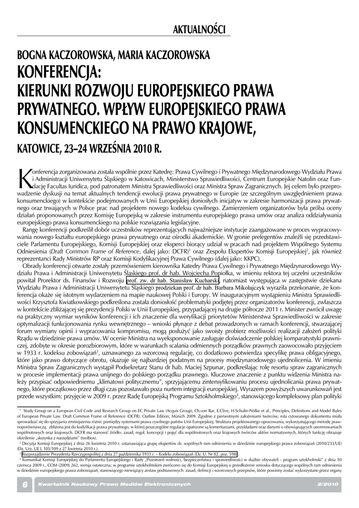 aktualności Bogna Kaczorowska, Maria Kaczorowska Konferencja: Kierunki rozwoju europejskiego prawa prywatnego. Wpływ europejskiego prawa konsumenckiego na prawo krajowe, Katowice, 23–24 września 2010 r. K onferencja zorganizowana została wspólnie przez Katedrę: Prawa Cywilnego i Prywatnego Międzynarodowego Wydziału Prawa i Administracji Uniwersytetu Śląskiego w Katowicach, Ministerstwo Sprawiedliwości, Centrum Europejskie Natolin oraz Fundację Facultas Iuridica, pod patronatem Ministra Sprawiedliwości oraz Ministra Spraw Zagranicznych. Jej celem było przeprowadzenie dyskusji na temat aktualnych tendencji ewolucji prawa prywatnego w Europie (ze szczególnym uwzględnieniem prawa konsumenckiego) w kontekście podejmowanych w Unii Europejskiej doniosłych inicjatyw w zakresie harmonizacji prawa prywatnego oraz trwających w Polsce prac nad projektem nowego kodeksu cywilnego. Zamierzeniem organizatorów była próba oceny działań proponowanych przez Komisję Europejską w zakresie instrumentu europejskiego prawa umów oraz analiza oddziaływania europejskiego prawa konsumenckiego na polskie rozwiązania legislacyjne. Rangę konferencji podkreślił dobór uczestników reprezentujących najważniejsze instytucje zaangażowane w proces wypracowywania nowego kształtu europejskiego prawa prywatnego oraz ośrodki akademickie. W gronie prelegentów znaleźli się przedstawiciele Parlamentu Europejskiego, Komisji Europejskiej oraz eksperci biorący udział w pracach nad projektem Wspólnego Systemu Odniesienia (Draft Common Frame of Reference, dalej jako: DCFR) oraz Zespołu Ekspertów Komisji Europejskiej, jak również reprezentanci Rady Ministrów RP oraz Komisji Kodyfikacyjnej Prawa Cywilnego (dalej jako: KKPC). Obrady konferencji otwarte zostały przemówieniem kierownika Katedry Prawa Cywilnego i Prywatnego Międzynarodowego Wydziału Prawa i Administracji Uniwersytetu Śląskiego prof. dr hab. Wojciecha Popiołka, w imieniu rektora tej uczelni uczestników powitał Prorektor ds. Finansów i Rozwoju prof. zw. dr hab. Stanisław Kucharski, natomiast występująca w zastępstwie dziekana Wydziału Prawa i Administracji Uniwersytetu Śląskiego prodziekan prof. dr hab. Barbara Mikołajczyk wyraziła przekonanie, że konferencja okaże się istotnym wydarzeniem na mapie naukowej Polski i Europy. W inauguracyjnym wystąpieniu Ministra Sprawiedliwości Krzysztofa Kwiatkowskiego podkreślona została doniosłość problematyki podjętej przez organizatorów konferencji, zwłaszcza w kontekście zbliżającej się prezydencji Polski w Unii Europejskiej, przypadającej na drugie półrocze 2011 r. Minister zwrócił uwagę na praktyczny wymiar wyników konferencji i ich znaczenie dla weryfikacji priorytetów Ministerstwa Sprawiedliwości w zakresie optymalizacji funkcjonowania rynku wewnętrznego – wnioski płynące z debat prowadzonych w ramach konferencji, stwarzającej forum wymiany opinii i wypracowania kompromisu, mogą posłużyć jako swoisty probierz możliwości realizacji założeń polityki Rządu w dziedzinie prawa umów. W ocenie Ministra na wyeksponowanie zasługuje doświadczenie polskiej komparatystyki prawniczej, zdobyte w okresie porozbiorowym, które w warunkach scalania odmiennych porządków prawnych zaowocowało przyjęciem w 1933 r. kodeksu zobowiązań, uznawanego za wzorcową regulację, co dodatkowo potwierdza specyfikę prawa obligacyjnego, które jako prawo dotyczące obrotu, okazuje się najbardziej podatnym na procesy międzynarodowego ujednolicenia. W imieniu Ministra Spraw Zagranicznych wystąpił Podsekretarz Stanu dr hab. Maciej Szpunar, podkreślając rolę resortu spraw zagranicznych w procesie implementacji prawa unijnego do polskiego porządku prawnego. Kluczowe znaczenie z punktu widzenia Ministra należy przypisać odpowiedniemu „klimatowi politycznemu”, sprzyjającemu zintensyfikowaniu procesu ujednolicania prawa prywatnego, które początkowo przez długi czas pozostawało poza nurtem integracji europejskiej. Wyrazem powyższych uwarunkowań jest przede wszystkim: przyjęcie w 2009 r. przez Radę Europejską Programu Sztokholmskiego, stanowiącego kompleksowy plan polityki Study Group on a European Civil Code and Research Group on EC Private Law (Acquis Group), Ch.von Bar, E.Clive, H.Schulte-Nölke et al., Principles, Definitions and Model Rules of European Private Law. Draft Common Frame of Reference (DCFR). Outline Edition, Münich 2009. Zgodnie z pierwotnymi założeniami twórców, rola cytowanego dokumentu miała sprowadzać się do sprzyjania zmniejszeniu różnic pomiędzy systemami prawa cywilnego państw Unii Europejskiej. Struktura projektowanego opracowania, wykorzystującego metodę prawnoporównawczą, zbliżona jest do kodyfikacji prawa prywatnego, w której poszczególne regulacje opatrzone są komentarzami, przykładami oraz danymi o obowiązujących unormowaniach wspólnotowych oraz krajowych. DCFR ma stanowić źródło: zasad, reguł, koncepcji i pojęć dla wspólnotowych oraz krajowych twórców aktów normatywnych, których funkcję obrazuje określenie „skrzynka z narzędziami” (toolbox). Decyzja Komisji Europejskiej z dnia 26 kwietnia 2010 r. ustanawiająca grupę ekspertów ds. wspólnych ram odniesienia w dziedzinie europejskiego prawa zobowiązań (2010/233/UE) (Dz. Urz. UE L 105/109 z 27 kwietnia 2010 r.). Rozporządzenie Prezydenta Rzeczypospolitej z dnia 27 października 1933 r. – Kodeks zobowiązań (Dz. U. Nr 82, poz. 598) . Komunikat Komisji Europejskiej do Parlamentu Europejskiego i Rady „Przestrzeń wolności, bezpieczeństwa i sprawiedliwości w służbie obywateli - program sztokholmski” z dnia 10 czerwca 2009 r., COM (2009) 262, wersja ostateczna; w programie sztokholmskim zwrócono się do Komisji Europejskiej o przedłożenie wniosku dotyczącego wspólnych ram odniesienia w dziedzinie europejskiego prawa zobowiązań, stanowiącego niewiążący zestaw podstawowych: zasad, definicji i 
