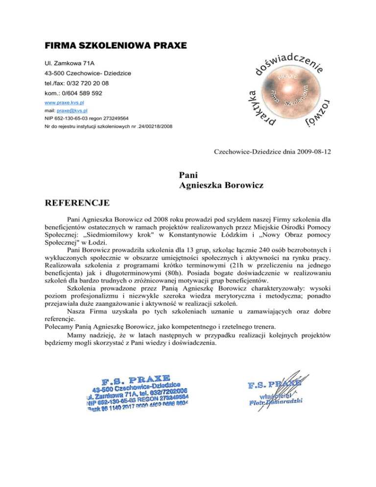 FIRMA SZKOLENIOWA PRAXE Ul. Zamkowa 71A 43-500 Czechowice- Dziedzice tel./fax: 0/32 720 20 08 kom.: 0/604 589 592 www.praxe.kvs.pl mail: [email protected] NIP 652-130-65-03 regon 273249564 Nr do rejestru instytucji szkoleniowych nr .24/00218/2008 Czechowice-Dziedzice dnia 2009-08-12 Pani Agnieszka Borowicz REFERENCJE Pani Agnieszka Borowicz od 2008 roku prowadzi pod szyldem naszej Firmy szkolenia dla beneficjentów ostatecznych w ramach projektów realizowanych przez Miejskie Ośrodki Pomocy Społecznej: „Siedmiomilowy krok" w Konstantynowie Łódzkim i „Nowy Obraz pomocy Społecznej" w Łodzi. Pani Borowicz prowadziła szkolenia dla 13 grup, szkoląc łącznie 240 osób bezrobotnych i wykluczonych społecznie w obszarze umiejętności społecznych i aktywności na rynku pracy. Realizowała szkolenia z programami krótko terminowymi (21h w przeliczeniu na jednego beneficjenta) jak i długoterminowymi (80h). Posiada bogate doświadczenie w realizowaniu szkoleń dla bardzo trudnych o zróżnicowanej motywacji grup beneficjentów. Szkolenia prowadzone przez Panią Agnieszkę Borowicz charakteryzowały: wysoki poziom profesjonalizmu i niezwykle szeroka wiedza merytoryczna i metodyczna; ponadto przejawiała duże zaangażowanie i aktywność w realizacji szkoleń. Nasza Firma uzyskała po tych szkoleniach uznanie u zamawiających oraz dobre referencje. Polecamy Panią Agnieszkę Borowicz, jako kompetentnego i rzetelnego trenera. Mamy nadzieję, że w latach następnych w przypadku realizacji kolejnych projektów będziemy mogli skorzystać z Pani wiedzy i doświadczenia.