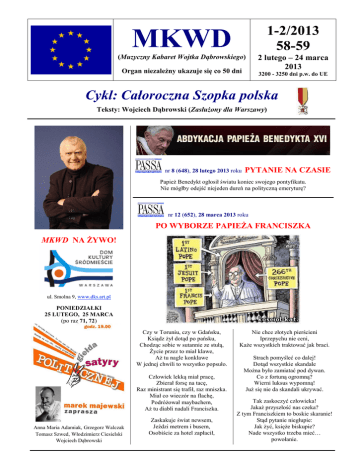 MKWD 1-2/2013 58-59 (Muzyczny Kabaret Wojtka Dąbrowskiego) 2 lutego – 24 marca 2013 Organ niezależny ukazuje się co 50 dni 3200 - 3250 dni p.w. do UE Cykl: Całoroczna Szopka polska Teksty: Wojciech Dąbrowski (Zasłużony dla Warszawy) nr 8 (648), 28 lutego 2013 roku PYTANIE NA CZASIE Papież Benedykt ogłosił światu koniec swojego pontyfikatu. Nie mógłby odejść niejeden dureń na polityczną emeryturę? nr 12 (652), 28 marca 2013 roku PO WYBORZE PAPIEŻA FRANCISZKA MKWD NA ŻYWO! ul. Smolna 9, www.dks.art.pl PONIEDZIAŁKI 25 LUTEGO, 25 MARCA (po raz 71, 72) Czy w Toruniu, czy w Gdańsku, Ksiądz żył dotąd po pańsku, Chodząc sobie w sutannie ze stułą, Życie przez to miał klawe, Aż tu nagle konklawe W jednej chwili to wszystko popsuło. Człowiek lekką miał pracę, Zbierał forsę na tacę, Raz ministrant się trafił, raz mniszka. Miał co wieczór na flachę, Podróżował maybachem, Aż tu diabli nadali Franciszka. Anna Maria Adamiak, Grzegorz Walczak Tomasz Szwed, Włodzimierz Ciesielski Wojciech Dąbrowski Zaskakuje świat newsem, Jeździ metrem i busem, Osobiście za hotel zapłacił, Nie chce złotych pierścieni Iprzepychu nie ceni, Każe wszystkich traktować jak braci. Strach pomyśleć co dalej! Dotąd wszystkie skandale Można było zamiatać pod dywan. Co z fortuną ogromną? Wierni luksus wypomną! Już się nie da skandali ukrywać. Tak zaskoczyć człowieka! Jakaż przyszłość nas czeka? Z tym Franciszkiem to boskie skaranie! Stąd pytanie niegłupie: Jak żyć, księże biskupie? Nade wszystko trzeba mieć… powołanie. str. 2 MKWD, nr 1/2 (58-59) /2013, Warszawa, 2 lutego - 24 marca 2013 roku (3200-3250 dni po wstąpieniu do UE) nr 10 (650), 14 marca 2013 RAZ SZTUCZNY PENIS RAZ TABLETY Możesz z wszystkimi koty drzeć, Ale ipada musisz mieć! Teraz króluje na estradach Ten, co korzysta dziś z ipada, Premier mówiący na tablecie, To pewny sukces w kabarecie. Kto dziś sprawować chce rząd dusz, Wie: bez ipada ani rusz! Gdy nie masz konta, prawa jazdy, Z ipadem zagrasz rolę gwiazdy, Sposób to może dość nachalny, Lecz dziś się liczy szum medialny. Gdy brak, masz powód do rozpaczy: Dziś bez ipada nic nie znaczysz. Ostatnio modne są gadżety: Raz sztuczny penis, raz tablety. Teraz jest wzorem i przykładem Człowiek z tabletem i ipadem. Dzisiaj wypada mieć ipada, Bo bez ipada żyć nie nada. Choć nie masz nic do powiedzenia, Ipad gwarancją jest istnienia. Możesz pleść bzdury, głupstwa gadać, Bylebyś tylko miał ipada. nr 4 (644), 31 stycznia 2013 roku Na koniec spytam dość odważnie: Prezes żartował, czy poważnie? Zamiast dyskusji głos z ipada To nowoczesność czy żenada? Premier z tabletu – niezły gag. Jeśli na serio - słów mi brak. Stąd dla Prezesa dobra rada: Bierz Pan ipada, no i… spadaj! Seks jest zły, bo nie rozwija stwierdziła Anna Sobecka, posłanka Ruchu Ludowo-Narodowego, poprzednio LPR, później PiS, spikerka Radia Maryja, przewodnicząca sejmowej Komisji ds. Rodziny, udzielając wywiadu Dziennikowi 5 czerwca 2007 roku. Skomentowałem to wówczas następującą fraszką (patrz MKWD, nr 7/2007): Martwię się o dziecko, nie chce spać i nie je. Zobaczył Sobecką i woli być gejem. Wydawało się, że większych bredni z sejmowej mównicy wygłosić się nie da. Ale wszystkich przebiła posłanka PiS profesor Krystyna Pawłowicz, nauczyciel akademicki, doktor habilitowany nauk prawnych b. sędzia Trybunału Stanu 2007-2011 Że stroni od kobiet, nie dziw się gejowi. Któż wybrałby sobie posłankę Pawłowicz? MKWD, nr 1/2 (58-59) /2013, Warszawa, 2 lutego- 24 marca 2013 roku (3200-3250 dni po wstąpieniu do UE) str. 3 nr 9 (649), 7 marca 2013 roku SEXY BOY W DOMU SZTUKI Trzeba mieć nie lada poczucie humoru, polot i lekkie pióro, żeby sparafrazować popularny francuski evergreen Bettiego C’est ci bon i stworzyć przepyszny pastisz piosenki Sexy boy. Trzeba mieć w dodatku kabaretowe zacięcie i zdobyć się na odrobinę autoironii (rzadka cecha!), żeby zaśpiewać go niby o sobie, puszczając oko do rozbawionej publiczności. Tę piosenkę wykonał na bis po swoim recitalu Jan Jakub Należyty, kolejny gość cieszącego się ogromnym powodzeniem cyklicznego programu Marka Majewskiego w Domu Sztuki, podbijając bez reszty ursynowską publiczność. Ale JJN to potrafi. Jego specjalność to artystyczna prowokacja, umiejętność łączenia liryki i inteligentnego żartu. Potrafi być wzruszający (pieśń Quasimodo do Esmeraldy, własna wersja Modlitwy Okudżawy, dedykowana przyjaciołom, którzy odchodzą zbyt wcześnie), refleksyjny (aria Don Kichota z musicalu z Człowiek z La Manchy, autorska wersja My way z repertuaru Franka Sinatry), potrafi śmiać się z samego siebie, prowokuje, zadaje pytania. Od lat śpiewa piosenki z repertuaru Brela (Nie opuszczaj mnie, Piosenka starych kochanków), Brassensa, Aznavoura, własną wersję Martwych Liści Kosmy, piosenki autorskie. Z powodzeniem debiutował jako 15-latek w Ogólnopolskim Młodzieżowym Przeglądzie Piosenki (1980). Trzy lata później podbijał Opole na XX OFPP (1983) piosenką o klaunie. Zyskał przydomek polskiego Brela za sprawą Jonasza Kofty, ongiś najmłodszy w kabarecie Jana Pietrzaka Pod Egidą, w którym występował razem z Markiem Majewskim. Panowie znają się od dawna, i MM wie, zapraszając go do programu, że to pewniak. Nie inaczej przyjęła go ursynowska publiczność. Ostatnio JJN odnosi również sukcesy jako dramaturg. Szczerze mówiąc, w tej roli podoba mi się mniej, ma wprawdzie sporo świetnych pomysłów i posiadł łatwość pisania dowcipnych dialogów, ale w całości czegoś mi brakuje. Przyzwyczaiłem się do jego finezyjnych tekstów i wolę go i cenię bardziej jako mistrza małych form, piosenek i utworów poetyckich z nieco wyższego piętra, choć muszę przyznać, że zarówno komedia Andropauza, czyli męska rzecz być z kobietą (w doborowej obsadzie z Markiem Siudymem, Jackiem Kawalcem i Ma