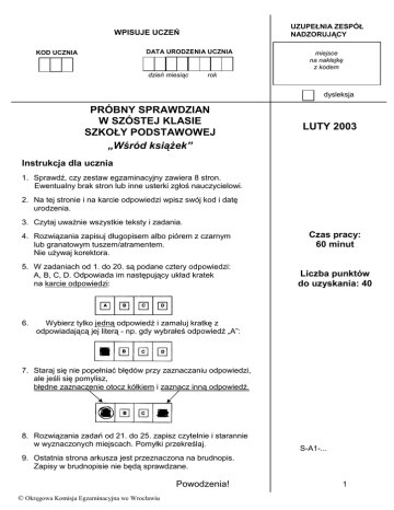 UZUPEŁNIA ZESPÓŁ NADZORUJĄCY WPISUJE UCZEŃ DATA URODZENIA UCZNIA KOD UCZNIA dzień miesiąc miejsce na naklejkę z kodem rok dysleksja PRÓBNY SPRAWDZIAN W SZÓSTEJ KLASIE SZKOŁY PODSTAWOWEJ „Wśród ksiąŜek” LUTY 2003 Instrukcja dla ucznia 1. Sprawdź, czy zestaw egzaminacyjny zawiera 8 stron. Ewentualny brak stron lub inne usterki zgłoś nauczycielowi. 2. Na tej stronie i na karcie odpowiedzi wpisz swój kod i datę urodzenia. 3. Czytaj uwaŜnie wszystkie teksty i zadania. 4. Rozwiązania zapisuj długopisem albo piórem z czarnym lub granatowym tuszem/atramentem. Nie uŜywaj korektora. 5. W zadaniach od 1. do 20. są podane cztery odpowiedzi: A, B, C, D. Odpowiada im następujący układ kratek na karcie odpowiedzi: 6. Czas pracy: 60 minut Liczba punktów do uzyskania: 40 Wybierz tylko jedną odpowiedź i zamaluj kratkę z odpowiadającą jej literą - np. gdy wybrałeś odpowiedź „A”: 7. Staraj się nie popełniać błędów przy zaznaczaniu odpowiedzi, ale jeśli się pomylisz, błędne zaznaczenie otocz kółkiem i zaznacz inną odpowiedź. 8. Rozwiązania zadań od 21. do 25. zapisz czytelnie i starannie w wyznaczonych miejscach. Pomyłki przekreślaj. S-A1-... 9. Ostatnia strona arkusza jest przeznaczona na brudnopis. Zapisy w brudnopisie nie będą sprawdzane. Powodzenia! © Okręgowa Komisja Egzaminacyjna we Wrocławiu 1 Wśród ksiąŜek Witam Cię kartek szelestem, tytułem na pierwszej stronie, witam! Bo po to przecieŜ jestem, Ŝebyś mnie ujął w dłonie i czytał! Kiedy ci smutno będzie, kiedyś samotny, chory, bez przyjaciela – ja z tobą pójdę wszędzie, poprzez zimowe wieczory, w kraje wesela. Edward Szymański 1. W wierszu mówi do czytelnika: A. biblioteka, B. ksiąŜka, C. autor, D. narrator. 2. Druga zwrotka ma charakter: A. prośby, B. zachęty, C. obietnicy, D. Ŝyczenia. KsiąŜki towarzyszą człowiekowi od czterech tysięcy lat. Zapisywano je kiedyś ręcznie na glinianych tabliczkach, papirusowych zwojach, na pergaminie i wreszcie – znacznie później – na papierze. Epoka ksiąŜki drukowanej rozpoczęła się dopiero w XV wieku, dzięki Janowi Gutenbergowi. 3. Ile wieków minęło od pojawienia się pierwszych ksiąŜek? A. 40 wieków, C. 400 wieków, B. 4 wieki, D. 4000 wieków. 4. Informacji o Janie Gutenbergu poszukasz w ksiąŜce: A. „StaroŜytne cywilizacje”, C. „Odkrycia XX wieku”, B. „Leksykon wynalazców”, D. „Słynne biblioteki”. Pierwszą ksiąŜkę dla niewidomych wydrukowano w ParyŜu w 1837 roku. Stało się to moŜliwe dzięki wynalezieniu systemu pisma dotykowego. Jego twórcą był Ludwik Braille (1809 – 1852) – uczeń, a następnie nauczyciel w paryskiej szkole dla niewidomych. Braille zaczął pracować nad systemem pisma dotykowego juŜ w 1824 roku, później przez kilkanaście lat go udoskonalał. Dzisiaj pismo dla niewidomych zwane jest potocznie „brajlem”. (na podstawie Encyklopedii Powszechnej PWN) 5. Kiedy wydano pierwszą ksiąŜkę dla niewidomych? A. w 1. poł. XVIII wieku, C. w 1. poł. XIX wieku, B. w 2. poł. XVIII wieku, D. w 2. poł. XIX wieku. 6. Ile lat miał Ludwik Braille, gdy rozpoczął pracę nad systemem pisma dotykowego? A. 52 B. 28 C. 24 D. 15 2 © Okręgowa Komisja Egzaminacyjna we Wrocławiu Pierwsza polska biblioteka narodowa, zwana od nazwiska jej załoŜycieli Biblioteką Załuskich, powstała w Warszawie w pierwszej połowie XVIII wieku. Liczyła ponad 200 tysięcy tomów. Podstawę biblioteki stanowił księgozbiór rodziny Załuskich, a ponadto znalazły się tam zbiory królewskie Stefana Batorego, Jana III Sobieskiego oraz hetmana śółkiewskiego. (na podstawie Encyklopedii staropolskiej) 7. Wywnioskuj z tekstu, w którym roku powstała Biblioteka Załuskich. A. 1747 B. 1794 C. 1812 D. 1860 8. W pierwszej polskiej bibliotece narodowej najwięcej ksiąŜek pochodziło ze zbiorów: C. króla Jana III Sobieskiego, A. hetmana śółkiewskiego, B. rodziny Załuskich, D. króla Stefana Batorego. W zbiorach niektórych bibliotek znajdują się ksiąŜki mówione, czyli taśmy z nagraniami tekstów ksiąŜek. Oto czasy czytania przez lektora poszczególnych rozdziałów ksiąŜki pt. „Szalona wyprawa”: Rozdział I II III IV V Czas [min] 40 41 45 43 41 9. Ile czasu lektor czytał całą ksiąŜkę? A. 2 godz. 10 min C. 3 godz. 30 min B. 3 godz. 20 min D. 4 godz. 10 min 10. Karolina włączyła magnetofon o 1737 i zaczęła słuchać trzeciego rozdziału ksiąŜki. Gdy skończył się ten rozdział, wyłączyła magnetofon. O której to było godzinie? A. 1745 B. 1808 C. 1822 D. 1845 10m 63 38 90 75 5m 3m A. B. C. D. 7m 11. Podłoga w bibliotece ma kształt i wymiary przedstawione na rysunku. Ile metrów kwadratowych ma jej powierzchnia? 9m Kolejne odcinki są prostopadłe. 4m © Okręgowa Komisja Egzaminacyjna we Wrocławiu 3 12. KaŜdy z tomów siedemnastotomowej encyklopedii ma grubość 5,5 cm. Ile tomów tej encyklopedii zmieści się na półce długości 90 cm, jeśli będą stały jeden obok drugiego? A. najwyŜej 14, C. najwyŜej 16, B. najwyŜej 15, D. wszystkie. Kajtek w lipcu pojedzie do cioci. JuŜ teraz studiuje przewodniki turystyczne, by zaplanować ciekawe wycieczki i jak najwięcej dowiedzieć się o regionie, w którym spędzi wakacje . 13. Na wycieczkę tylko z przewodnikiem. MoŜemy róŜnie odczytać to hasło, bo słowo przewodnik jest wyrazem wieloznacznym. Wszystkie znaczenia tego słowa znajdziesz w słowniku: A. poprawnej polszczyzny, C. ortograficznym, B. wyrazów bliskoznacznych, D. języka polskiego. 14. ŚcieŜka przyrodnicza ma na mapie narysowanej w skali 1 : 30000 długość równą 15 cm. Jaka jest długość tej ścieŜki w rzeczywistości? A. 45000 m B. 4500 m C. 450 m D. 45 m 15. Kajtek idzie ze szkoły do księgarni najkrótszą drogą – przez park. W jakim kierunku zmierza? A. południowo-wschodnim, C. południowo-zachodnim, B. północno-zachodnim, D. północno-wschodnim. 16. Na planie biblioteka znajduje się w kwadr