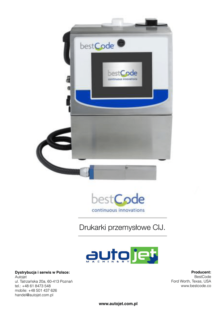 Drukarki przemysłowe CIJ. Producent: BestCode Ford Worth, Texas, USA www.bestcode.co Dystrybucja i serwis w Polsce: Autojet ul. Tatrzańska 20a, 60-413 Poznań tel.: +48 61 8473 548 mobile: +48 501 437 626 [email protected] www.autojet.com.pl Seria 8. Nowa generacja znakowania. Szybki. Bezkontaktowy. System Continuous Ink Jet (CIJ). Dzięki systemowi BestCode wydrukujesz m.in.: datę przydatności do spożycia, datę produkcji, numer partii i inne niezbędne oznaczenia i kody na produkcie. Pełna gama systemów druku przemysłowego. Systemy serii 8 gwarantują szybki i trwały nadruk znaków i kodów na różnych opakowaniach m.in.: na tworzywach sztucznych, szkle, metalu czy papierze. Modele drukarek BestCode: Zaprojektowane do pracy przez 7 dni w tygodniu, przez 24 godz. na dobę. W zależności od wersji przystosowane do druku od 2 do 5 linii tekstu. Model 88S, to urządzenie przygotowywane indywidualnie do współpracy z konkretnymi aplikacjami. Najlepsza jakość druku. System Truepoint zapewnia najlepszą jakość druku w technologii CIJ. Dzięki szybkiemu przetwarzaniu danych i specyficznym rozwiązaniom sprzętowym, tor lotu milionów kropel tuszu jest nieustannie kontrolowany i dostosowywany do wymagań operatora tak, aby zapewnić doskonałą jakość druku. Drukuj cokolwiek. Oznaczaj i umieszczaj kody na wszystkim. Głowice drukarek serii 8 zawsze czyste. Głowice drukarek serii 8 wykonane są z nierdzewnej stali przemysłowej tak, aby sprostać najbardziej wymagającym zadaniom. System CleanStart gwarantuje, że głowica będzie zawsze czysta i gotowa do rozpoczęcia pracy. Głowice serii 8 zbudowane są na bazie opracowanego przez BestCode generatora kropli. Pojedyncza rurka dostarcza zarówno rozpuszczalnik, jak i tusze eliminując potrzebę stosowania wielu wlotów/wylotów. Zintegrowany zawór zapewnia bezpośrednie dostarczenie rozpuszczalnika do dyszy i automatyczne czyszczenie kanalika. Drukarka jest gotowa do pracy w ciągu 60 sekund od włączenia. 1 minuta Gotowa do druku Tusze. Specjalnie dla serii 8 opracowany został cały wachlarz szybko- i błyskawicznie schnących tuszy na bazie MEK, acetonu, etanolu i acetonu/ etanolu w wielu kolorach. Dostępne są również specjalistyczne płyny przygotowane pod konkretne aplikacje. Drukarki serii 8 drukują w trzech szybkościach: szybko, szybciej i najszybciej. Pojedyncza linia tekstu może być drukowana z prędkością do 470 m/min., dwie linie do 200 m/ min. a trzy i cztery - do 100 m/min. Uproszczona obsługa, wydłużone działanie, niższe koszty eksploatacji. Drukarki serii 8 zaprojektowane są tak, aby maksymalnie wydłużyć okresy między koniecznymi czynnościami serwisowymi. Czytelniejszy i prostszy w obsłudze. Duży, 10,4-calowy wyświetlacz dotykowy zapewnia dobrą widoczność treści i łatwy dostęp do wszystkich informacji. Przyciski funkcyjne są duże, z intuicyjnymi ikonami wykorzystującymi kolory do wyświetlania szczegółowych informacji o statusie. Środowisko WYSIWYG daje możliwość obejrzenia projektu nadruku w bardzo realistyczny sposób. Dzięki funkcji „przeciągnij i upuść” umieszczenie nadruku w odpowiednim miejscu jest niezwykle proste. Produkty BestCode produkowane są z myślą o rynkach światowych. System charakteryzuje się m.in. możliwością wykorzystania czcionek narodowych w wielu językach i drukiem w systemie Unicode (ponad 60 tys. znaków). 10,4” Kolorowy, dotykowy wyświetlacz LCD Drukuj wszystko. Nie zmarnuj ani kropli. Zbiorniki opróżniane są do końca. Umieszczone na zewnątrz obudowy wlewy tuszu i rozpuszczalnika umożliwiają uzupełnienie płynów bez konieczności otwierania pokrywy. Zbiorniki są duże, co wydłuża czas bezobsługowego korzystania z urządzenia, a ich wyraźne oznaczenia i zróżnicowana wielkość minimalizują ryzyko pomyłki. Na pojemnikach z tuszem i rozpuszczalnikiem umieszczone są szczegółowe informacje dotyczące produktu i terminu przydatności. LargeVolume - zbiorniki na tusz i rozpuszczalnik. Drukarki serii 8 są gotowe do ciągłej, intensywnej pracy z dużym obciążeniem przy minimalnej obsłudze. Gwarantują to duże zbiorniki na tusz (wystarcza nawet na kilka miesięcy) i rozpuszczalnik (nawet ponad 1000 godzin pracy na jednym zbiorniku). 1000+godz. pracy Przemysłowe, zaprojektowane do pracy w ekstremalnych warunkach. Systemy serii 8 zostały zaprojektowane do pracy z najbardziej wymagającymi aplikacjami i w ekstremalnych warunkach. Działają w mokrym/suchym/zapylonym oraz zimnym/gorącym środowisku. Obudowa z przemysłowej stali nierdzewnej. Systemy BestCode budowane są z myślą o pracy przez długie lata. Zamknięte są w zwartej, lekkiej i niewielkiej obudowie gwarantującej pracę w ekstremalnie suchych i mokrych środowiskach (klasa IP55 i IP65). TempSense - system wentylacji. Automatyczne systemy detektorów, zróżnicowana szybkość wentylatora i specjalna budowa kanałów wentylacyjnych gwarantują odpowiednią temperaturę pracy drukarek. Wydajne filtry działają do 12 miesięcy. EcoTec - system zarządzania płynami. System EcoTec redukuje zużycie rozpuszczalnika, co skutkuje obniżeniem kosztów inwestycji i eksploatacji oraz wydłużeniem okresów między uzupełnieniem płynu i wymianą filtrów. EcoTec, to system złożony ze zbiornika własnej konstrukcji, pompy o zredukowanej liczbie cykli, filtra Smart Filter i podwójnej pułapki oparów zaprojektowanej dla technologii CIJ. Zbiornik został zaprojektowany z myślą o tym, by dotrwać do końca eksploatacji drukarki. Zmniejszona liczba cykli pompy wydłuża jej żywotność i obniża temperaturę działania, co skutkuje mniejszym parowaniem płynów. Kondensacja oparów i zredukowane parowanie rozpuszczalnika obniżają koszty użytkowania urządzania i ograniczają ingerencję użytkownika w funkcjonowanie drukarki. System monitoruje czas działania filtrów, śledząc ich zużycie i informując o konieczności wymiany. Filtry działają d