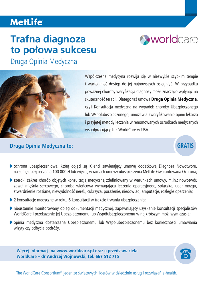 Trafna diagnoza to połowa sukcesu Druga Opinia Medyczna Współczesna medycyna rozwija się w niezwykle szybkim tempie i warto mieć dostęp do jej najnowszych osiągnięć. W przypadku poważnej choroby weryfikacja diagnozy może znacząco wpłynąć na skuteczność terapii. Dlatego też umowa Druga Opinia Medyczna, czyli Konsultacja medyczna na wypadek choroby Ubezpieczonego lub Współubezpieczonego, umożliwia zweryfikowanie opinii lekarza i przyjętej metody leczenia w renomowanych ośrodkach medycznych współpracujących z WorldCare w USA. Druga Opinia Medyczna to: GRATIS ochrona ubezpieczeniowa, którą objęci są Klienci zawierający umowę dodatkową Diagnoza Nowotworu, na sumę ubezpieczenia 100 000 zł lub więcej, w ramach umowy ubezpieczenia MetLife Gwarantowana Ochrona; szeroki zakres chorób objętych konsultacją medyczną zdefiniowany w warunkach umowy, m.in.: nowotwór, zawał mięśnia sercowego, choroba wieńcowa wymagająca leczenia operacyjnego, śpiączka, udar mózgu, stwardnienie rozsiane, niewydolność nerek, cukrzyca, porażenie, niedowład, amputacje, rozległe oparzenia; 2 konsultacje medyczne w roku, 6 konsultacji w trakcie trwania ubezpieczenia; nieustannie monitorowany obieg dokumentacji medycznej, zapewniający uzyskanie konsultacji specjalistów WorldCare i przekazanie jej Ubezpieczonemu lub Współubezpieczonemu w najkrótszym możliwym czasie; opinia medyczna dostarczana Ubezpieczonemu lub Współubezpieczonemu bez konieczności umawiania wizyty czy odbycia podróży. Więcej informacji na www.worldcare.pl oraz u przedstawiciela WorldCare – dr Andrzej Wojnowski, tel. 667 512 715 The WorldCare Consortium® jeden ze światowych liderów w dziedzinie usług i rozwiązań e-health. Druga Opinia Medyczna Konsultacja medyczna na wypadek choroby Ubezpieczonego lub Współubezpieczonego ,QIRUPDFMDGRW\F]ąFDXPRZ\GRGDWNRZHM'UXJD2SLQLD0HG\F]QD ,QIRUPDFMHZ]DNUHVLH 3RVWDQRZLHQLH SU]HVáDQHNZ\SáDW\ĞZLDGF]HQLD art. 4; art. 6 . RJraQLF]HĔ Rra] Z\áąF]HĔ RGSRZLHG]LaOQRĞFL art. 2; art. 4; art. 7 ]aNáaGX XEH]SLHF]HĔ XSraZQLaMąF\FK GR RGPRZ\ Z\Sáat\ ĞZLaGF]HQLa OXE MHJR REQLĪHQLa OGÓLNE WARUNKI UBEZPIECZENIA UMOWA DODATKOWA Niniejsze Ogólne Warunki Ubezpieczenia (dalej OWU) stanowią integralną część umowy ubezpieczenia i są dokumentem wiążącym strony. Znajdujące się w ramkach w treści OWU komentarze i wyjaśnienia nie stanowią treści OWU. Pełnią one jedynie funkcję informacyjną. POMOC Dla Państwa wygody wprowadziliśmy trzy rodzaje wyróżnień: Szanowni Państwo, w ramkach umieszczonych w treści OWU pojawiają się nasze komentarze zawierające podsumowanie najistotniejszych zagadnień. Mamy nadzieję, że SNOOPY – ambasador marki MetLife przybliży i objaśni Państwu trudne sformułowania użyte w OWU. Dodatkowo, słowa wyróżnione kursywą zostały zdefiniowane na początku dokumentu lub w OWU umowy podstawowej. WAŻNE Zwracamy Państwa uwagę na kluczowe kwestie dotyczące umowy dodatkowej. WYJAŚNIENIA Objaśniamy niektóre postanowienia umowy dodatkowej oraz trudne sformułowania użyte w treści OWU. PRZYKŁADY Wyjaśniamy, jak w praktyce stosowane są postanowienia umowy dodatkowej i jakie mają znaczenie dla osoby objętej ubezpieczeniem. ROZDZIAŁ I. POSTANOWIENIA OGÓLNE ARTYKUŁ 1. WSTĘP 1. Niniejsze OWU mają zastosowanie do umowy dodatkowej Konsultacja medyczna na wypadek choroby Ubezpieczonego lub Współubezpieczonego zawartej pomiędzy MetLife Towarzystwo Ubezpieczeń na Życie i Reasekuracji Spółka Akcyjna z siedzibą w Warszawie a Ubezpieczającym i stanowią integralną część tej umowy dodatkowej. 2. Umowa dodatkowa jest częścią umowy ubezpieczenia (dalej Umowa). Umowa dodatkowa jest zawierana na wniosek Ubezpieczającego i obejmuje ochroną Ubezpieczonego lub Współubezpieczonego, jeżeli tak stanowi Szczegółowa Umowa Ubezpieczenia. Ochroną ubezpieczeniową może zostać objęty odpowiednio Ubezpieczony lub Współubezpieczony, który w dacie wejścia w życie umowy dodatkowej ukończył 18. rok życia, a nie ukończył 61. roku życia. Składkę należną z tytułu umowy dodatkowej odpowiednio dla Ubezpieczonego i Współubezpieczonego określa Szczegółowa Umowa Ubezpieczenia. 1 Druga Opinia Medyczna ARTYKUŁ 2. DEFINICJE Definicje określeń użytych w niniejszych OWU: 1. Konsorcjum WorldCare (Konsorcjum) – sieć specjalistów medycznych, zorganizowana przez WorldCare International Ltd w celu udzielania osobom objętym ochroną konsultacji medycznej, zgodnie z umową dodatkową, na podstawie zawartej umowy o współpracy, 2. konsultacja medyczna – opłacenie przez Towarzystwo kosztów konsultacji medycznej uzyskanej przez Ubezpieczonego lub Współubezpieczonego w przypadku zdarzenia ubezpieczeniowego, zgodnie z umową dodatkową. Konsultacje medyczne przeprowadzane są przez specjalistów Konsorcjum w celu udzielenia pomocy Ubezpieczonemu lub Współubezpieczonemu i jego lekarzowi prowadzącemu w zakresie diagnostyki i zalecenia procesu leczenia, 3. reklamacja – każde wystąpienie Ubezpieczającego, Ubezpieczonego, Współubezpieczonego, Uposażonego lub uprawnionego z Umowy kierowane do Towarzystwa, w którym zgłasza zastrzeżenia dotyczące usług świadczonych przez Towarzystwo lub jego działalności, 4. rocznica umowy dodatkowej – dzień każdego kolejnego roku obowiązywania umowy dodatkowej, który odpowiada dacie wejścia w życie umowy dodatkowej, 5. rok obowiązywania umowy dodatkowej – okres pomiędzy kolejnymi rocznicami umowy dodatkowej, wliczając rocznicę rozpoczynającą dany okres. Pierwszy rok obowiązywania umowy dodatkowej rozpoczyna się od daty wejścia w życie umowy dodatkowej wskazanej w Szczegółowej Umowie Ubezpieczenia, 6. Współubezpieczony – wskazana w Szczegółowej Umowie Ubezpieczenia osoba fizyczna, objęta ochroną w ramach umowy dodatkowej. ROZDZIAŁ II. OCHRONA UBEZPIECZENIOWA I JEJ ZAKRES ARTYKUŁ 3. PRZEDMIOT UBEZPIECZENIA Przedmiotem
