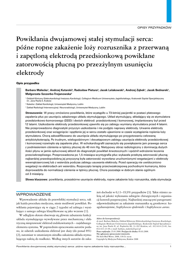OPISY PRZYPADKÓW Powikłania dwujamowej stałej stymulacji serca: późne ropne zakażenie loży rozrusznika z przerwaną i zapętloną elektrodą przedsionkową powikłane zatorowością płucną po przezżylnym usunięciu elektrody Opis przypadku Barbara Małecka1, Andrzej Kutarski2, Radosław Pietura3, Jacek Lelakowski1, Andrzej Ząbek1, Jacek Bednarek1, Małgorzata Szczerbo‑Trojanowska3 1 ddział Kliniczny Elektrokardiologii Instytutu Kardiologii, Collegium Medicum Uniwersytetu Jagiellońskiego, Krakowski Szpital Specjalistyczny O im. Jana Pawła II, Kraków 2 Katedra i Zakład Kardiologii, Uniwersytet Medyczny, Lublin 3 Zakład Radiologii Interwencyjnej i Neuroradiologii, Uniwersytet Medyczny, Lublin Streszczenie: W pracy omówiono powikłanie, które wystąpiło u 73-letniej pacjentki w postaci płatowego zapalenia płuc po usunięciu zakażonego układu stymulującego. Układ stymulujący, składający się ze stymulatora przedsionkowo-komorowego (DDD) i dwóch elektrod: przedsionkowej i komorowej, implantowany był przed 12 latami. Uszkodzenie elektrody przedsionkowej ujawniło się po zabiegu wymiany stymulatora przed 4 latami. Nie przeprowadzono diagnostyki przyczyn uszkodzenia i nie podjęto naprawy elektrody. Urwanie elektrody przedsionkowej oraz wciągnięcie i spętlenie jej w sercu zostało ujawnione w czasie wystąpienia ropienia loży stymulatora. Chorą zakwalifikowano do usunięcia układu stymulującego po przygotowaniu celowaną antybiotykoterapią. Po trudnym, wielogodzinnym i dwuetapowym zabiegu usunięcia elektrody przedsionkowej i komorowej rozwinęło się zapalenie płuc. W echokardiografii zaznaczyło się powiększenie jam prawego serca z podniesieniem ciśnienia w tętnicy płucnej do 40 mm Hg. Nietypowy obraz radiologiczny z dominacją dużych ilości płynu w jamie opłucnowej skłonił do diagnostyki powikłań krwotocznych i opóźnił wdrożenie leczenia przeciwkrzepliwego. Przeprowadzona po 1,5 miesiąca scyntygrafia płuc wykazała przebytą zatorowość płucną; najbardziej prawdopodobną jej przyczyną była zatorowość wywołana uruchomionymi wegetacjami z elektrody wewnątrzsercowej lub z wsierdzia podczas zabiegu usuwania elektrody. Przed operacją nie uwidoczniono wegetacji na elektrodach ani wsierdziu. Rozpoczęto terapię przeciwzakrzepową pochodnymi kumaryny, która doprowadziła do normalizacji ciśnienia w tętnicy płucnej. Chora pozostaje w dobrym stanie ogólnym od 3 miesięcy. Słowa kluczowe: powikłania, przezskórne usunięcie elektrody, ropne zakażenie loży rozrusznika, stała stymulacja WPROWADZENIE Wprowadzenie układu do przewlekłej stymulacji serca, tak jak każda procedura medyczna, niesie możliwość powikłań. Powikłania pojawiające się w ciągu 2 tygodni od zabiegu i wynikające z samego zabiegu klasyfikowane są jako wczesne [1]. W odległym okresie obserwuje się głównie zaburzenia funkcji układu stymulującego wywoływane przez mechaniczną i elektryczną niesprawność elektrod endokawitarnych – najsłabszego elementu systemu. W poprzednim opracowaniu autorów podano, że odsetek uszkodzenia elektrod jest duży (do ponad 8%) [2], natomiast w omawianym ośrodku zakażenia układu stymulującego należą do rzadkości. Według innych autorów do zaka- żeń dochodzi w 0,13–19,9% przypadków [3]. Takie różnice zależą od jakości wykonania zabiegów chirurgicznych i organizacji kontroli pooperacyjnej. Najbardziej znaczącymi patogenami odpowiedzialnymi za zakażenie rozrusznika są gronkowce: koagulazoujemne, Staphylococcus epidermidis i Staphylococcus aureus. Adres do korespondencji: dr med. Barbara Małecka, Oddział Kliniczny Elektrokardiologii Instytutu Kardiologii, Collegium Medicum Uniwersytetu Jagiellońskiego, Krakowski Szpital Specjalistyczny im. Jana Pawła II, ul. Prądnicka 80, 31-202 Kraków, tel.: 012-614-23-81, fax: 012-633-23-99, e-mail: [email protected] Praca wpłynęła: 25.01.2008. Przyjęta do druku: 05.03.2008. Nie zgłoszono sprzeczności interesów. Pol Arch Med Wewn. 2008; 118 (5): xx-xx Copyright by Medycyna Praktyczna, Kraków 2008 Powikłania dwujamowej stałej stymulacji serca: późne ropne zakażenie loży rozrusznika... 1 OPISY PRZYPADKÓW Ryc. 1. Obraz fluoroskopowy w projekcji PA przed usunięciem elektrod, pokazujący dwie elektrody wewnątrzsercowe – aktywną komorową i starą urwaną przedsionkową – wciągniętą, spętloną i przyrośniętą do ściany żyły próżnej górnej Opisany przypadek obrazuje związek między powikłaniami wynikającymi z mechanicznych uszkodzeń elektrod a zakażeniami układu stymulującego. OPIS PRZYPADKU Pacjentka 73-letnia z 12-letnim dwujamowym DDD (przedsionkowo-komorowym) układem do stałej stymulacji serca została zakwalifikowana do przeżylnego jego usunięcia z powodu ropienia loży stymulatora. Układ stymulujący składał się ze stymulatora dwujamowego DDD i dwóch dwubiegunowych elektrod o biernym mocowaniu w sercu. Elektroda przedsionkowa implantowana była do uszka prawego przedsionka, a elektroda komorowa do wierzchołka prawej komory. Stymulację serca wdrożono z powodu zaawansowanego bloku przedsionkowo-komorowego i stosowano ją z powodzeniem do czasu zabiegu wymiany stymulatora z powodu wyczerpania baterii, który wykonano 4 lata temu. W okresie pooperacyjnym chora stymulowana była w trybie VVI (stymulacja komorowa) ze stymulatora DDD (stymulator dwujamowy). Obecnie w czasie penetracji loży rozrusznika podczas usuwania układu z powodu jego infekcji stwierdzono urwanie elektrody w miejscu założenia nici podwiązującej, zaciśniętej na nakładce pogrubiającej osłonę zewnętrzną. Prawdopodobnie elektroda była bezobjawowo nadłamana w tym miejscu wcześniej, a podczas podciągania w czasie zabiegu wymiany stymulatora nastąpiło całkowite przerwanie jej ciągłości. Nierozpoznanie zjawiska urwania elektrody w okresie około- i pooperacyjnym i pozostawienie urwanej niezabezpieczonej końcówki d