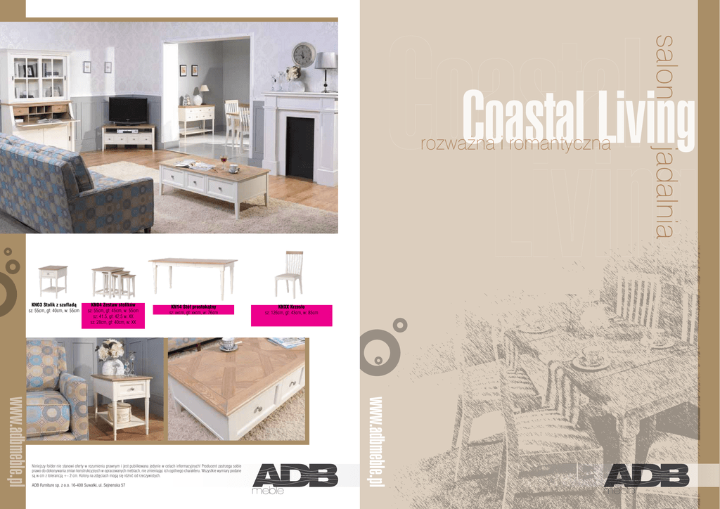 salon KN03 Stolik z szufladą sz: 55cm, gł: 40cm, w: 55cm KN04 Zestaw stolików sz: 55cm, gł: 45cm, w: 55cm sz: 41.5, gł: 42.5 w: XX sz: 28cm, gł: 40cm, w: XX KN14 Stół prostokątny sz: xxcm, gł: xxcm, w: 76cm ADB Furniture sp. z o.o. 16-400 Suwałki, ul. Sejnenska 57 www.adbmeble.pl www.adbmeble.pl Niniejszy folder nie stanowi oferty w rozumieniu prawnym i jest publikowana jedynie w celach informacyjnych! Producent zastrzega sobie prawo do dokonywania zmian konstrukcyjnych w opracowanych meblach, nie zmieniając ich ogólnego charakteru. Wszystkie wymiary podane są w cm z tolerancją +- 2 cm. Kolory na zdjęciach mogą się różnić od rzeczywistych. KNXX Krzesło sz: 126cm, gł: 43cm, w: 85cm jadalnia Coastal Living rozważna i romantyczna rozważna i romantyczna salon & jadalnia Coastal Coastal Living Living KN01 Konsola sz: 119,4cm, gł: 40cm, w: 80cm Naturalne blaty dębowe. Klasyczna forma kolekcji Coastal Living nadaje wnętrzu szczególnego wyrafinowania i stylu – to doskonała propozycja dla miłośników wyważonych proporcji i prostych, praktycznych rozwiązań. Biała kolorystyka i inspirowane naturą drewniane blaty i wykończenia wnoszą do jadalni odrobinę romantyzmu, ciepła i domowego klimatu. To tak, jakby połączyły się we wnętrzu aromaty porannej czarnej kawy i przed chwilą upieczonych bułeczek. kre m ivory www.adbmeble.pl Sekretarzyk z nadstawką KN07B Segment dolny sz: 124.5cm, gł: 44cm, w: 109cm KN07T Nadstawka sz: 124.5cm, gł: 36.8cm, w: 90cm ny kow ot zcz ły s bia biały 1TRKN10 Sideboard 3d/3sz. sz: 155cm, gł: 45cm, w: 85cm Witryna z nadstawką KN08B Segment dolny sz: 124.5cm, gł: 45cm, w: 75.5cm KN08T Nadstawka sz: 124.5cm, gł: 45cm, w: 123.5cm tył KN17 Szafka TV narożna sz: 110cm, gł: 53cm, w: 50cm KN02 Ława 3sz. sz: 123cm, gł: 65cm, w: 44cm