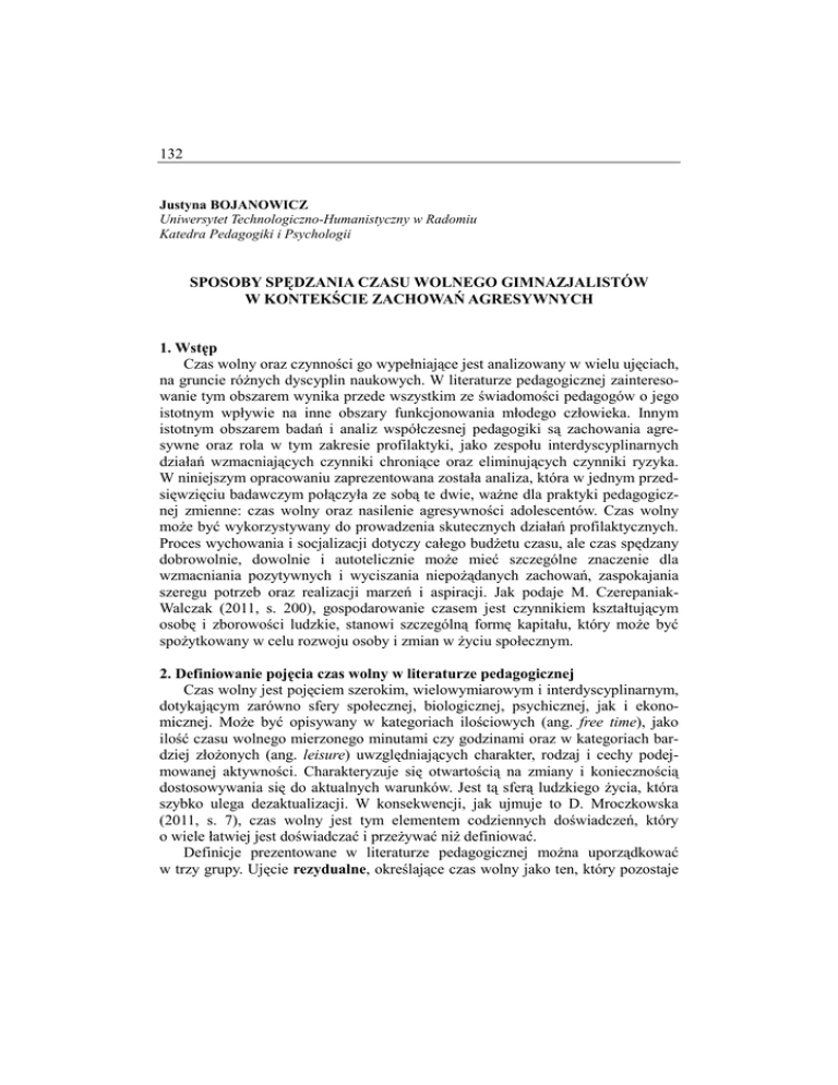 132 Justyna BOJANOWICZ Uniwersytet Technologiczno-Humanistyczny w Radomiu Katedra Pedagogiki i Psychologii SPOSOBY SPĘDZANIA CZASU WOLNEGO GIMNAZJALISTÓW W KONTEKŚCIE ZACHOWAŃ AGRESYWNYCH 1. Wstęp Czas wolny oraz czynności go wypełniające jest analizowany w wielu ujęciach, na gruncie róŜnych dyscyplin naukowych. W literaturze pedagogicznej zainteresowanie tym obszarem wynika przede wszystkim ze świadomości pedagogów o jego istotnym wpływie na inne obszary funkcjonowania młodego człowieka. Innym istotnym obszarem badań i analiz współczesnej pedagogiki są zachowania agresywne oraz rola w tym zakresie profilaktyki, jako zespołu interdyscyplinarnych działań wzmacniających czynniki chroniące oraz eliminujących czynniki ryzyka. W niniejszym opracowaniu zaprezentowana została analiza, która w jednym przedsięwzięciu badawczym połączyła ze sobą te dwie, waŜne dla praktyki pedagogicznej zmienne: czas wolny oraz nasilenie agresywności adolescentów. Czas wolny moŜe być wykorzystywany do prowadzenia skutecznych działań profilaktycznych. Proces wychowania i socjalizacji dotyczy całego budŜetu czasu, ale czas spędzany dobrowolnie, dowolnie i autotelicznie moŜe mieć szczególne znaczenie dla wzmacniania pozytywnych i wyciszania niepoŜądanych zachowań, zaspokajania szeregu potrzeb oraz realizacji marzeń i aspiracji. Jak podaje M. CzerepaniakWalczak (2011, s. 200), gospodarowanie czasem jest czynnikiem kształtującym osobę i zborowości ludzkie, stanowi szczególną formę kapitału, który moŜe być spoŜytkowany w celu rozwoju osoby i zmian w Ŝyciu społecznym. 2. Definiowanie pojęcia czas wolny w literaturze pedagogicznej Czas wolny jest pojęciem szerokim, wielowymiarowym i interdyscyplinarnym, dotykającym zarówno sfery społecznej, biologicznej, psychicznej, jak i ekonomicznej. MoŜe być opisywany w kategoriach ilościowych (ang. free time), jako ilość czasu wolnego mierzonego minutami czy godzinami oraz w kategoriach bardziej złoŜonych (ang. leisure) uwzględniających charakter, rodzaj i cechy podejmowanej aktywności. Charakteryzuje się otwartością na zmiany i koniecznością dostosowywania się do aktualnych warunków. Jest tą sferą ludzkiego Ŝycia, która szybko ulega dezaktualizacji. W konsekwencji, jak ujmuje to D. Mroczkowska (2011, s. 7), czas wolny jest tym elementem codziennych doświadczeń, który o wiele łatwiej jest doświadczać i przeŜywać niŜ definiować. Definicje prezentowane w literaturze pedagogicznej moŜna uporządkować w trzy grupy. Ujęcie rezydualne, określające czas wolny jako ten, który pozostaje 133 do dyspozycji jednostki po wykonaniu czynności obowiązkowych (m.in.: E. Wnuk-Lipiński (1972), A.Kamiński (1965), J. Dumazedier (za M. Łobocki 1994, s. 99), W. Siwiński (1996, s. 63)), zaznaczając wyraźnie jego opozycyjność do czasu pracy i obowiązków. Drugą grupę stanowią definicje funkcyjne, czyli ukazujące cele, które powinny być realizowane w czasie wolnym. W. Siwiński (1996, s. 63) definiując czas wolny wskazuje na dobrowolność dokonywanego przez jednostkę wyboru, ale jednocześnie przypisuje mu takie funkcje, jak: regeneracja sił, rozwój intelektualny, integrowanie Ŝycia rodzinnego czy udział w Ŝyciu społecznym. M. Czerepaniak-Walczak (1997, s. 29) stwierdza natomiast, Ŝe czas wolny słuŜy doskonaleniu osobowości oraz przywracaniu i utrzymywaniu równowagi psychofizycznej w organizmie człowieka. Z kolei B. Matyjas (2003, s. 559) podaje, Ŝe czas wolny jest racjonalnie wykorzystywany do: wypoczynku, tj. regeneracji sił fizycznych i psychicznych, rozrywki, działalności społecznej o charakterze dobrowolnym i bezinteresownym, rozwoju zainteresowań i uzdolnień jednostki poprzez zdobywanie wiedzy i amatorską działalność artystyczną, techniczną, naukową czy sportową. Trzecią grupę stanowią definicje podkreślające subiektywność pojęcia czas wolny. Istotnym atrybutem w tej grupie definicji są odczucia jednostek, co do aktywności w czasie wolnym przez nie podejmowanych. M. Czerepaniak-Walczak (2007, s. 222; 2007a, s. 306-313; 2011 s. 205-206) definicje oparte na wymienionym kryterium nazywa atrybutywnymi (zawierające osobliwe atrybuty, które są specyficzne i wyłączne dla tego czasu w Ŝyciu osoby), natomiast G. Chick (za J. Grad 2011, s. 115) określa ten rodzaj pojmowania czasu wolnego jako „pewien stan umysłu, subiektywne doświadczenia, przeŜycia związane z czasem wolnym”. Czas wolny dzieci i młodzieŜy jest definiowany podobnie jak czas wolny dorosłych, jako okres czasu, który pozostaje po wypełnieniu czynności obowiązkowych, takich jak: sen, nauka szkolna i domowa, czynności związane z samoobsługą oraz pomocą w pracach domowych. Jest czasem, którym dziecko moŜe dysponować według własnego uznania, przeznaczając go na wypoczynek, rozrywkę oraz zaspokojenie zainteresowań (B. Matyjas 2003; T. Wujek 1969). Dostrzega się jednak istotną róŜnicę w poziomie swobody w zakresie gospodarowania tym czasem mniejsza dobrowolność jest udziałem dorastających niŜ dorosłych. Jak pisze M. Łobocki (1994, s. 99), nie moŜna się zgodzić na zbyt rozległy zasięg swobód, przysługujący dorastającym i nie do przyjęcia jest załoŜenie E. Key, Ŝe wypoczynek powinien być po prostu wypoczynkiem, tj. swobodą czynienia tego, co się podoba, lub nierobienia niczego. Czas wolny moŜe zostać zagospodarowany czynnościami przynoszącymi korzyści osobiste i zbiorowe, ale moŜe być równieŜ wypełniony próŜniaczeniem, zachowaniami pasoŜytniczymi lub innymi przynoszącymi szkody osobie i jej otoczeniu (M. Czerepaniak-Walczak 2011, s. 201). Dlatego czas wolny dorastających powinien podlegać pewnej kontroli i interwencji dorosłych. Nie moŜna jednak zapominać o znalezieniu właściwej proporcji pomiędzy swobodą a kontrolą, poniewaŜ obserwuje się równieŜ takie sytuacje, gdzie dorastający są przemęczeni, a wręcz