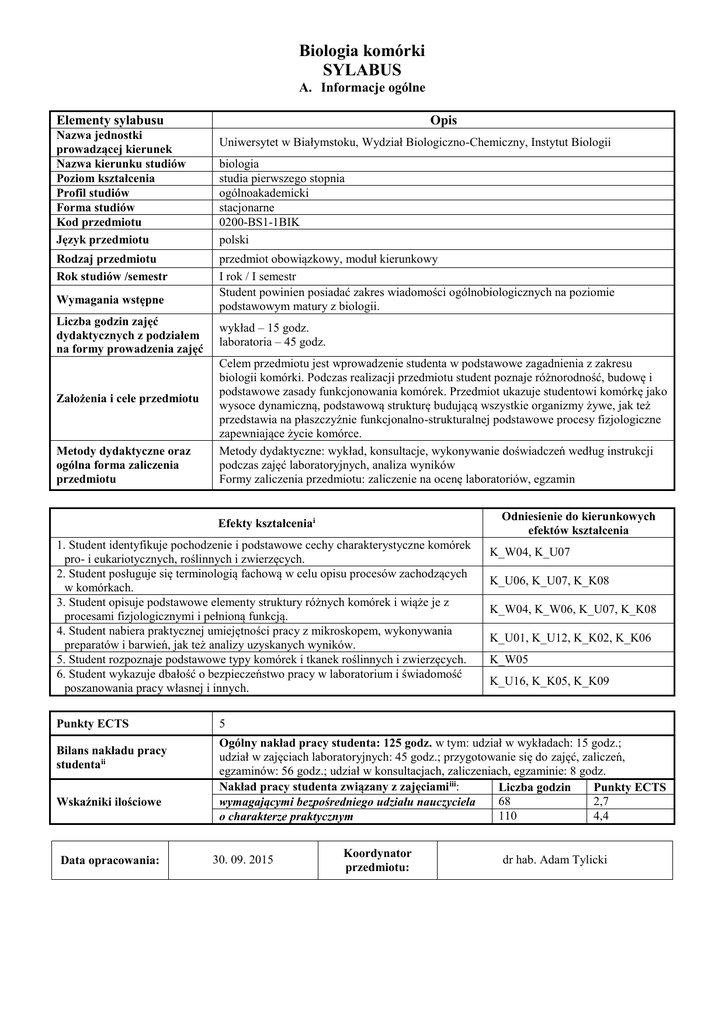 Biologia komórki SYLABUS - BIOL-CHEM UWB