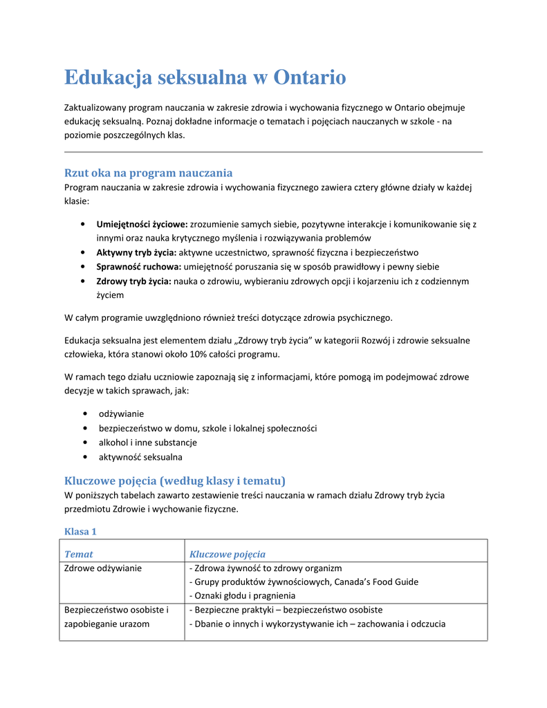 Edukacja seksualna w Ontario Zaktualizowany program nauczania w zakresie zdrowia i wychowania fizycznego w Ontario obejmuje edukację seksualną. Poznaj dokładne informacje o tematach i pojęciach nauczanych w szkole - na poziomie poszczególnych klas. Rzut oka na program nauczania Program nauczania w zakresie zdrowia i wychowania fizycznego zawiera cztery główne działy w każdej klasie: • Umiejętności życiowe: zrozumienie samych siebie, pozytywne interakcje i komunikowanie się z innymi oraz nauka krytycznego myślenia i rozwiązywania problemów • Aktywny tryb życia: aktywne uczestnictwo, sprawność fizyczna i bezpieczeństwo • Sprawność ruchowa: umiejętność poruszania się w sposób prawidłowy i pewny siebie • Zdrowy tryb życia: nauka o zdrowiu, wybieraniu zdrowych opcji i kojarzeniu ich z codziennym życiem W całym programie uwzględniono również treści dotyczące zdrowia psychicznego. Edukacja seksualna jest elementem działu „Zdrowy tryb życia” w kategorii Rozwój i zdrowie seksualne człowieka, która stanowi około 10% całości programu. W ramach tego działu uczniowie zapoznają się z informacjami, które pomogą im podejmować zdrowe decyzje w takich sprawach, jak: • • • • odżywianie bezpieczeństwo w domu, szkole i lokalnej społeczności alkohol i inne substancje aktywność seksualna Kluczowe pojęcia (według klasy i tematu) W poniższych tabelach zawarto zestawienie treści nauczania w ramach działu Zdrowy tryb życia przedmiotu Zdrowie i wychowanie fizyczne. Klasa 1 Temat Zdrowe odżywianie Bezpieczeństwo osobiste i zapobieganie urazom Kluczowe pojęcia - Zdrowa żywność to zdrowy organizm - Grupy produktów żywnościowych, Canada’s Food Guide - Oznaki głodu i pragnienia - Bezpieczne praktyki – bezpieczeństwo osobiste - Dbanie o innych i wykorzystywanie ich – zachowania i odczucia Stosowanie używek, uzależnienia i związane z tym zachowania Rozwój i zdrowie seksualne człowieka (edukacja seksualna) - Bezpieczeństwo w szkole - Potencjalne zagrożenia w domu, w lokalnej społeczności, na wolnym powietrzu - Niezdrowe nawyki, zdrowe alternatywy - Części ciała - Zmysły i funkcje - Czynności higieniczne Klasa 2 � Temat Zdrowe odżywianie Bezpieczeństwo osobiste i zapobieganie urazom Stosowanie używek, uzależnienia i związane z tym zachowania Rozwój i zdrowie seksualne człowieka (edukacja seksualna) Kluczowe pojęcia - Publikacja Canada’s Food Guide – rośnij zdrowo - Wybór produktów żywnościowych (przekąski, posiłki) - Bezpieczeństwo osobiste – w domu i na wolnym powietrzu - Alergie pokarmowe - Bycie sobą i obrona własnych przekonań - Relacje z innymi - Leki dostępne na receptę i bez recepty - Lekarstwa, zdrowe alternatywy - Stadia rozwoju - Zdrowie jamy ustnej (np. mycie zębów, stosowanie nici dentystycznej, wizyty u dentysty) Klasa 3 � Temat Zdrowe odżywianie Bezpieczeństwo osobiste i zapobieganie urazom Kluczowe pojęcia - Pochodzenie żywności, wartość odżywcza i wpływ na środowisko - Zdrowie jamy ustnej, wybór produktów żywnościowych - Lokalne i kulturowe produkty żywnościowe, wybór sposobu odżywiania - Wytyczne w zakresie bezpieczeństwa poza szkołą - Przemoc realna i fikcyjna Stosowanie używek, uzależnienia i związane z tym zachowania - Wpływ stosowania substancji legalnych i nielegalnych - Podejmowanie decyzji – stosowanie substancji/zachowania Rozwój i zdrowie seksualne człowieka (edukacja - Zdrowe relacje - Rozwój fizyczny i emocjonalny seksualna) - Różnice widoczne i niewidoczne, szacunek Klasa 4 � Temat Zdrowe odżywianie Bezpieczeństwo osobiste i zapobieganie urazom Stosowanie używek, uzależnienia i związane z tym zachowania Rozwój i zdrowie seksualne człowieka (edukacja seksualna) Kluczowe pojęcia - Składniki odżywcza - Wybór produktów żywnościowych, cele zdrowego odżywiania - Wybór produktów żywnościowych w różnych warunkach - Bezpieczne korzystanie z technologii - Znęcanie się i przemoc - Podejmowanie decyzji – ocena ryzyka - Wyroby tytoniowe - Decyzje dotyczące palenia - Krótko- i długoterminowe skutki palenia - Dojrzewanie – zmiany, skutki emocjonalne i społeczne - Dojrzewanie – higiena osobista i pielęgnacja Klasa 5 � Temat Zdrowe odżywianie Stosowanie używek, uzależnienia i związane z tym zachowania Kluczowe pojęcia - Tabele wartości odżywczych, etykiety produktów żywnościowych - Wpływ mediów – wybór produktów żywnościowych - Wsparcie – zapobieganie urazom, nagłe wypadki, znęcanie się, przemoc - Strategie – zagrożenie bezpieczeństwa osobistego - Działania, dobrostan emocjonalny - Krótko- i długoterminowe efekty spożycia alkoholu - Umiejętność odmowy – spożycie alkoholu i inne zachowania - Decyzje dotyczące picia alkoholu, wpływy Rozwój i zdrowie seksualne człowieka (edukacja seksualna) - Układ rozrodczy - Menstruacja, wytwarzanie spermy - Stres emocjonalny i interpersonalny w okresie dojrzewania Bezpieczeństwo osobiste i zapobieganie urazom Klasa 6 � Temat Zdrowe odżywianie Bezpieczeństwo osobiste i Kluczowe pojęcia - Co wpływa na zdrowe odżywianie - Wskazówki i wytyczne dotyczące odżywiania - Korzyści płynące ze zdrowego odżywiania/trybu życia - Bezpieczne i pozytywne interakcje społeczne, rozwiązywanie konfliktów zapobieganie urazom Stosowanie używek, uzależnienia i związane z tym zachowania Rozwój i zdrowie seksualne człowieka (edukacja seksualna) - Odpowiedzialność, ryzyko – dbałość o siebie i innych praktyki sprzyjające bezpieczeństwu - Skutki stosowania konopi indyjskich, nielegalne narkotyki - Wsparcie – użycie substancji, zachowania uzależniające - Strategie, bezpieczne opcje, wpływy: tytoń, alkohol, konopie indyjskie - Rozwój jednostki i zrozumienie samego siebie - Zrozumienie zmian zachodzących podczas dojrzewania, zdrowe relacje - Podejmowanie decyzji w relacjach z innymi - Stereotypy i przesądy – wpł