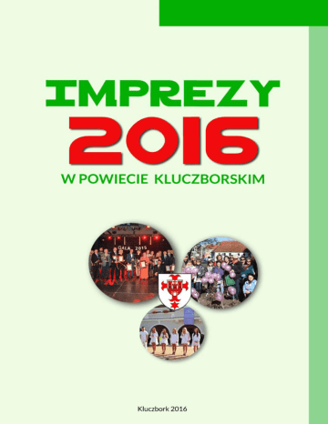Szanowni Państwo, przedstawiamy kalendarz imprez kulturalnych, sportowych i turystycznych powiatu kluczborskiego na 2016 rok. Treść publikacji została opracowana na podstawie materiałów nadesłanych przez organizatorów imprez. Wydawca nie ponosi odpowiedzialności za treść i zmianę terminu wydarzeń. Szczegółowe informacje na temat zaplanowanych przedsięwzięć dostępne są u organizatorów. Mamy nadzieję, że wydawnictwo to będzie przewodnikiem po bogatej ofercie imprez odbywających się na Ziemi Kluczborskiej i zachęci mieszkańców oraz turystów do czynnego w nich udziału. STYCZEŃ 6.01.2016 KLUCZBORK X Świąteczno-Noworoczny Koncert Kolęd miejsce: Kościół pw. Najświętszego Serca Pana Jezusa organizator: Kluczborski Dom Kultury, kluczborskie parafie kontakt: KDK, ul. Mickiewicza 5, 46-200 Kluczbork, tel./faks 77 418 12 68, [email protected], www.kluczborskidomkultury.eu, www.facebook.com/kluczborski.domkultury 8.01.2016 KLUCZBORK Spotkanie opłatkowe członków Uniwersytetu Trzeciego Wieku miejsce: Wojewódzki Ośrodek Dokształcania i Doskonalenia Zawodowego organizator: Stowarzyszenie Uniwersytet Trzeciego Wieku kontakt: ul. Rynek 1 - Ratusz, 46-200 Kluczbork, tel. 511 723 106, [email protected], www.u3w.kluczbork.pl 8.01.2016 WOŁCZYN Piłka ręczna – dziewczęta – zawody powiatowe – gimnazjum organizator: Gimnazjalno-Licealny Zespół Szkół w Wołczynie kontakt: ul. Rzeczna 6, 46-250 Wołczyn, tel. 77 407 21 80, [email protected], http://glzs.wolczyn.pl 10.01.2016 WOŁCZYN XXIV Finał Wielkiej Orkiestry Świątecznej Pomocy organizator: Wołczyński Ośrodek Kultury kontakt: ul. Opolska 2, 46-250 Wołczyn, tel. 77 418 86 92, [email protected], www.dom-kultury-wolczyn.eu, www.facebook.com/WolczynskiOsrodekKultury 10.01.2016 KLUCZBORK Wielka Orkiestra Świątecznej Pomocy organizator: Ośrodek Sportu i Rekreacji w Kluczborku, Urząd Miejski w Kluczborku, Kluczborski Dom Kultury kontakt: OSiR, ul. Mickiewicza 10, 46-200 Kluczbork, tel. 77 418 65 94, faks 77 418 21 91, [email protected], www.osir.kluczbork.pl 10.01.2016 BYCZYNA 24 Finał Wielkiej Orkiestry Świątecznej Pomocy miejsce: Sala Ośrodka Kultury organizator: Ośrodek Kultury w Byczynie kontakt: ul. Borkowska 1, 46-220 Byczyna, tel./faks 77 413 41 65, [email protected], www.ok.byczyna.pl 12.01.2016 KLUCZBORK Koncert kolędowy dla nauczycieli-emerytów ze ZNP miejsce: Warsztaty Zespołu Szkół Ponadgimnazjalnych Nr 1 organizator: Związek Nauczycielstwa Polskiego Oddział w Kluczborku kontakt: pl. Niepodległości 5, 46-200 Kluczbork, tel. 77 418 13 03 12.01.2016 Bal Przedszkolaka 2 WOŁCZYN organizator: Publiczne Przedszkole w Wołczynie kontakt: ul. Sienkiewicza 1, 46-250 Wołczyn, tel. 77 418 83 85, [email protected] 13.01.-30.03.2016 KLUCZBORK Zbiorowe spacery (w każdą środę) organizator: Polski Związek Emerytów, Rencistów i Inwalidów Zarząd Rejonowy Kluczbork kontakt: ul. Rynek 1 – Ratusz, 46-200 Kluczbork, tel. 516 575 787 15.01.2016 BYCZYNA Spotkanie Opłatkowe Sołectw Gminy Byczyna miejsce: Sala Ośrodka Kultury organizator: Ośrodek Kultury w Byczynie kontakt: ul. Borkowska 1, 46-220 Byczyna, tel./faks 77 413 41 65, [email protected], www.ok.byczyna.pl 16.01.2016 KLUCZBORK Biesiada okolicznościowa: Opłatek organizator: Polski Związek Emerytów, Rencistów i Inwalidów Zarząd Rejonowy Kluczbork, Koła terenowe: Bogacica, Byczyna, Wołczyn kontakt: PZERiI Zarząd Kluczbork, ul. Rynek 1 – Ratusz, 46-200 Kluczbork, tel. 516 575 787 16.01.2016 KLUCZBORK Mecz piłki siatkowej o mistrzostwo II Ligi miejsce: Hala Ośrodka Sportu i Rekreacji organizator: Uczniowski Klub Sportowy „MICKIEWICZ” Kluczbork kontakt: ul. Mickiewicza 10, 46-200 Kluczbork, tel./faks 77 418 12 31, [email protected], http://uksmickiewicz.pl, www.facebook.com/uksmickiewiczkluczbork 18.01.2016 KLUCZBORK Spotkanie Noworoczne dla przedstawicieli związków kombatanckich i emeryckich oraz wspierających je organizacji pozarządowych miejsce: Sala konferencyjna Urzędu Miejskiego i Starostwa Powiatowego organizator: Starostwo Powiatowe w Kluczborku kontakt: ul. Katowicka 1, 46-200 Kluczbork, tel. 77 418 52 18, faks 77 418 65 20, [email protected], www.powiatkluczborski.pl, https://pl-pl.facebook.com/powiatkluczborski 21.01.2016 BOGACICA Dzień Seniora miejsce: Sala Wiejska organizator: Publiczna Szkoła Podstawowa w Bogacicy im. Bohaterów II Brygady Pancernej kontakt: ul. Szkolna 10, 46-243 Bogacica, tel. 77 414 86 17, [email protected], www.psp.bogacica.pl 21.01.2016 BYCZYNA Obchody Święta Babci i Dziadka miejsce: Sala Ośrodka Kultury organizator: Ośrodek Kultury w Byczynie kontakt: ul. Borkowska 1, 46-220 Byczyna, tel./faks 77 413 41 65, [email protected], www.ok.byczyna.pl 22.01.2016 WOŁCZYN Piłka koszykowa – chłopcy – zawody powiatowe – gimnazjum organizator: Gimnazjalno-Licealny Zespół Szkół w Wołczynie kontakt: ul. Rzeczna 6, 46-250 Wołczyn, tel. 77 407 21 80, [email protected], http://glzs.wolczyn.pl 24.01.2016 BYCZYNA Obchody „Bitwy pod Byczyną” organizator: Gmina Byczyna kontakt: ul. Rynek 1, 46-220 Byczyna, tel. 77 413 41 50, [email protected], www.byczyna.pl 25.01.2016 Spotkanie integracyjne pt. Comber B@bski 3 KLUCZBORK miejsce: Sala konferencyjna Urzędu Miejskiego i Starostwa Powiatowego organizator: Stowarzyszenie Regionu Kluczborskiego „Kobietom-Mammograf” kontakt: ul. Rynek 1, 46–200 Kluczbork, (adres do korespondencji: ul. Ficka 16, 46-200 Kluczbork), tel. 505 794 181, [email protected] 26.01.2016 WOŁCZYN Gminny Przegląd Zespołów Jasełkowych organizator: Wołczyński Ośrodek Kultury kontakt: ul. Opolska 2, 46-250 Wołczyn, tel. 77 418 86 92, [email protected], www.dom-kultury-wolczyn.eu, www.facebook.com/WolczynskiOsrodekKultury 26.01.2016 KLUCZBORK Halowa piłka nożna chłopców – półfinał wojewódzki szkół ponadgimnazjalnych miejsce: Zespół Szkół Ogólnokształcących organizator: Powiatowy Ośrodek Doskonalenia Nauczycieli w Kluczbo