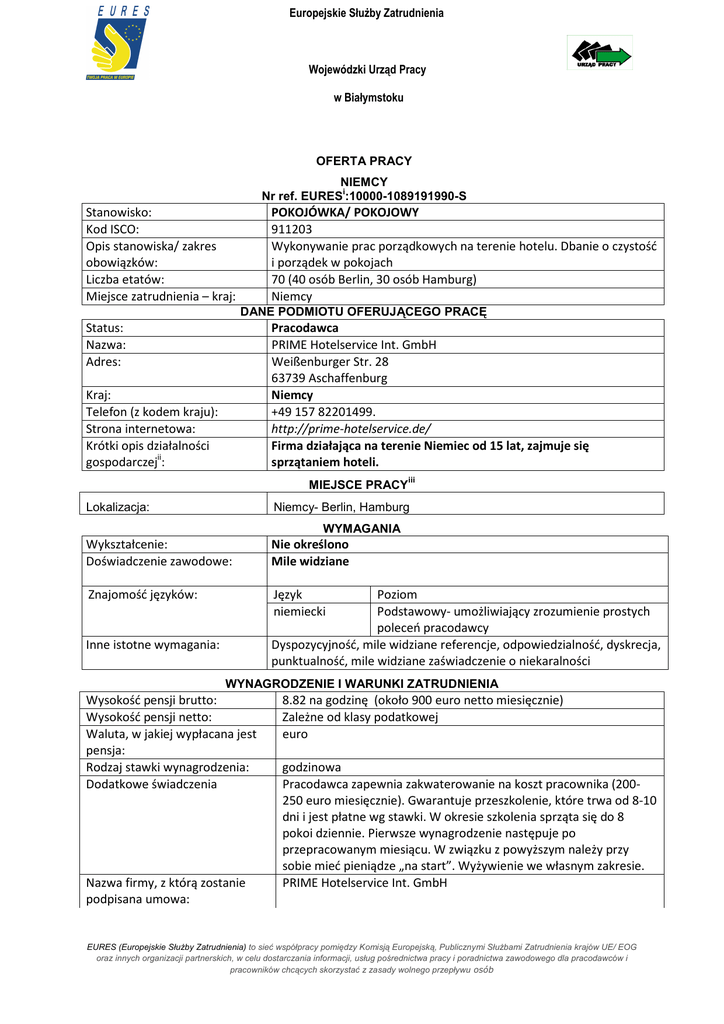 Europejskie Służby Zatrudnienia Wojewódzki Urząd Pracy w Białymstoku OFERTA PRACY NIEMCY i Nr ref. EURES :10000-1089191990-S POKOJÓWKA/ POKOJOWY 911203 Wykonywanie prac porządkowych na terenie hotelu. Dbanie o czystość i porządek w pokojach 70 (40 osób Berlin, 30 osób Hamburg) Niemcy Stanowisko: Kod ISCO: Opis stanowiska/ zakres obowiązków: Liczba etatów: Miejsce zatrudnienia – kraj: DANE PODMIOTU OFERUJĄCEGO PRACĘ Pracodawca PRIME Hotelservice Int. GmbH Weißenburger Str. 28 63739 Aschaffenburg Niemcy +49 157 82201499. http://prime-hotelservice.de/ Firma działająca na terenie Niemiec od 15 lat, zajmuje się sprzątaniem hoteli. Status: Nazwa: Adres: Kraj: Telefon (z kodem kraju): Strona internetowa: Krótki opis działalności gospodarczejii: MIEJSCE PRACY iii Lokalizacja: Niemcy- Berlin, Hamburg Wykształcenie: Doświadczenie zawodowe: Nie określono Mile widziane Znajomość języków: Język niemiecki WYMAGANIA Poziom Podstawowy- umożliwiający zrozumienie prostych poleceń pracodawcy Dyspozycyjność, mile widziane referencje, odpowiedzialność, dyskrecja, punktualność, mile widziane zaświadczenie o niekaralności Inne istotne wymagania: WYNAGRODZENIE I WARUNKI ZATRUDNIENIA Wysokość pensji brutto: Wysokość pensji netto: Waluta, w jakiej wypłacana jest pensja: Rodzaj stawki wynagrodzenia: Dodatkowe świadczenia Nazwa firmy, z którą zostanie podpisana umowa: 8.82 na godzinę (około 900 euro netto miesięcznie) Zależne od klasy podatkowej euro godzinowa Pracodawca zapewnia zakwaterowanie na koszt pracownika (200250 euro miesięcznie). Gwarantuje przeszkolenie, które trwa od 8-10 dni i jest płatne wg stawki. W okresie szkolenia sprząta się do 8 pokoi dziennie. Pierwsze wynagrodzenie następuje po przepracowanym miesiącu. W związku z powyższym należy przy sobie mieć pieniądze „na start”. Wyżywienie we własnym zakresie. PRIME Hotelservice Int. GmbH EURES (Europejskie Służby Zatrudnienia) to sieć współpracy pomiędzy Komisją Europejską, Publicznymi Służbami Zatrudnienia krajów UE/ EOG oraz innych organizacji partnerskich, w celu dostarczania informacji, usług pośrednictwa pracy i poradnictwa zawodowego dla pracodawców i pracowników chcących skorzystać z zasady wolnego przepływu osób Rodzaj umowy: Wymiar czasu pracy Czas trwania umowy: Liczba godzin tygodniowo: Data rozpoczęcia: Umowa o pracę Praca na pełen etat określony Data wygaśnięcia umowy (w przypadku umowy na czas określony): 40 Do uzgodnienia z pracodawcą Umowa na 1 rok z możliwością przedłużenia SPOSÓB SKŁADANIA WNIOSKU Wymagane dokumenty CV oraz ewentualne referencje (list motywacyjny, CV itp.): Język, w którym muszą być Polski lub niemiecki sporządzone przedkładane dokumenty: Do kogo należy wysłać dokumenty: Do pracodawcy (do pracodawcy/ doradcy EURES) Gdzie należy wysłać dokumenty: PRIME Hotelservice Int. GmbH (adres, adres e-mail, nr faksu z Weißenburger Str. 28 kodem kraju itp.) 63739 Aschaffenburg Deutschland Należy wskazać miejsce pracy – Berlin lub Hamburg Dane teleadresowe doradcy EURES Dodatkowych informacji udziela przedstawiciel pracodawcy Pani lub przedstawiciela pracodawcy: Tamara Majchrzak tel.: (nazwisko, adres, telefon, fax, e-mail +49 15782201499 itp.) (informacje są udzielane w języku polskim) WAŻNOŚĆ Data publikacji: 29.08.2012r. Termin przedkładania podań o pracę / zakończenia ważności oferty: 31.10.2012r. Uprzejmie informujemy, że skontaktujemy się wyłącznie z wybranymi kandydatami. UWAGA: Umowa z zagranicznym pracodawcą zostanie zawarta zgodnie z prawem kraju zatrudnienia. Oznacza to, że wszystkie roszczenia odnośnie do warunków, które obejmuje umowa, można kierować wyłącznie do odpowiedniego sądu w kraju zatrudnienia. Publiczne służby zatrudnienia (EURES) nie mogą pośredniczyć ani reprezentować pracownika w sądzie kraju zatrudnienia w przypadku sporu z pracodawcą. Publiczne służby zatrudnienia (EURES) dokładają wszelkich starań, aby zapewnić rzetelność i wiarygodność ofert pracy zgłoszonych w lokalnym urzędzie pracy. Należy wyjaśnić, że oferta pracy została zgłoszona przez stronę trzecią i EURES nie odpowiada za ewentualne rozbieżności między warunkami pracy określonymi w ofercie pracy i warunkami oferowanymi przez potencjalnego pracodawcę. Publiczne służby zatrudnienia (EURES) informują, że będą zbierać, przetwarzać i przekazywać potencjalnym pracodawcom zgodnie z przepisami dotyczącymi ochrony danych osobowych wszystkie dane osobowe dostarczone przez osoby poszukujące pracy. i Nr ref. na portalu EURES www.eures.europa.eu . Dotyczy ofert pracy publicznych służb zatrudnienia, których bazy danych ofert pracy nie są połączone z portalem EURES. ii Informacje o firmie, takie jak: status prawny, sektor, typ działalności, rodzaj produktów lub świadczonych usług, data rozpoczęcia działalności gospodarczej, liczba pracowników itp. iii Miejsce, w którym będzie wykonywana praca. Należy wypełnić w przypadku gdy: 1) miejsce wykonywania pracy jest inne niż siedziba podmiotu oferującego pracę, 2) pracę oferuje agencja pośrednictwa pracy/ agencja pracy tymczasowej. EURES (Europejskie Służby Zatrudnienia) to sieć współpracy pomiędzy Komisją Europejską, Publicznymi Służbami Zatrudnienia krajów UE/ EOG oraz innych organizacji partnerskich, w celu dostarczania informacji, usług pośrednictwa pracy i poradnictwa zawodowego dla pracodawców i pracowników chcących skorzystać z zasady wolnego przepływu osób