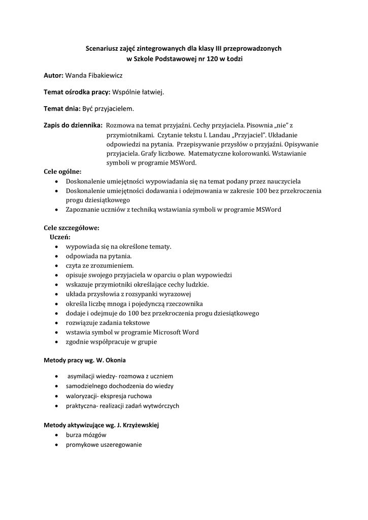 Scenariusz zajęć zintegrowanych dla klasy III przeprowadzonych w Szkole Podstawowej nr 120 w Łodzi Autor: Wanda Fibakiewicz Temat ośrodka pracy: Wspólnie łatwiej. Temat dnia: Być przyjacielem. Zapis do dziennika: Rozmowa na temat przyjaźni. Cechy przyjaciela. Pisownia „nie” z przymiotnikami. Czytanie tekstu I. Landau „Przyjaciel”. Układanie odpowiedzi na pytania. Przepisywanie przysłów o przyjaźni. Opisywanie przyjaciela. Grafy liczbowe. Matematyczne kolorowanki. Wstawianie symboli w programie MSWord. Cele ogólne: Doskonalenie umiejętności wypowiadania się na temat podany przez nauczyciela Doskonalenie umiejętności dodawania i odejmowania w zakresie 100 bez przekroczenia progu dziesiątkowego Zapoznanie uczniów z techniką wstawiania symboli w programie MSWord Cele szczegółowe: Uczeń: wypowiada się na określone tematy. odpowiada na pytania. czyta ze zrozumieniem. opisuje swojego przyjaciela w oparciu o plan wypowiedzi wskazuje przymiotniki określające cechy ludzkie. układa przysłowia z rozsypanki wyrazowej określa liczbę mnoga i pojedynczą rzeczownika dodaje i odejmuje do 100 bez przekroczenia progu dziesiątkowego rozwiązuje zadania tekstowe wstawia symbol w programie Microsoft Word zgodnie współpracuje w grupie Metody pracy wg. W. Okonia asymilacji wiedzy- rozmowa z uczniem samodzielnego dochodzenia do wiedzy waloryzacji- ekspresja ruchowa praktyczna- realizacji zadań wytwórczych Metody aktywizujące wg. J. Krzyżewskiej burza mózgów promykowe uszeregowanie Formy pracy: zbiorowa jednolita, indywidualna jednolita grupowa jednolita Środki dydaktyczne: podręczniki dla klasy III „ razem w szkole”; przygotowane ćwiczenia do pracy z tablicą multimedialną; domino matematyczne; program komputerowy „Razem w szkole”; nagranie magnetofonowe „ Zawsze razem”; kartony do wykonania „pomocnych dłoni” Przebieg zajęć: 1. Wprowadzenie do tematyki zajęć a) Przygotowanie „pomocnych dłoni”- uczniowie odrysowują swoja dłoń, wycinają ja , a następnie wpisują na niej odpowiedz na pytanie „ W jaki sposób mogę pomóc koledze? b) Prezentują swoje dłonie , przypinają je na tablicy c) Omawiają zapisy d) Przedstawienie tematu zajęć – prezentacja na tablicy multimedialnej – uczniowie tworzą z podanych wyrazów „ rodzinę wyrazu – przyjaciel” 2. Praca z tekstem opowiadania a) Słuchanie i czytanie opowiadania Ireny Landau „Przyjaciel” b) Swobodnie wypowiedzi na temat treści opowiadania. c) Odpowiadanie na pytania: Jaki szyfr do porozumiewania się mieli Miecio i Kuba? Dlaczego babci nie podobało się zachowanie Mietka? W jaki sposób Mietek odzywał się do babci Kuby? W jaki sposób tłumaczył swojego przyjaciela Kuba? Jakie wydarzenie zmieniło zdanie babci Kuby na temat Mietka? Co powinien zrobić Mietek, aby babcia Kuby była zadowolona z przyjaciela 3. Określenie cech prawdziwego przyjaciela – dzieci wpisują przymiotniki określające cechy prawdziwego przyjaciela 4. Nalepianie nalepek „Cechy prawdziwego przyjaciela”. Dzieci w odpowiednich miejscach nalepiają nalepki z przymiotnikami. Zastanawiają się, jakie cechy są najważniejsze dla przyjaźni i uzasadniają swój wybór. 5. Pisanie cząstki „nie” z przymiotnikami- tworzenie do podanych przymiotników wyrazów o znaczeniu przeciwnym – zalety i wady. 6. Poznanie przysłów o przyjaźni – kończenie rozpoczętych zdań; przepisanie wybranego przysłowia do zeszytu 7. Rozsypanka wyrazowa – układanie i czytanie przysłów o przyjaźni. 8. Zaśpiewanie piosenki z improwizacja ruchową „ Zawsze razem” 9. Próba opisu przyjaciela według ustalonego planu. 10. Zabawa matematyczna „Bingo ” – dodawanie i odejmowanie w zakresie 100. N. podaje uczniom przykłady na dodawanie i odejmowanie, jeżeli uczeń go zna podaje prawidłowy i przykrywa nim odpowiednia liczbę na dywaniku liczbowym. 11. Rachunek pamięciowy w zakresie 100. 12. Rozwiązywanie zadań tekstowych. 13. Porównywanie sum i różnic. 14. Rysowanie odcinka o określonej długości. 15. Nauka wstawiania symboli w programie MS Word – praca w grupach dwuosobowych przy stanowisku komputerowym a) Pokaz wstawiania symboli przez nauczyciela b) Praca z programem komputerowym „ Razem w szkole”- wstawianie wskazanych symboli graficznych c) Praca programem MS Word- pisanie wybranego przysłowia o przyjaźni – ozdabianie go wstawionymi symbolami d) Prezentacja prac i ich ocena. 16. Podsumowanie całodziennych zajęć- uczniowie wpisują swoje inicjały pod wybranym symbolem.