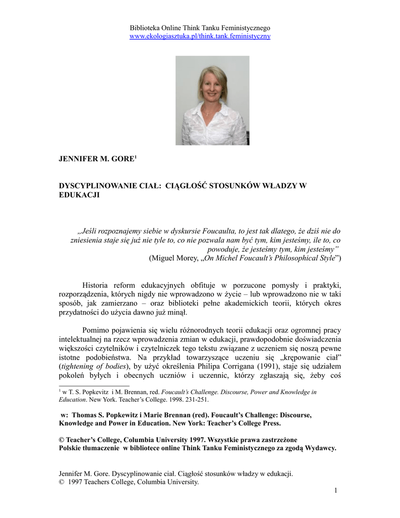 Biblioteka Online Think Tanku Feministycznego www.ekologiasztuka.pl/think.tank.feministyczny JENNIFER M. GORE1 DYSCYPLINOWANIE CIAŁ: CIĄGŁOŚĆ STOSUNKÓW WŁADZY W EDUKACJI „Jeśli rozpoznajemy siebie w dyskursie Foucaulta, to jest tak dlatego, że dziś nie do zniesienia staje się już nie tyle to, co nie pozwala nam być tym, kim jesteśmy, ile to, co powoduje, że jesteśmy tym, kim jesteśmy” (Miguel Morey, „On Michel Foucault’s Philosophical Style”) Historia reform edukacyjnych obfituje w porzucone pomysły i praktyki, rozporządzenia, których nigdy nie wprowadzono w życie – lub wprowadzono nie w taki sposób, jak zamierzano – oraz biblioteki pełne akademickich teorii, których okres przydatności do użycia dawno już minął. Pomimo pojawienia się wielu różnorodnych teorii edukacji oraz ogromnej pracy intelektualnej na rzecz wprowadzenia zmian w edukacji, prawdopodobnie doświadczenia większości czytelników i czytelniczek tego tekstu związane z uczeniem się noszą pewne istotne podobieństwa. Na przykład towarzyszące uczeniu się „krępowanie ciał” (tightening of bodies), by użyć określenia Philipa Corrigana (1991), staje się udziałem pokoleń byłych i obecnych uczniów i uczennic, którzy zgłaszają się, żeby coś 1 w T. S. Popkevitz i M. Brennan, red. Foucault’s Challenge. Discourse, Power and Knowledge in Education. New York. Teacher’s College. 1998. 231-251. w: Thomas S. Popkewitz i Marie Brennan (red). Foucault’s Challenge: Discourse, Knowledge and Power in Education. New York: Teacher’s College Press. © Teacher’s College, Columbia University 1997. Wszystkie prawa zastrzeżone Polskie tłumaczenie w bibliotece online Think Tanku Feministycznego za zgodą Wydawcy. Jennifer M. Gore. Dyscyplinowanie ciał. Ciągłość stosunków władzy w edukacji. © 1997 Teachers College, Columbia University. 1 Biblioteka Online Think Tanku Feministycznego www.ekologiasztuka.pl/think.tank.feministyczny powiedzieć, pytają o pozwolenie na wyjście z sali, odczuwają napięcie w czasie egzaminów, rozpromieniają się na najmniejszy znak aprobaty. O podobieństwie naszych doświadczeń uczenia się świadczy również to, że w wielu sytuacjach społecznych potrafimy szybko rozpoznać nauczycieli i uczniów, a także to, iż przyjmujemy te pozycje (lub przeciwstawiamy się im) w okresie dorosłości w tak różnorodnych sytuacjach uczenia się, jak nauka jazdy samochodem, dzielenie się przepisem na jakieś danie lub nabywanie wiedzy, jak być rodzicem. Wystarczy tylko przyjrzeć się zabawie małych dzieci w szkołę, aby dostrzec długowieczność pewnych praktyk uczenia się. Jestem przekonana, że owa widoczna ciągłość praktyki pedagogicznej w różnych miejscach i w różnym czasie związana jest ze stosunkami władzy – w obrębie instytucji i procesów edukacyjnych – które pozostają poza obrębem zainteresowania większości reform programów nauczania i innych reform. Badacze i badaczki edukacji, poza Bernsteinem (1975, 1990), Bourdieu i Passeronem (1977) oraz kilkorgiem innych, czerpiących inspirację z ich prac, nie zwracali większej uwagi na funkcjonowanie władzy w edukacji na poziomie mikro. W niniejszym rozdziale rozwijam badania nad stosunkami władzy w nauczaniu poprzez podjęcie dwóch konkretnych pytań: W jaki sposób stosunki władzy funkcjonują na mikropoziomie praktyk pedagogicznych? Do jakiego stopnia funkcjonowanie stosunków władzy jest wspólne dla różnych miejsc kształcenia? Argument, który formułuję w odpowiedzi na te pytania, wywodzi się z analityki władzy (analytics of power) zaproponowanej przez Michela Foucaulta oraz z moich własnych badań empirycznych, prowadzonych w czterech różnych miejscach kształcenia. Praca ta wypływa z mojego przekonania, że zakres praktyk i stosunków, mogących zaistnieć w klasie – bądź to w szkole, bądź na uniwersytecie; w klasie opartej na technokratycznej, krytycznej lub feministycznej filozofii – jest ograniczony. Analizując wcześniej dyskursy w obrębie krytycznej i feministycznej pedagogiki (Gore 1993) stwierdziłam, że konkretne praktyki edukacyjne, za którymi się w nich opowiadano, nie różniły się zbytnio od praktyk pedagogów głównego nurtu. Wyraziłam przypuszczenie, że instytucja kształcenia może wytwarzać własny „reżim pedagogiczny”: zespół stosunków władzy-wiedzy, dyskursów i praktyk, które ograniczają nawet najbardziej radykalne programy edukacyjne. Empiryczne badanie praktyki pedagogicznej wydawało się koniecznym krokiem naprzód w dążeniu do zrozumienia, a następnie przekształcenia dawno ugruntowanych praktyk instytucjonalnych. FOUCAULT O STOSUNKACH WŁADZY Ze względu na to, iż przedmiotem analityki władzy Foucaulta było działanie stosunków władzy na poziomie mikro, okazała się ona bardzo pomocna dla konceptualizacji niniejszego badania. Obwieściwszy, iż jest „szczęśliwym pozytywistą”, Foucault (2002) dążył do osadzenia swych pomysłów w zdarzeniach empirycznych. Jennifer M. Gore. Dyscyplinowanie ciał. Ciągłość stosunków władzy w edukacji. © 1997 Teachers College, Columbia University. 2 Biblioteka Online Think Tanku Feministycznego www.ekologiasztuka.pl/think.tank.feministyczny Dlatego też, ze względów metodologicznych i teoretycznych, zdecydowałam się na badanie praktyk pedagogicznych z Foucaultowskiej perspektywy władzy. Foucault (1998) twierdzi, że wraz z pojawieniem się nowoczesnych instytucji wyłoniła się „władza dyscyplinarna”, która następnie rozprzestrzeniła się na całe społeczeństwo, tak, że nie tylko w szkołach, szpitalach, więzieniach, fabrykach i innych instytucjach, ale również poza nimi można dostrzec trwałość stosunków władzy: „pewne wspólne signifié krąży od najmniejszego uchybienia po ostatnią ze zbrodni – nie jest już nim ani wina, ani naruszenie wspólnego dobra, lecz odstępstwo, anomalia; to ono nawied