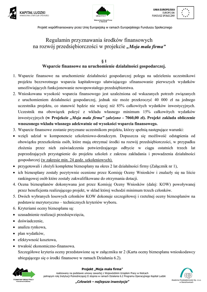 Projekt współfinansowany przez Unię Europejską w ramach Europejskiego Funduszu Społecznego Regulamin przyznawania środków finansowych na rozwój przedsiębiorczości w projekcie „Moja mała firma” §1 Wsparcie finansowe na uruchomienie działalności gospodarczej. 1. Wsparcie finansowe na uruchomienie działalności gospodarczej polega na udzieleniu uczestnikowi projektu bezzwrotnego wsparcia kapitałowego ułatwiającego sfinansowanie pierwszych wydatków umożliwiających funkcjonowanie nowopowstałego przedsiębiorstwa. 2. Wnioskowana wysokość wsparcia finansowego jest uzależniona od wskazanych potrzeb związanych z uruchomieniem działalności gospodarczej, jednak nie może przekroczyć 40 000 zł na jednego uczestnika projektu, co stanowić będzie nie więcej niż 85% całkowitych wydatków inwestycyjnych. Uczestnik ma obowiązek pokryć z wkładu własnego minimum 15% całkowitych wydatków inwestycyjnych (w Projekcie „Moja mała firma” założono - 7060,00 zł). Projekt zakłada obliczenie wnoszonego wkładu własnego adekwatnie od wysokości wsparcia finansowego. 3. Wsparcie finansowe zostanie przyznane uczestnikom projektu, którzy spełnią następujące warunki: wzięli udział w komponencie szkoleniowo-doradczym. Dopuszcza się możliwość odstąpienia od obowiązku przeszkolenia osób, które mają otrzymać środki na rozwój przedsiębiorczości, w przypadku złożenia przez nich zaświadczenia potwierdzającego odbycie w ciągu ostatnich trzech lat poprzedzających przystąpienie do projektu szkoleń z zakresu zakładania i prowadzenia działalności gospodarczej (w zakresie min. 24 godz. szkoleniowych). przygotowali i złożyli kompletne biznesplany na okres 2 lat działalności firmy (Załącznik nr 1), ich biznesplany zostały pozytywnie ocenione przez Komisję Oceny Wniosków i znalazły się na liście rankingowej osób które zostały zakwalifikowane do otrzymania dotacji. 4. Ocena biznesplanów dokonywana jest przez Komisję Oceny Wniosków (dalej: KOW) powoływanej przez beneficjenta realizującego projekt, w skład której wchodzi minimum trzech członków. 5. Dwóch wybranych losowych członków KOW dokonuje szczegółowej i rzetelnej oceny biznesplanów na podstawie merytoryczno – technicznych kryteriów wyboru. 6. Kryteriami oceny biznesplanu są: uzasadnienie realizacji przedsięwzięcia, doświadczenie, analiza rynkowa, plan wydatków, efektywność kosztowa, trwałość ekonomiczno-finansowa. Szczegółowe kryteria oceny przedstawione są w załączniku nr 2 (Karta oceny biznesplanu wnioskodawcy ubiegającego się o środki finansowe w ramach Działania 6.2). Projekt „Moja mała firma” realizowany na podstawie umowy zawartej z Wojewódzkim Urzędem Pracy w Kielcach pełniącym rolę Instytucji Pośredniczącej II stopnia w ramach Działania 6.2 Programu Operacyjnego Kapitał Ludzki „Człowiek – najlepsza inwestycja” Akademia Przedsiębiorczości Sp. z o.o. w Starachowicach 7. Końcowa ocena punktowa biznesplanu stanowi średnią arytmetyczną ocen dokonanych przez dwóch członków Komisji. 8. Ocena każdego oceniającego musi być liczbą całkowitą, nie może być ułamkiem np. 1,5; 2,75. 9. Minimalna liczba punktów kwalifikująca biznesplan do dofinansowania wynosi 60. 10. W przypadku, gdy biznes plan uzyskał od przynajmniej jednego z oceniających co najmniej 60 punktów oraz różnica w liczbie punktów przyznanych przez dwóch oceniających za spełnianie kryteriów merytoryczno - technicznych wynosi co najmniej 30 punktów, projekt poddawany jest dodatkowej ocenie, którą przeprowadza trzeci oceniający, wybrany w drodze losowania. Ocena dokonana przez trzeciego oceniającego jest oceną wiążącą. 11. Wsparcie finansowe na uruchomienie działalności gospodarczej zostanie przyznane 24 uczestnikom projektu [13 kobietom i 11 mężczyznom], których biznesplany zostaną najwyżej ocenione przez Komisję Oceny Wniosków. 12. W przypadku gdy łączna wartość wniosków rekomendowana do przyznania wsparcia finansowego będzie mniejsza niż posiadane środki, dopuszcza się możliwość przyznania dofinansowania większej liczbie uczestników. 13. O wynikach oceny biznesplanów (wraz z podaniem liczby uzyskanych punktów) dokonanych przez KOW uczestnik projektu zostanie poinformowany w formie pisemnej. 14. Uczestnik, którego biznesplan został odrzucony ma możliwość złożenia do Akademii Przedsiębiorczości w Biurze Projektu w Skarżysku-Kamiennej wniosku o ponowne rozpatrzenie biznesplanu, wraz z przedstawieniem dodatkowych wyjaśnień. 15. Wniosek o ponowne rozpatrzenie biznesplanu powinien zostać złożony przez uczestnika projektu w formie pisemnej w terminie 5 dni roboczych dni od daty informacji o odrzuceniu wniosku. 16. Beneficjent ma obowiązek dokonania powtórnej oceny biznesplanu w terminie 5 dni roboczych od dnia wpłynięcia wniosku w tej sprawie. Ocena powtórnie złożonego biznesplanu nie może być dokonywana przez te same osoby, które uczestniczyły w ocenie pierwotnej wersji dokumentu. 17. O wynikach powtórnej oceny biznesplanu uczestnik projektu zostanie poinformowany pisemnie. Powtórna ocena biznesplanu jest ocena wiążącą i ostateczną i nie podlega dalszej procedurze odwoławczej. 18. Ostateczne zamknięcie listy uczestników projektu kwalifikujących się do otrzymania dotacji możliwe jest po rozpatrzeniu wszystkich wniosków o ponowne rozpatrzenie biznesplanu, jednak nie później niż: - dla pierwszej edycji do końca listopada 2012 roku, - dla drugiej edycji do końca marca 2013 roku. 19. Po ostatecznym zamknięciu listy uczestników projektu kwalifikujących się do otrzymania wsparcia, osoby których biznesplan został pozytywnie oceniony przez KOW oraz zarekomendowany do realizacji, rejestrują działalność gospodarczą na terenie województwa świętokrzyskiego z wyłączeniem działalności o których mowa w § 4 ust. 1 i 2 Regulaminu Rekrutacji. 20. W terminie 21 dni od