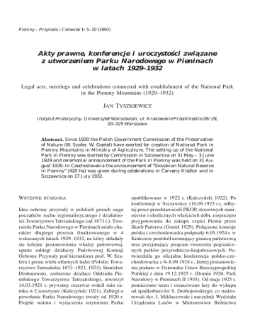 Pieniny – Przyroda i Człowiek 1: 5–10 (1992) Akty prawne, konferencje i uroczystości zwia˛zane z utworzeniem Parku Narodowego w Pieninach w latach 1929–1932 Legal acts, meetings and celebrations connected with establishment of the National Park in the Pieniny Mountains (1929–1932) JAN TYSZKIEWICZ Instytut Historyczny, Uniwersytet Warszawski, ul. Krakowskie Przedmieście 26/28, 00–325 Warszawa Abstract. Since 1920 the Polish Government Commission of the Preservation of Nature (W. Szafer, W. Goetel) have exerted for creation of National Park in Pieniny Mountains in Ministry of Agriculture. The setting up of the National Park in Pieniny was started by Commission in Szczawnica on 31 May – 3 June 1929 and ceremonial announcement of the Park in Pieniny was held on 31 August 1930. In Czechoslovakia the announcement of “Slovakian Natural Reserve in Pieniny” (420 ha) was given during celebrations in Červeny Kláštor and in Szczawnica on 17 July 1932. WSTE˛PNE STARANIA Idea ochrony przyrody w polskich górach sie˛ga pocza˛tków ruchu regionalistycznego i działalności Towarzystwa Tatrzańskiego (od 1873 r.). Tworzenie Parku Narodowego w Pieninach miało charakter długiego procesu finalizowanego w 4 wskazanych latach 1929–1932, na który składały sie˛ kolejne postanowienia władzy państwowej, uparte zabiegi działaczy Państwowej Komisji Ochrony Przyrody pod kierunkiem prof. W. Szafera i grona wielu ofiarnych ludzi (Polskie Towarzystwo Tatrzańskie 1873–1923, 1923). Stanisław Drohojowski, zasłużony działacz Oddziału Pienińskiego Towarzystwa Tatrzańskiego, utworzył 14.03.1921 r. prywatny rezerwat wokół ruin zamku w Czorsztynie (Kulczyński 1921). Zabiegi o powołanie Parku Narodowego trwały od 1920 r. Projekt statutu i wytyczenia terytorium Parku opublikowano w 1922 r. (Kulczyński 1922). Po konferencji w Szczawnicy (10.09.1923 r.), odbytej przez przedstawicieli PKOP, stosownych ministerstw i okolicznych właścicieli dóbr, rozpocze˛to przygotowania do zakupu cze˛ści Pienin przez Skarb Państwa (Goetel 1929). Poła˛czone komisje polska i czechosłowacka podpisały 6.05.1924 r. w Krakowie protokół normuja˛cy granice˛ państwowa˛ oraz przyjmuja˛cy program tworzenia pogranicznych parków przyrodniczo-krajobrazowych. Potwierdziła go oficjalna konferencja polsko-czechosłowacka z 6–8.09.1924 r., której postanowienia podano w Dzienniku Ustaw Rzeczypospolitej Polskiej z dnia 19.12.1925 r. (Domin 1926, Park Narodowy w Pieninach II 1935). Od maja 1925 r. pomierzono teren i oszacowano lasy do wykupu od spadkobierców S. Drohojowskiego, co nadzorowali dyr. J. Miklaszewski i naczelnik Wydziału Urza˛dzania Lasów w Ministerstwie Rolnictwa 6 J. Tyszkiewicz – Historia utworzenia PPN inż. W. Stankiewicz. Gotowy projekt Ministerstwo Skarbu odrzuciło (2.08.1926 r.). Zatwierdzenie kolejnego kosztorysu nasta˛piło po zreferowaniu sprawy przez W. Stankiewicza w Komitecie Ekonomicznym Rady Ministrów (8.11.1928 r.) i poparciu przez Ministra Spraw Zagranicznych A. Zaleskiego. W styczniu 1929 roku delegacja składaja˛ca sie˛ z: flisaków Piotra Salamona, Józefa Koterby i Tomasza Waradzyna, przedstawicieli PTT J.W. Czerwińskiego i B. Romaniszyna oraz członka PROP W. Goetla złożyła w Warszawie podzie˛kowanie w kilku ministerstwach (Goetel 1929). W marcu 1929 r. w Prokuraturze Generalnej podpisano akt kupna przez Skarb Państwa najcenniejszej cze˛ści Pienin – masywu Trzech Koron aż do Potoku Pienińskiego (385 ha). WYTYCZENIE TERYTORIUM PARKU Organizowanie Parku Pienińskiego rozpocze˛to od pracy komisji mieszanej, która w dniach 31.05– 3.06.1929 r. zwiedziła zakupiony obszar. Uczestniczyli w niej: W. Szafer, W. Goetel z PROP, W. Stankiewicz z Departamentu Leśnictwa w Ministerstwie Rolnictwa, W. Lewicki z Dyrekcji Lasów Państwowych we Lwowie, B. Romaniszyn z PTT, A. Czarnecki nadleśniczy ze Starego Sa˛cza i właściciel Krościenka Zygmunt Dziewolski. Wytyczono w terenie granice Parku, określono tok poste˛powania przy nabywaniu dalszych partii Pienin, podje˛to uchwały normuja˛ce organizacje˛ Parku i ruch turystyczny (Goetel 1929a, b). „Utworzenie Parku Narodowego Pienińskiego – napisał Goetel – odbyło sie˛ w atmosferze nie tylko życzliwości, ale radości z jaka˛ przyje˛ła utworzenie Parku ludność miejscowa”, rozumieja˛ca korzyści płyna˛ce z turystyki i trwałego zabezpieczenia przyrody Pienin. Mie˛dzynarodowa konferencja uczonych czechosłowackich, rumuńskich i polskich (13–14.12.1929 r.) w Krakowie omawiała potrzebe˛ tworzenia w Karpatach pogranicznych parków narodowych. Wiele uwagi poświe˛cono na niej Parkowi w Pieninach jako modelowemu rozwia˛zaniu (Compte Rendu du Congres... 1930). Chociaż powołanie do życia Parku Narodowego w Pieninach odbyło sie˛ praktycznie w maju 1929 r., niebezpiecznym progiem, który musiała przekroczyć wieloletnia akcja, był zakup od właściciela Krościenka Z. Dziewolskiego wschodniej cze˛ści Pienin (ok. 260 ha), grzbietu Sokolicy i Czertezia, od Pienińskiego Potoku po granice pól mieszkańców Krościenka i Szczawnicy. Park uzyskać miał też prawo połowu ryb w Dunajcu od Przełomu do ujścia Krośnicy. Oto po zatwierdzeniu transakcji przez Ministerstwo Rolnictwa (styczeń 1930 r.) Ministerstwo Skarbu, podobnie jak w 1926 r., odrzuciło wniosek (Szafer, Kulczyńska 1930). Wznowione starania PROP, które były „akcja˛ cie˛żka˛ i w niektórych chwilach zdało sie˛ beznadziejna˛” wobec deficytu finansowego państwa, doprowadziły jednak ponownie do wymaganej akceptacji 4 ministerstw. Wiosna˛ 1930 r. minister Skarbu J. Moraczewski dał wste˛pna˛ zgode˛. Dopiero w lipcu 1930 r. zapadła pomyślna decyzja, poparta przez ministra Spraw Wewne˛trznych I. Boernera. Zakup został sfinalizowany i Park uzyskał swój ostateczny kształt terytorialny. UROCZYSTE OTWARCIE PPN PROP oraz Polskie Towarzystwo Tatrzańskie urza˛dziły 31.08.1930 roku w Szczaw