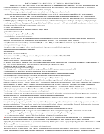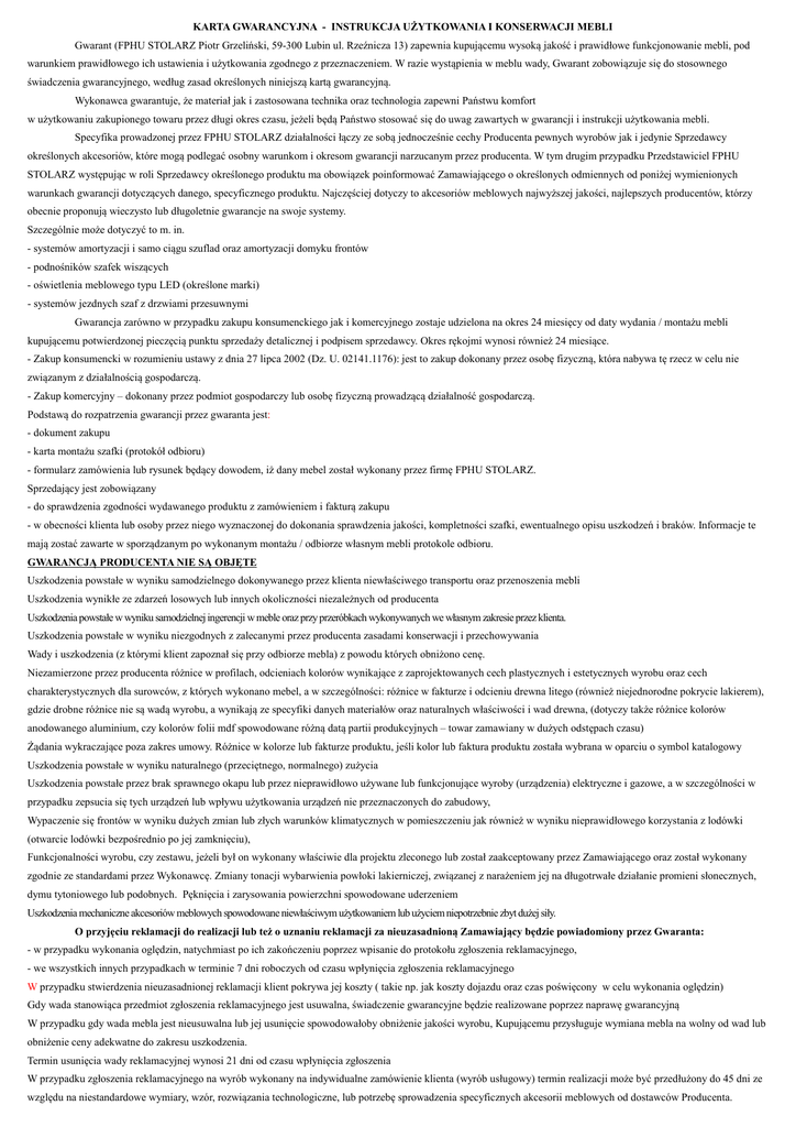 KARTA GWARANCYJNA - INSTRUKCJA UŻYTKOWANIA I KONSERWACJI MEBLI Gwarant (FPHU STOLARZ Piotr Grzeliński, 59-300 Lubin ul. Rzeźnicza 13) zapewnia kupującemu wysoką jakość i prawidłowe funkcjonowanie mebli, pod warunkiem prawidłowego ich ustawienia i użytkowania zgodnego z przeznaczeniem. W razie wystąpienia w meblu wady, Gwarant zobowiązuje się do stosownego świadczenia gwarancyjnego, według zasad określonych niniejszą kartą gwarancyjną. Wykonawca gwarantuje, że materiał jak i zastosowana technika oraz technologia zapewni Państwu komfort w użytkowaniu zakupionego towaru przez długi okres czasu, jeżeli będą Państwo stosować się do uwag zawartych w gwarancji i instrukcji użytkowania mebli. Specyfika prowadzonej przez FPHU STOLARZ działalności łączy ze sobą jednocześnie cechy Producenta pewnych wyrobów jak i jedynie Sprzedawcy określonych akcesoriów, które mogą podlegać osobny warunkom i okresom gwarancji narzucanym przez producenta. W tym drugim przypadku Przedstawiciel FPHU STOLARZ występując w roli Sprzedawcy określonego produktu ma obowiązek poinformować Zamawiającego o określonych odmiennych od poniżej wymienionych warunkach gwarancji dotyczących danego, specyficznego produktu. Najczęściej dotyczy to akcesoriów meblowych najwyższej jakości, najlepszych producentów, którzy obecnie proponują wieczysto lub długoletnie gwarancje na swoje systemy. Szczególnie może dotyczyć to m. in. - systemów amortyzacji i samo ciągu szuflad oraz amortyzacji domyku frontów - podnośników szafek wiszących - oświetlenia meblowego typu LED (określone marki) - systemów jezdnych szaf z drzwiami przesuwnymi Gwarancja zarówno w przypadku zakupu konsumenckiego jak i komercyjnego zostaje udzielona na okres 24 miesięcy od daty wydania / montażu mebli kupującemu potwierdzonej pieczęcią punktu sprzedaży detalicznej i podpisem sprzedawcy. Okres rękojmi wynosi również 24 miesiące. - Zakup konsumencki w rozumieniu ustawy z dnia 27 lipca 2002 (Dz. U. 02141.1176): jest to zakup dokonany przez osobę fizyczną, która nabywa tę rzecz w celu nie związanym z działalnością gospodarczą. - Zakup komercyjny – dokonany przez podmiot gospodarczy lub osobę fizyczną prowadzącą działalność gospodarczą. Podstawą do rozpatrzenia gwarancji przez gwaranta jest: - dokument zakupu - karta montażu szafki (protokół odbioru) - formularz zamówienia lub rysunek będący dowodem, iż dany mebel został wykonany przez firmę FPHU STOLARZ. Sprzedający jest zobowiązany - do sprawdzenia zgodności wydawanego produktu z zamówieniem i fakturą zakupu - w obecności klienta lub osoby przez niego wyznaczonej do dokonania sprawdzenia jakości, kompletności szafki, ewentualnego opisu uszkodzeń i braków. Informacje te mają zostać zawarte w sporządzanym po wykonanym montażu / odbiorze własnym mebli protokole odbioru. GWARANCJĄ PRODUCENTA NIE SĄ OBJĘTE Uszkodzenia powstałe w wyniku samodzielnego dokonywanego przez klienta niewłaściwego transportu oraz przenoszenia mebli Uszkodzenia wynikłe ze zdarzeń losowych lub innych okoliczności niezależnych od producenta Uszkodzenia powstałe w wyniku samodzielnej ingerencji w meble oraz przy przeróbkach wykonywanych we własnym zakresie przez klienta. Uszkodzenia powstałe w wyniku niezgodnych z zalecanymi przez producenta zasadami konserwacji i przechowywania Wady i uszkodzenia (z którymi klient zapoznał się przy odbiorze mebla) z powodu których obniżono cenę. Niezamierzone przez producenta różnice w profilach, odcieniach kolorów wynikające z zaprojektowanych cech plastycznych i estetycznych wyrobu oraz cech charakterystycznych dla surowców, z których wykonano mebel, a w szczególności: różnice w fakturze i odcieniu drewna litego (również niejednorodne pokrycie lakierem), gdzie drobne różnice nie są wadą wyrobu, a wynikają ze specyfiki danych materiałów oraz naturalnych właściwości i wad drewna, (dotyczy także różnice kolorów anodowanego aluminium, czy kolorów folii mdf spowodowane różną datą partii produkcyjnych – towar zamawiany w dużych odstępach czasu) Żądania wykraczające poza zakres umowy. Różnice w kolorze lub fakturze produktu, jeśli kolor lub faktura produktu została wybrana w oparciu o symbol katalogowy Uszkodzenia powstałe w wyniku naturalnego (przeciętnego, normalnego) zużycia Uszkodzenia powstałe przez brak sprawnego okapu lub przez nieprawidłowo używane lub funkcjonujące wyroby (urządzenia) elektryczne i gazowe, a w szczególności w przypadku zepsucia się tych urządzeń lub wpływu użytkowania urządzeń nie przeznaczonych do zabudowy, Wypaczenie się frontów w wyniku dużych zmian lub złych warunków klimatycznych w pomieszczeniu jak również w wyniku nieprawidłowego korzystania z lodówki (otwarcie lodówki bezpośrednio po jej zamknięciu), Funkcjonalności wyrobu, czy zestawu, jeżeli był on wykonany właściwie dla projektu zleconego lub został zaakceptowany przez Zamawiającego oraz został wykonany zgodnie ze standardami przez Wykonawcę. Zmiany tonacji wybarwienia powłoki lakierniczej, związanej z narażeniem jej na długotrwałe działanie promieni słonecznych, dymu tytoniowego lub podobnych. Pęknięcia i zarysowania powierzchni spowodowane uderzeniem Uszkodzenia mechaniczne akcesoriów meblowych spowodowane niewłaściwym użytkowaniem lub użyciem niepotrzebnie zbyt dużej siły. O przyjęciu reklamacji do realizacji lub też o uznaniu reklamacji za nieuzasadnioną Zamawiający będzie powiadomiony przez Gwaranta: - w przypadku wykonania oględzin, natychmiast po ich zakończeniu poprzez wpisanie do protokołu zgłoszenia reklamacyjnego, - we wszystkich innych przypadkach w terminie 7 dni roboczych od czasu wpłynięcia zgłoszenia reklamacyjnego W przypadku stwierdzenia nieuzasadnionej reklamacji klient pokrywa jej koszty ( takie np. jak koszty dojazdu oraz czas poświęcony w celu wykonania oględzin) Gd