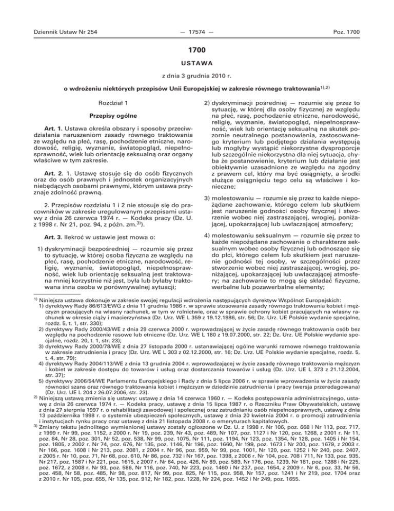 Dziennik Ustaw Nr 254 — 17574 — Poz. 1700 1700 USTA WA z dnia 3 grudnia 2010 r. o wdrożeniu niektórych przepisów Unii Europejskiej w zakresie równego traktowania1),2) Rozdział 1 Przepisy ogólne Art. 1. Ustawa określa obszary i sposoby przeciwdziałania naruszeniom zasady równego traktowania ze względu na płeć, rasę, pochodzenie etniczne, narodowość, religię, wyznanie, światopogląd, niepełnosprawność, wiek lub orientację seksualną oraz organy właściwe w tym zakresie. Art. 2. 1. Ustawę stosuje się do osób fizycznych oraz do osób prawnych i jednostek organizacyjnych niebędących osobami prawnymi, którym ustawa przyznaje zdolność prawną. 2. Przepisów rozdziału 1 i 2 nie stosuje się do pracowników w zakresie uregulowanym przepisami ustawy z dnia 26 czerwca 1974 r. — Kodeks pracy (Dz. U. z 1998 r. Nr 21, poz. 94, z późn. zm.3)). Art. 3. Ilekroć w ustawie jest mowa o: 1) dyskryminacji bezpośredniej — rozumie się przez to sytuację, w której osoba fizyczna ze względu na płeć, rasę, pochodzenie etniczne, narodowość, religię, wyznanie, światopogląd, niepełnosprawność, wiek lub orientację seksualną jest traktowana mniej korzystnie niż jest, była lub byłaby traktowana inna osoba w porównywalnej sytuacji; 1) 2) dyskryminacji pośredniej — rozumie się przez to sytuację, w której dla osoby fizycznej ze względu na płeć, rasę, pochodzenie etniczne, narodowość, religię, wyznanie, światopogląd, niepełnosprawność, wiek lub orientację seksualną na skutek pozornie neutralnego postanowienia, zastosowanego kryterium lub podjętego działania występują lub mogłyby wystąpić niekorzystne dysproporcje lub szczególnie niekorzystna dla niej sytuacja, chyba że postanowienie, kryterium lub działanie jest obiektywnie uzasadnione ze względu na zgodny z prawem cel, który ma być osiągnięty, a środki służące osiągnięciu tego celu są właściwe i konieczne; 3) molestowaniu — rozumie się przez to każde niepożądane zachowanie, którego celem lub skutkiem jest naruszenie godności osoby fizycznej i stworzenie wobec niej zastraszającej, wrogiej, poniżającej, upokarzającej lub uwłaczającej atmosfery; 4) molestowaniu seksualnym — rozumie się przez to każde niepożądane zachowanie o charakterze seksualnym wobec osoby fizycznej lub odnoszące się do płci, którego celem lub skutkiem jest naruszenie godności tej osoby, w szczególności przez stworzenie wobec niej zastraszającej, wrogiej, poniżającej, upokarzającej lub uwłaczającej atmosfery; na zachowanie to mogą się składać fizyczne, werbalne lub pozawerbalne elementy; Niniejsza ustawa dokonuje w zakresie swojej regulacji wdrożenia następujących dyrektyw Wspólnot Europejskich: 1) dyrektywy Rady 86/613/EWG z dnia 11 grudnia 1986 r. w sprawie stosowania zasady równego traktowania kobiet i mężczyzn pracujących na własny rachunek, w tym w rolnictwie, oraz w sprawie ochrony kobiet pracujących na własny rachunek w okresie ciąży i macierzyństwa (Dz. Urz. WE L 359 z 19.12.1986, str. 56; Dz. Urz. UE Polskie wydanie specjalne, rozdz. 5, t. 1, str. 330); 2) dyrektywy Rady 2000/43/WE z dnia 29 czerwca 2000 r. wprowadzającej w życie zasadę równego traktowania osób bez względu na pochodzenie rasowe lub etniczne (Dz. Urz. WE L 180 z 19.07.2000, str. 22; Dz. Urz. UE Polskie wydanie specjalne, rozdz. 20, t. 1, str. 23); 3) dyrektywy Rady 2000/78/WE z dnia 27 listopada 2000 r. ustanawiającej ogólne warunki ramowe równego traktowania w zakresie zatrudnienia i pracy (Dz. Urz. WE L 303 z 02.12.2000, str. 16; Dz. Urz. UE Polskie wydanie specjalne, rozdz. 5, t. 4, str. 79); 4) dyrektywy Rady 2004/113/WE z dnia 13 grudnia 2004 r. wprowadzającej w życie zasadę równego traktowania mężczyzn i kobiet w zakresie dostępu do towarów i usług oraz dostarczania towarów i usług (Dz. Urz. UE L 373 z 21.12.2004, str. 37); 5) dyrektywy 2006/54/WE Parlamentu Europejskiego i Rady z dnia 5 lipca 2006 r. w sprawie wprowadzenia w życie zasady równości szans oraz równego traktowania kobiet i mężczyzn w dziedzinie zatrudnienia i pracy (wersja przeredagowana) (Dz. Urz. UE L 204 z 26.07.2006, str. 23). 2) Niniejszą ustawą zmienia się ustawy: ustawę z dnia 14 czerwca 1960 r. — Kodeks postępowania administracyjnego, ustawę z dnia 26 czerwca 1974 r. — Kodeks pracy, ustawę z dnia 15 lipca 1987 r. o Rzeczniku Praw Obywatelskich, ustawę z dnia 27 sierpnia 1997 r. o rehabilitacji zawodowej i społecznej oraz zatrudnianiu osób niepełnosprawnych, ustawę z dnia 13 października 1998 r. o systemie ubezpieczeń społecznych, ustawę z dnia 20 kwietnia 2004 r. o promocji zatrudnienia i instytucjach rynku pracy oraz ustawę z dnia 21 listopada 2008 r. o emeryturach kapitałowych. 3) Zmiany tekstu jednolitego wymienionej ustawy zostały ogłoszone w Dz. U. z 1998 r. Nr 106, poz. 668 i Nr 113, poz. 717, z 1999 r. Nr 99, poz. 1152, z 2000 r. Nr 19, poz. 239, Nr 43, poz. 489, Nr 107, poz. 1127 i Nr 120, poz. 1268, z 2001 r. Nr 11, poz. 84, Nr 28, poz. 301, Nr 52, poz. 538, Nr 99, poz. 1075, Nr 111, poz. 1194, Nr 123, poz. 1354, Nr 128, poz. 1405 i Nr 154, poz. 1805, z 2002 r. Nr 74, poz. 676, Nr 135, poz. 1146, Nr 196, poz. 1660, Nr 199, poz. 1673 i Nr 200, poz. 1679, z 2003 r. Nr 166, poz. 1608 i Nr 213, poz. 2081, z 2004 r. Nr 96, poz. 959, Nr 99, poz. 1001, Nr 120, poz. 1252 i Nr 240, poz. 2407, z 2005 r. Nr 10, poz. 71, Nr 68, poz. 610, Nr 86, poz. 732 i Nr 167, poz. 1398, z 2006 r. Nr 104, poz. 708 i 711, Nr 133, poz. 935, Nr 217, poz. 1587 i Nr 221, poz. 1615, z 2007 r. Nr 64, poz. 426, Nr 89, poz. 589, Nr 176, poz. 1239, Nr 181, poz. 1288 i Nr 225, poz. 1672, z 2008 r. Nr 93, poz. 586, Nr 116, poz. 740, Nr 223, poz. 1460 i Nr 237, poz. 1654, z 2009 r. Nr 6, poz. 33, Nr 56, poz. 458, Nr 58, poz. 485, Nr 98, poz. 817, Nr 99, poz. 825, Nr 115, poz. 958, Nr 157, poz. 1241 i Nr 219, poz. 1704 oraz z 2010 r. Nr 105, poz. 655, Nr 135, poz. 912, Nr 182, poz