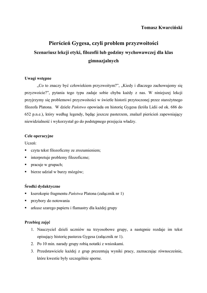 Tomasz Kwarciński Pierścień Gygesa, czyli problem przyzwoitości Scenariusz lekcji etyki, filozofii lub godziny wychowawczej dla klas gimnazjalnych Uwagi wstępne „Co to znaczy być człowiekiem przyzwoitym?”, „Kiedy i dlaczego zachowujemy się przyzwoicie?”, pytania tego typu zadaje sobie chyba każdy z nas. W niniejszej lekcji przyjrzymy się problemowi przyzwoitości w świetle historii przytoczonej przez starożytnego filozofa Platona. W dziele Państwo opowiada on historię Gygesa (króla Lidii od ok. 686 do 652 p.n.e.), który według legendy, będąc jeszcze pasterzem, znalazł pierścień zapewniający niewidzialność i wykorzystał go do podstępnego przejęcia władzy. Cele operacyjne Uczeń: czyta tekst filozoficzny ze zrozumieniem; interpretuje problemy filozoficzne; pracuje w grupach; bierze udział w burzy mózgów; Środki dydaktyczne kserokopie fragmentu Państwa Platona (załącznik nr 1) przybory do notowania arkusz szarego papieru i flamastry dla każdej grupy Przebieg zajęć 1. Nauczyciel dzieli uczniów na trzyosobowe grupy, a następnie rozdaje im tekst opisujący historię pasterza Gygesa (załącznik nr 1). 2. Po 10 min. narady grupy robią notatki z wnioskami. 3. Przedstawiciele każdej z grup prezentują wyniki pracy, zaznaczając równocześnie, które kwestie były szczególnie sporne. 2 4. Przedstawiciele grup zapisują najważniejsze wnioski na jednym dużym arkuszu papieru, który następnie zostaje zawieszony w widocznym miejscu klasy. 5. Obok arkusza papieru z wnioskami uczniów nauczyciel wiesza arkusz, zawierający pytania do dyskusji (załącznik nr 2), a następnie aranżuje burze mózgów. 6. Podsumowując burzę mózgów nauczyciel wraz z uczniami stara się zidentyfikować najważniejsze cechy człowieka przyzwoitego, ujawniające się zarówno w historii Gygesa, jak i dyskutowanych przykładach (załącznik nr 3). Praca domowa W drodze ze szkoły znalazłeś pierścień, który pozwala ci stać się niewidzialnym. Napisz, w jaki sposób wydarzenie to wpłynie na twoje życie. Załącznik nr 1 Historia pasterza Gygesa Przeczytaj uważnie poniższą opowieść o pasterzu Gygesie, która została zaczerpniętą z dzieła Platona pt. Państwo. Następnie ustosunkuj się do pytań zamieszczonych pod tekstem. Swoje stanowisko przedyskutuj z pozostałymi członkami grupy. Gyges był pasterzem i służył u ówczesnego króla Lidii. Kiedy spadł wielki deszcz i przyszło trzęsienie ziemi, pękła ziemia w pewnym miejscu i utworzyła się rozpadlina w tej okolicy, gdzie on pasał owce. On to zobaczył, zdziwił się, zszedł w jej głąb i ujrzał dziwne rzeczy, o których bajki opowiadają, a między innymi i konia z brązu, pustego wewnątrz, który miał drzwiczki. Gyges nachylił się przez nie do środka i zobaczył trupa, który się wydawał nadludzkiego wzrostu. Nie miał na sobie nic, tylko złoty pierścień na ręku. On ściągnął mu ten pierścień i wylazł stamtąd na górę. Kiedy pasterze odbywali swoje zebranie zwyczajne, jak co miesiąca, aby królowi donieść, co się dzieje z trzodami, przyszedł i on i miał pierścień ze sobą. Więc kiedy siedział pomiędzy innymi, obrócił przypadkiem nasadę kamienia ku sobie, ku wnętrzu dłoni. Kiedy się to stało, zrobił się niewidzialny dla siedzących przy nim; oni zaczęli rozmawiać tak, jakby go nie było. Zdziwił się i znowu namacawszy pierścień, obrócił nasadę kamienia na zewnątrz. Jak tylko ją obrócił, zrobił się widzialny. Zauważywszy to zaczął doświadczać swego pierścienia, czyby miał taką siłę i czyby mu się udawało, obracając nasadę kamienia ku 3 środkowi, stawać się niewidzialnym, a jeśli na zewnątrz – widzialnym. Stwierdziwszy to, natychmiast się postarał, żeby go wśród posłańców wyprawiono do króla. Poszedł tam, żonę królowi uwiódł i razem z nią zamachu na króla dokonał. Zabił go i tron po nim objął. Platon, Państwo, przeł. W. Witwicki, ks. 2, Wyd. Antyk, Kęty 2003, s. 52. 1) W jaki sposób odnalezienie pierścienia wpłynęło na zachowanie Gygesa? 2) Czy Gyges mógł znaleźć alternatywne, w stosunku do użycia pierścienia, sposoby przejęcia tronu? Jakie miał ewentualne możliwości? 3) Czy Gyges musiałby włożyć więcej wysiłku w realizację swojego celu, czyli przejęcia tronu, gdyby nie znalazł pierścienia? Dlaczego tak lub dlaczego nie? 4) Czy Gyges używając pierścienia zachował się przyzwoicie? Dlaczego tak lub dlaczego nie? 5) Czy przyzwoitość lub brak przyzwoitości, dotycząca zachowania Gygasa jest zależna od użycia pierścienia? Załącznik nr 2 Problemy do dyskusji 1. Która z poniższych sytuacji zawiera analogiczny problem do przedstawionego w opowieści o pierścieniu Gygesa: (a) nagrodzenie wolontariusza organizacji charytatywnej niosącej pomoc osobom zarażonym wirusem HIV, (b) skazanie złodzieja przyłapanego na gorącym uczynku, (c) dokonanie przez internetowego hakera włamania do zastrzeżonej bazy danych? 2. Która z osób, wymienionych w poprzednim pytaniu (wolontariusz, złodziej, haker), zachowała się przyzwoicie i dlaczego? Możliwe odpowiedzi: Opcja (c) stanowi najbardziej poprawną odpowiedź na pytanie 1. Haker w Internecie pozostaje anonimowy podobnie jak Gyges, posiadający pierścień. Haker dokonuje przestępstwa w przekonaniu, że jest „niewidzialny”. Czyn złodzieja zostaje natomiast zauważony, złapano go na gorącym uczynku, i ponosi za to zasłużoną karę. Wolontariusz z 4 kolei postępuje przyzwoicie, inni ludzie to doceniają i za swoją działalność zostaje przez nich nagrodzony. Załącznik nr 3 Charakterystyka człowieka przyzwoitego 1) Postępuje dobrze bez względu na to, czy jego działania są jawne lub mogą zostać ujawnione. 2) Pozostaje sobą nawet wówczas, gdy działa anonimowo. 3) Osiąga sukces za pomocą godziwych środków. Nie stara się dążyć do celu za wszelką cenę. 4) Osiąga sukces dzięki własnemu wys