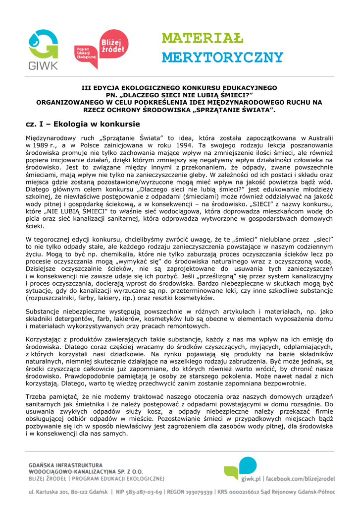 MATERIAŁ MERYTORYCZNY III EDYCJA EKOLOGICZNEGO KONKURSU EDUKACYJNEGO PN. „DLACZEGO SIECI NIE LUBIĄ ŚMIECI?” ORGANIZOWANEGO W CELU PODKREŚLENIA IDEI MIĘDZYNARODOWEGO RUCHU NA RZECZ OCHRONY ŚRODOWISKA „SPRZĄTANIE ŚWIATA”. cz. I – Ekologia w konkursie Międzynarodowy ruch „Sprzątanie Świata” to idea, która została zapoczątkowana w Australii w 1989 r., a w Polsce zainicjowana w roku 1994. Ta swojego rodzaju lekcja poszanowania środowiska promuje nie tylko zachowania mające wpływ na zmniejszenie ilości śmieci, ale również popiera inicjowanie działań, dzięki którym zmniejszy się negatywny wpływ działalności człowieka na środowisko. Jest to związane między innymi z przekonaniem, że odpady, zwane powszechnie śmieciami, mają wpływ nie tylko na zanieczyszczenie gleby. W zależności od ich postaci i składu oraz miejsca gdzie zostaną pozostawione/wyrzucone mogą mieć wpływ na jakość powietrza bądź wód. Dlatego głównym celem konkursu „Dlaczego sieci nie lubią śmieci?” jest edukowanie młodzieży szkolnej, że niewłaściwe postępowanie z odpadami (śmieciami) może również oddziaływać na jakość wody pitnej i gospodarkę ściekową, a w konsekwencji – na środowisko. „SIECI” z nazwy konkursu, które „NIE LUBIĄ ŚMIECI” to właśnie sieć wodociągowa, która doprowadza mieszkańcom wodę do picia oraz sieć kanalizacji sanitarnej, która odprowadza wytworzone w gospodarstwach domowych ścieki. W tegorocznej edycji konkursu, chcielibyśmy zwrócić uwagę, że te „śmieci” nielubiane przez „sieci” to nie tylko odpady stałe, ale każdego rodzaju zanieczyszczenia powstające w naszym codziennym życiu. Mogą to być np. chemikalia, które nie tylko zaburzają proces oczyszczania ścieków lecz po procesie oczyszczania mogą „wymykać się” do środowiska naturalnego wraz z oczyszczoną wodą. Dzisiejsze oczyszczalnie ścieków, nie są zaprojektowane do usuwania tych zanieczyszczeń i w konsekwencji nie zawsze udaje się ich pozbyć. Jeśli „prześlizgną” się przez system kanalizacyjny i proces oczyszczania, docierają wprost do środowiska. Bardzo niebezpieczne w skutkach mogą być sytuacje, gdy do kanalizacji wyrzucane są np. przeterminowane leki, czy inne szkodliwe substancje (rozpuszczalniki, farby, lakiery, itp.) oraz resztki kosmetyków. Substancje niebezpieczne występują powszechnie w różnych artykułach i materiałach, np. jako składniki detergentów, farb, lakierów, kosmetyków lub są obecne w elementach wyposażenia domu i materiałach wykorzystywanych przy pracach remontowych. Korzystając z produktów zawierających takie substancje, każdy z nas ma wpływ na ich emisję do środowiska. Dlatego coraz częściej wracamy do środków czyszczących, myjących, odplamiających, z których korzystali nasi dziadkowie. Na rynku pojawiają się produkty na bazie składników naturalnych, niemniej skutecznie działające na wszelkiego rodzaju zabrudzenia. Być może jednak, są środki czyszczące całkowicie już zapomniane, do których również warto wrócić, by chronić nasze środowisko. Prawdopodobnie pamiętają je osoby ze starszego pokolenia. Może nawet nadal z nich korzystają. Dlatego, warto tę wiedzę przechwycić zanim zostanie zapomniana bezpowrotnie. Trzeba pamiętać, że nie możemy traktować naszego otoczenia oraz naszych domowych urządzeń sanitarnych jak śmietnika i że należy postępować z odpadami powstającymi w domu rozsądnie. Do usuwania zwykłych odpadów służy kosz, a odpady niebezpieczne należy przekazać firmie obsługującej odbiór odpadów w mieście. Pozostawianie śmieci w przypadkowych miejscach bądź pozbywanie się ich w sposób niewłaściwy jest zagrożeniem dla zasobów wody pitnej, dla środowiska i w konsekwencji dla nas samych. MATERIAŁ MERYTORYCZNY III EDYCJA EKOLOGICZNEGO KONKURSU EDUKACYJNEGO PN. „DLACZEGO SIECI NIE LUBIĄ ŚMIECI?” ORGANIZOWANEGO W CELU PODKREŚLENIA IDEI MIĘDZYNARODOWEGO RUCHU NA RZECZ OCHRONY ŚRODOWISKA „SPRZĄTANIE ŚWIATA”. cz. II – Jak przeprowadzić dobry wywiad? 1. Przygotuj wcześniej listę pytań, które chcesz zadać rozmówcy, ale nie trzymaj się ich kurczowo. 2. Zdobądź kluczowe informacje o rozmówcy i wiedzę o temacie, na który macie zamiar rozmawiać. Wykorzystuj tę wiedzę w trakcie rozmowy. (np. przypomnij sobie ile lat ma twoja babcia/dziadek? w jakich czasach się urodził/urodziła? dorastał/dorastała? zaczął/zaczęła prowadzić gospodarstwo domowe?; jak wyglądało wtedy życie?; co było dostępne, a co nie? itd.). 3. Pozwól rozmowie toczyć się w swobodny naturalny sposób. Pozwól rozmówcy wypowiedzieć się nawet w kwestiach, których wcześniej nie zaplanowałeś/nie zaplanowałaś. Staraj się płynnie wracać do tematów (pytań) z twojej listy. 4. Nawiązuj do poprzednich wypowiedzi rozmówcy. Nie urywaj zagadnień, tylko płynnie przechodź z jednego do drugiego. 5. Zadawaj pytania otwarte, czyli takie, na które nie można odpowiedzieć krótko: „tak” lub „nie”. Przykłady pytań otwartych: Jak wyobrażasz sobie …? W jaki sposób..? Co zwykle robisz, aby.. ? Jak wyglądał kiedyś ...? 6. Staraj się, aby pytania nie były zbyt długie, zawiłe i skomplikowane (aby nie dotyczyły kilku zagadnień na raz). Złe pytanie: Czy twoim zdaniem kiedyś gospodynie domowe lepiej radziły sobie z tym problemem a może miały jakiś złoty sposób na takie sytuacje? Jeśli tak, jaki to był sposób? 7. Unikaj pytań zawierających sugestię (podpowiadających odpowiedź). Złe pytanie: Czy dla ciebie, tak jak dla wielu innych gospodyń najlepszym środkiem do czyszczenia było szare mydło? 8. Zachęcaj rozmówcę, by się rozgadał. By opowiedział Ci jakąś ciekawą historię, anegdotę, która ubarwi twój wywiad. Prowokuj rozmówcę do zwierzeń i wyrażania opinii. Rób to jednak w sposób nienachalny i grzeczny. 9. Szanuj opinie i poglądy rozmówcy, 