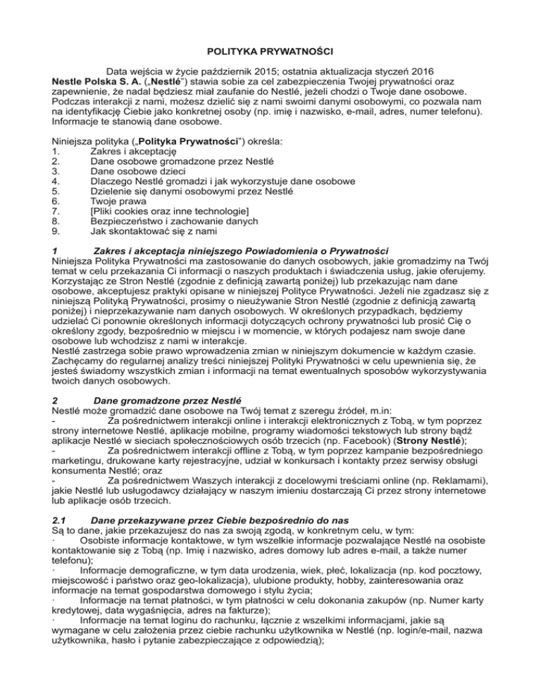 POLITYKA PRYWATNOŚCI Data wejścia w życie październik 2015; ostatnia aktualizacja styczeń 2016 Nestle Polska S. A. („Nestlé”) stawia sobie za cel zabezpieczenia Twojej prywatności oraz zapewnienie, że nadal będziesz miał zaufanie do Nestlé, jeżeli chodzi o Twoje dane osobowe. Podczas interakcji z nami, możesz dzielić się z nami swoimi danymi osobowymi, co pozwala nam na identyfikację Ciebie jako konkretnej osoby (np. imię i nazwisko, e-mail, adres, numer telefonu). Informacje te stanowią dane osobowe. Niniejsza polityka („Polityka Prywatności”) określa: 1. Zakres i akceptację 2. Dane osobowe gromadzone przez Nestlé 3. Dane osobowe dzieci 4. Dlaczego Nestlé gromadzi i jak wykorzystuje dane osobowe 5. Dzielenie się danymi osobowymi przez Nestlé 6. Twoje prawa 7. [Pliki cookies oraz inne technologie] 8. Bezpieczeństwo i zachowanie danych 9. Jak skontaktować się z nami 1 Zakres i akceptacja niniejszego Powiadomienia o Prywatności Niniejsza Polityka Prywatności ma zastosowanie do danych osobowych, jakie gromadzimy na Twój temat w celu przekazania Ci informacji o naszych produktach i świadczenia usług, jakie oferujemy. Korzystając ze Stron Nestlé (zgodnie z definicją zawartą poniżej) lub przekazując nam dane osobowe, akceptujesz praktyki opisane w niniejszej Polityce Prywatności. Jeżeli nie zgadzasz się z niniejszą Polityką Prywatności, prosimy o nieużywanie Stron Nestlé (zgodnie z definicją zawartą poniżej) i nieprzekazywanie nam danych osobowych. W określonych przypadkach, będziemy udzielać Ci ponownie określonych informacji dotyczących ochrony prywatności lub prosić Cię o określony zgody, bezpośrednio w miejscu i w momencie, w których podajesz nam swoje dane osobowe lub wchodzisz z nami w interakcje. Nestlé zastrzega sobie prawo wprowadzenia zmian w niniejszym dokumencie w każdym czasie. Zachęcamy do regularnej analizy treści niniejszej Polityki Prywatności w celu upewnienia się, że jesteś świadomy wszystkich zmian i informacji na temat ewentualnych sposobów wykorzystywania twoich danych osobowych. 2 Dane gromadzone przez Nestlé Nestlé może gromadzić dane osobowe na Twój temat z szeregu źródeł, m.in: Za pośrednictwem interakcji online i interakcji elektronicznych z Tobą, w tym poprzez strony internetowe Nestlé, aplikacje mobilne, programy wiadomości tekstowych lub strony bądź aplikacje Nestlé w sieciach społecznościowych osób trzecich (np. Facebook) (Strony Nestlé); Za pośrednictwem interakcji offline z Tobą, w tym poprzez kampanie bezpośredniego marketingu, drukowane karty rejestracyjne, udział w konkursach i kontakty przez serwisy obsługi konsumenta Nestlé; oraz Za pośrednictwem Waszych interakcji z docelowymi treściami online (np. Reklamami), jakie Nestlé lub usługodawcy działający w naszym imieniu dostarczają Ci przez strony internetowe lub aplikacje osób trzecich. 2.1 Dane przekazywane przez Ciebie bezpośrednio do nas Są to dane, jakie przekazujesz do nas za swoją zgodą, w konkretnym celu, w tym: · Osobiste informacje kontaktowe, w tym wszelkie informacje pozwalające Nestlé na osobiste kontaktowanie się z Tobą (np. Imię i nazwisko, adres domowy lub adres e-mail, a także numer telefonu); · Informacje demograficzne, w tym data urodzenia, wiek, płeć, lokalizacja (np. kod pocztowy, miejscowość i państwo oraz geo-lokalizacja), ulubione produkty, hobby, zainteresowania oraz informacje na temat gospodarstwa domowego i stylu życia; · Informacje na temat płatności, w tym płatności w celu dokonania zakupów (np. Numer karty kredytowej, data wygaśnięcia, adres na fakturze); · Informacje na temat loginu do rachunku, łącznie z wszelkimi informacjami, jakie są wymagane w celu założenia przez ciebie rachunku użytkownika w Nestlé (np. login/e-mail, nazwa użytkownika, hasło i pytanie zabezpieczające z odpowiedzią); · Informacje zwrotne od konsumenta, łącznie z informacjami, jakimi dzielisz się z Nestlé na temat swoich doświadczeń korzystania z produktów i usług Nestlé (np. Twoje komentarze i sugestie, preferencje oraz inne informacje zwrotne dotyczące produktów Nestlé); oraz · Treści generowane przez konsumenta, łącznie z wszelkimi treściami (np. zdjęcia, filmy i osobiste historie), jakie tworzysz, a następnie udostępniasz Nestlé (i być może również innym) umieszczając je na Stronie Nestlé. 2.2 Dane gromadzone przez nas podczas twoich interakcji ze Stronami Nestlé Wykorzystujemy pliki cookies oraz inne technologie śledzenia, które gromadzą pewnego rodzaju informacje, podczas Twojej interakcji ze Stronami Nestlé. Zapoznaj się z nasza Polityką Cookies w celu uzyskania informacji na temat tych technologii oraz Twoich praw z nimi związanych. – https:// www.zyjsmacznieizdrowo.pl/wp-content/uploads/polityka_dotyczaca_cookies.pdf 2.3 Dane gromadzone z innych źródeł Możemy gromadzić informacje na Twój temat z innych zgodnych z prawem źródeł, w celu przekazywania Ci informacji o naszych produktach i świadczenia usług. Źródła takie obejmują np. urządzenia osób trzecich służące do gromadzenia danych, partnerów promocyjnych Nestlé, źródła publiczne i strony portali społecznościowych osób trzecich. Informacje te mogą obejmować: · osobiste dane kontaktowe; oraz · wszelkie dane osobowe stanowiące element twojego profilu na stronach portali społecznościowych osób trzecich (np. Facebook), jakie pozwalasz danemu portalowi społecznościowemu nam udostępniać (np. imię i nazwisko, adres e-mail, płeć, datę urodzin, miejscowość, zdjęcie profilowe, nr identyfikacyjny użytkownika,). Możesz dowiedzieć się więcej na temat danych, jakie możemy uzyskać na Twój temat odwiedzając odpowiednie strony na portalach społecznościowych osób trzecich. Możemy również pozyskiwać dane osobowe o poszczególnych osobach, kiedy nabywamy inne spółki. 3 Dane osobowe dzieci Nestlé świadomie nie pozysk