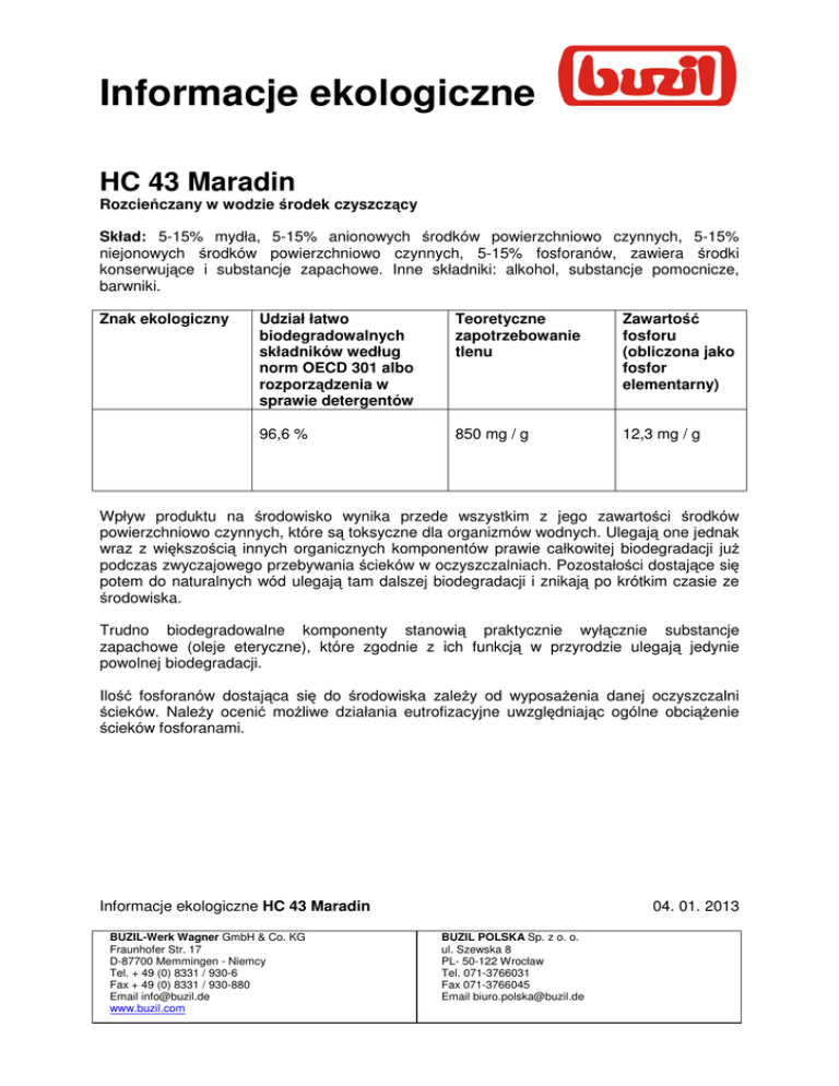 Informacje ekologiczne HC 43 Maradin Rozcieńczany w wodzie środek czyszczący Skład: 5-15% mydła, 5-15% anionowych środków powierzchniowo czynnych, 5-15% niejonowych środków powierzchniowo czynnych, 5-15% fosforanów, zawiera środki konserwujące i substancje zapachowe. Inne składniki: alkohol, substancje pomocnicze, barwniki. Znak ekologiczny Udział łatwo biodegradowalnych składników według norm OECD 301 albo rozporządzenia w sprawie detergentów Teoretyczne zapotrzebowanie tlenu Zawartość fosforu (obliczona jako fosfor elementarny) 96,6 % 850 mg / g 12,3 mg / g Wpływ produktu na środowisko wynika przede wszystkim z jego zawartości środków powierzchniowo czynnych, które są toksyczne dla organizmów wodnych. Ulegają one jednak wraz z większością innych organicznych komponentów prawie całkowitej biodegradacji juŜ podczas zwyczajowego przebywania ścieków w oczyszczalniach. Pozostałości dostające się potem do naturalnych wód ulegają tam dalszej biodegradacji i znikają po krótkim czasie ze środowiska. Trudno biodegradowalne komponenty stanowią praktycznie wyłącznie substancje zapachowe (oleje eteryczne), które zgodnie z ich funkcją w przyrodzie ulegają jedynie powolnej biodegradacji. Ilość fosforanów dostająca się do środowiska zaleŜy od wyposaŜenia danej oczyszczalni ścieków. NaleŜy ocenić moŜliwe działania eutrofizacyjne uwzględniając ogólne obciąŜenie ścieków fosforanami. Informacje ekologiczne HC 43 Maradin BUZIL-Werk Wagner GmbH & Co. KG Fraunhofer Str. 17 D-87700 Memmingen - Niemcy Tel. + 49 (0) 8331 / 930-6 Fax + 49 (0) 8331 / 930-880 Email [email protected] www.buzil.com 04. 01. 2013 BUZIL POLSKA Sp. z o. o. ul. Szewska 8 PL- 50-122 Wrocław Tel. 071-3766031 Fax 071-3766045 Email [email protected]